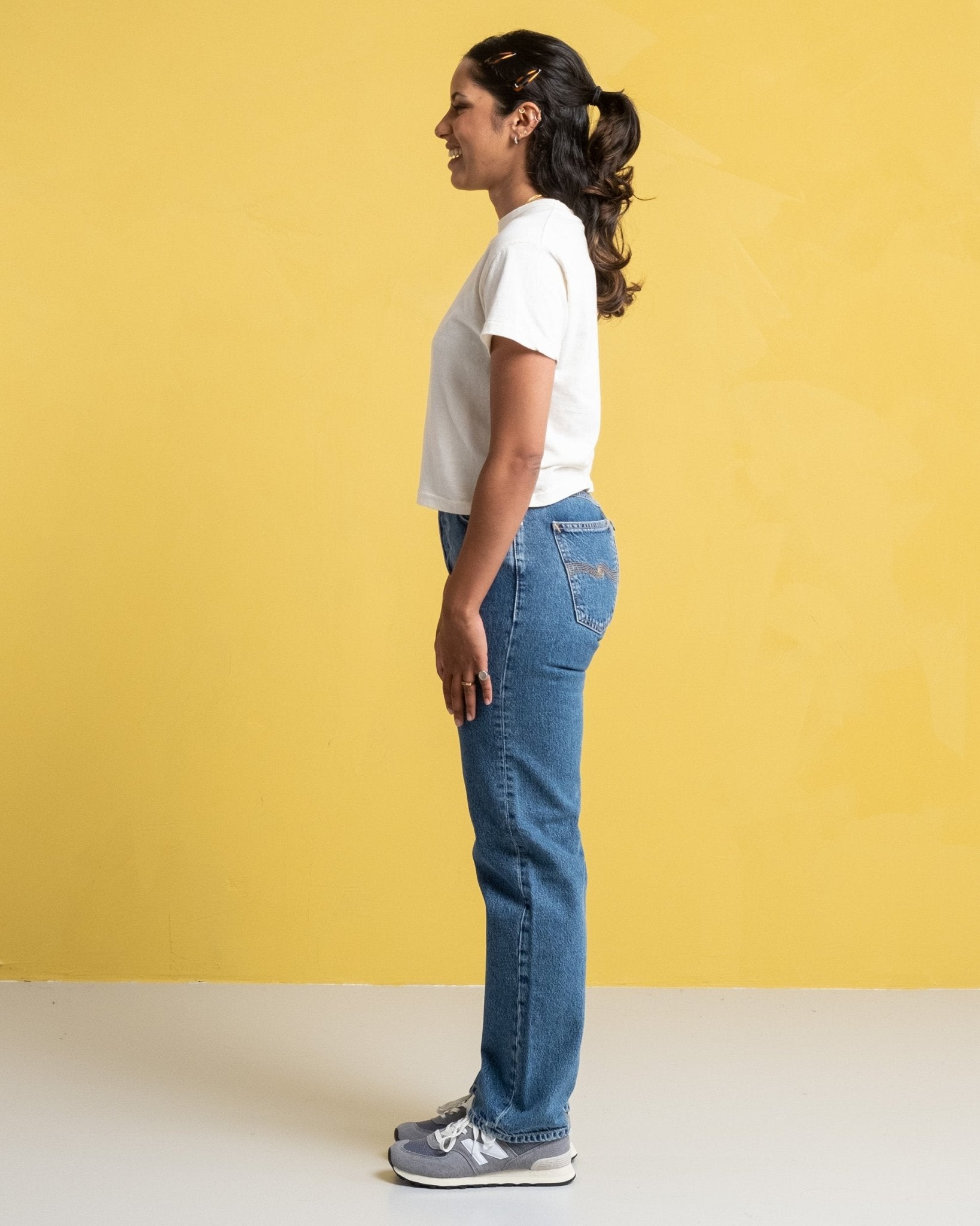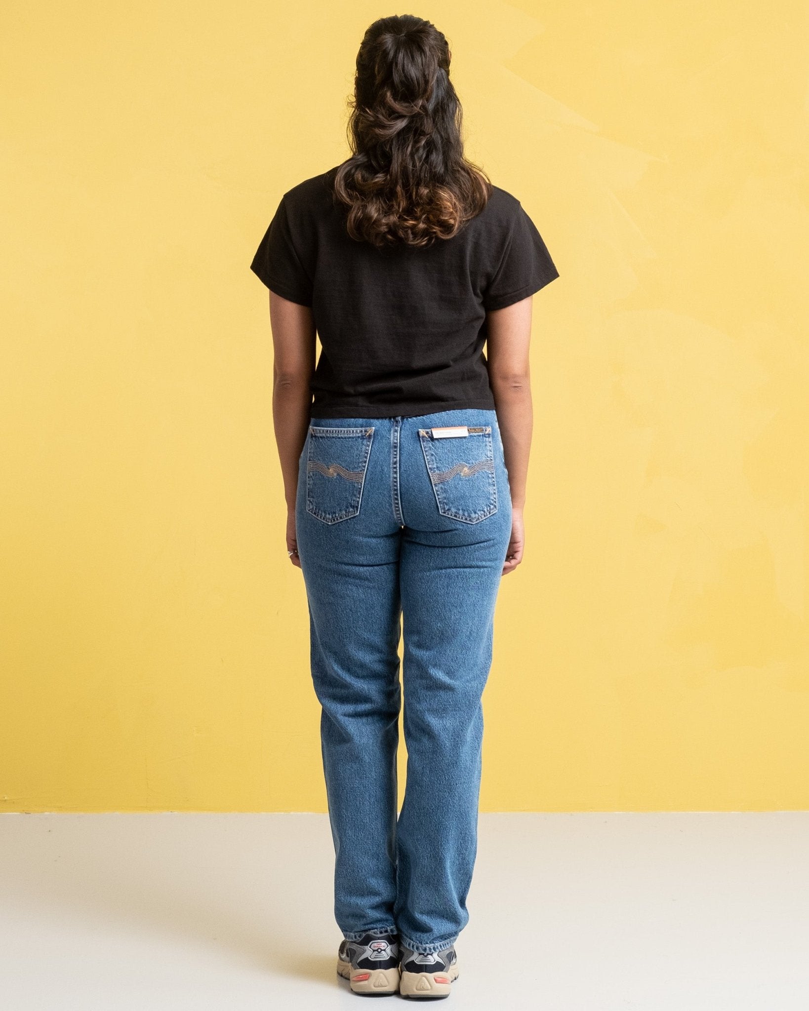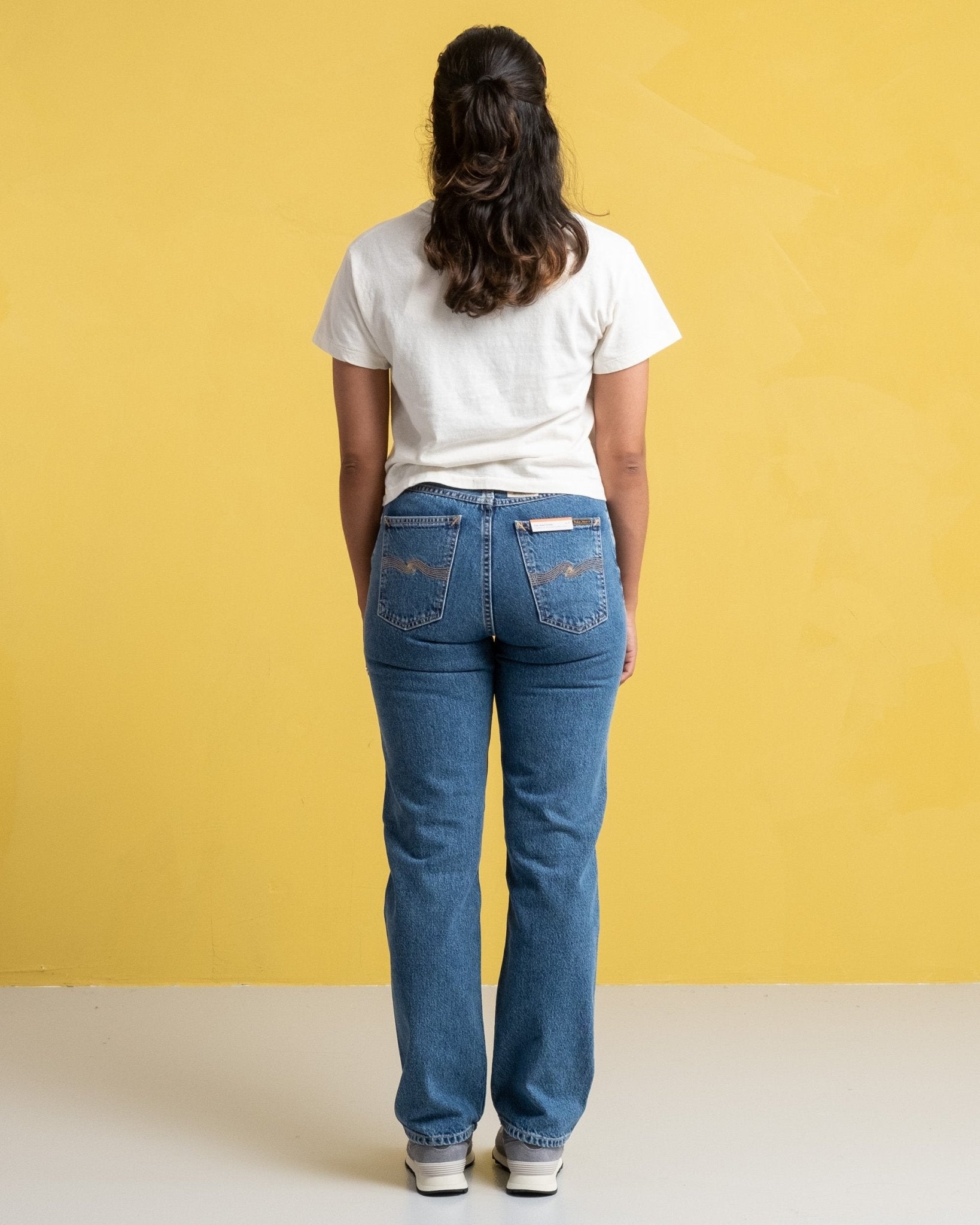 Lofty Lo Wavy Blues di Nudie Jeans Co. Jeans da donna dal taglio rilassato con vita alta e gambe dritte. Qui in un delizioso lavaggio blu ondulato con un sottile aspetto consumato. Realizzati in denim riciclato pre-consumo. Prodotto in Tunisia.