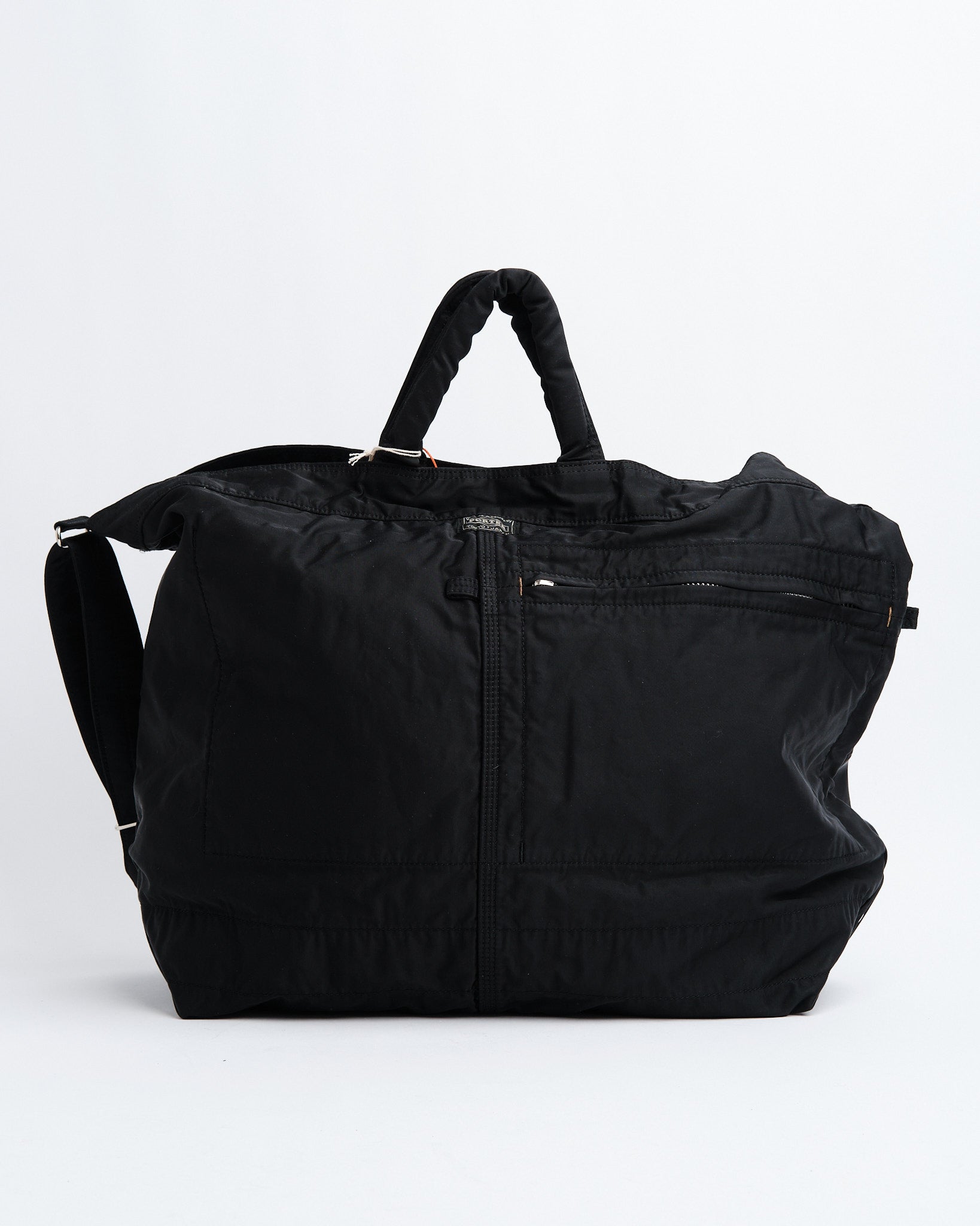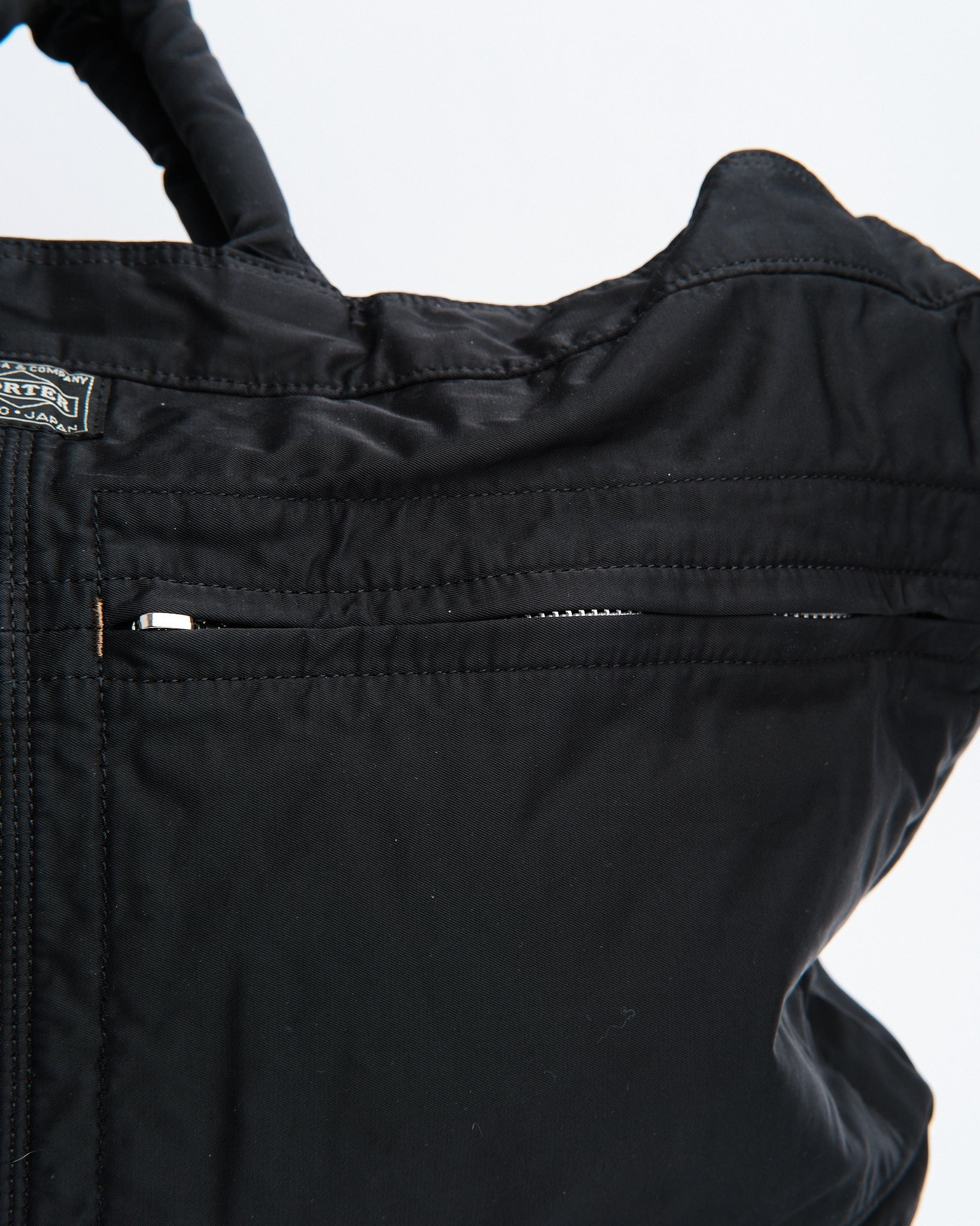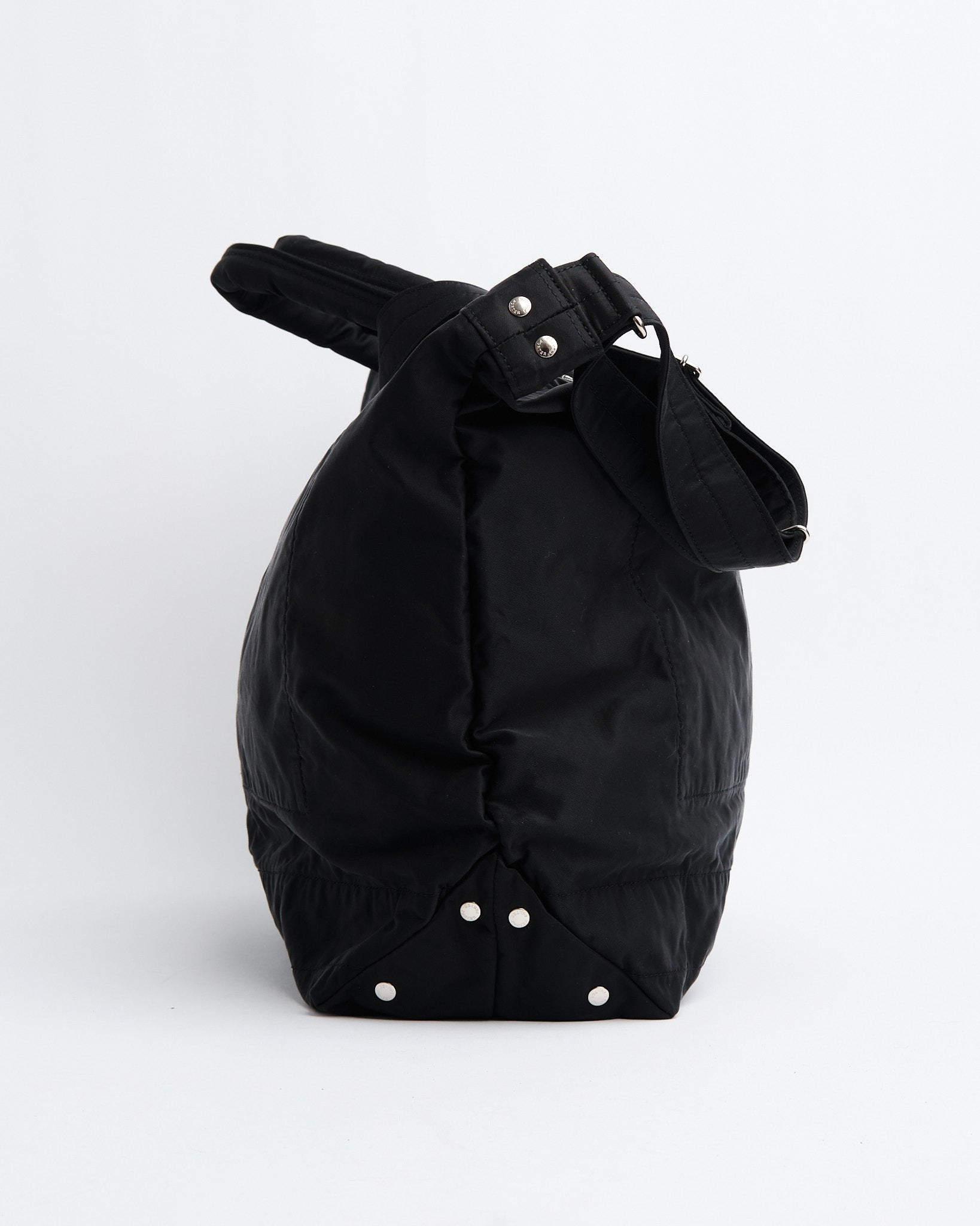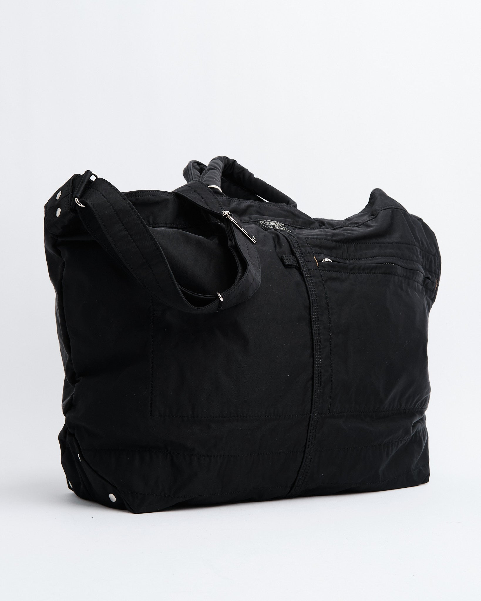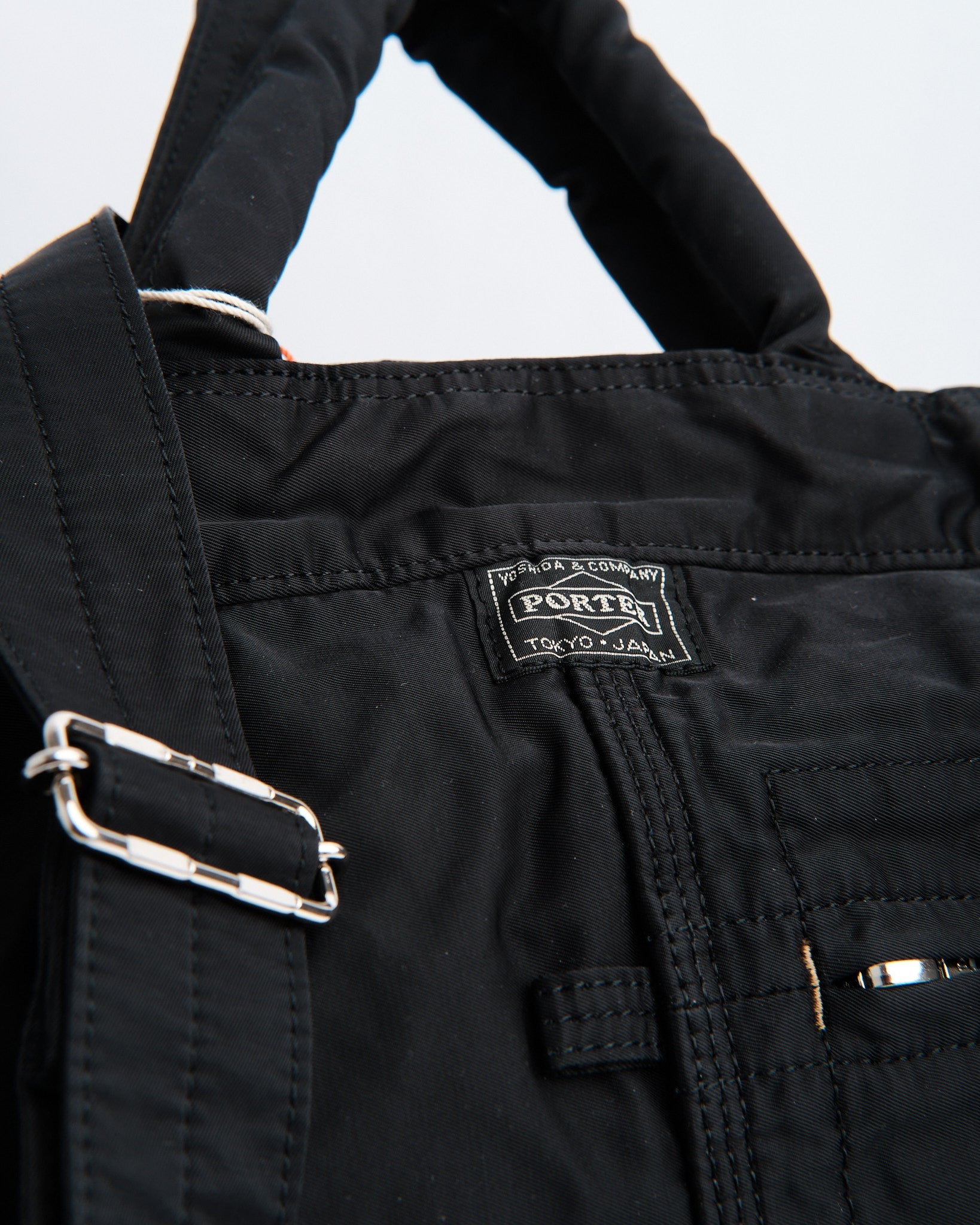 La PORTER by Yoshida MILE 2WAY TOTE BAG (L) in Nero è una borsa tote versatile ed elegante ispirata alle borse per attrezzi americane e ai grembiuli da lavoro degli anni '40 e '50. Realizzata in twill di nylon-cotone lucido, questa borsa bilancia durabilità con un'estetica sofisticata. Un particolare processo di lavaggio conferisce al materiale una sensazione morbida e leggera, mentre accessori metallici nichelati lucidi aggiungono un tocco raffinato che la distingue dalle borse da lavoro standard.