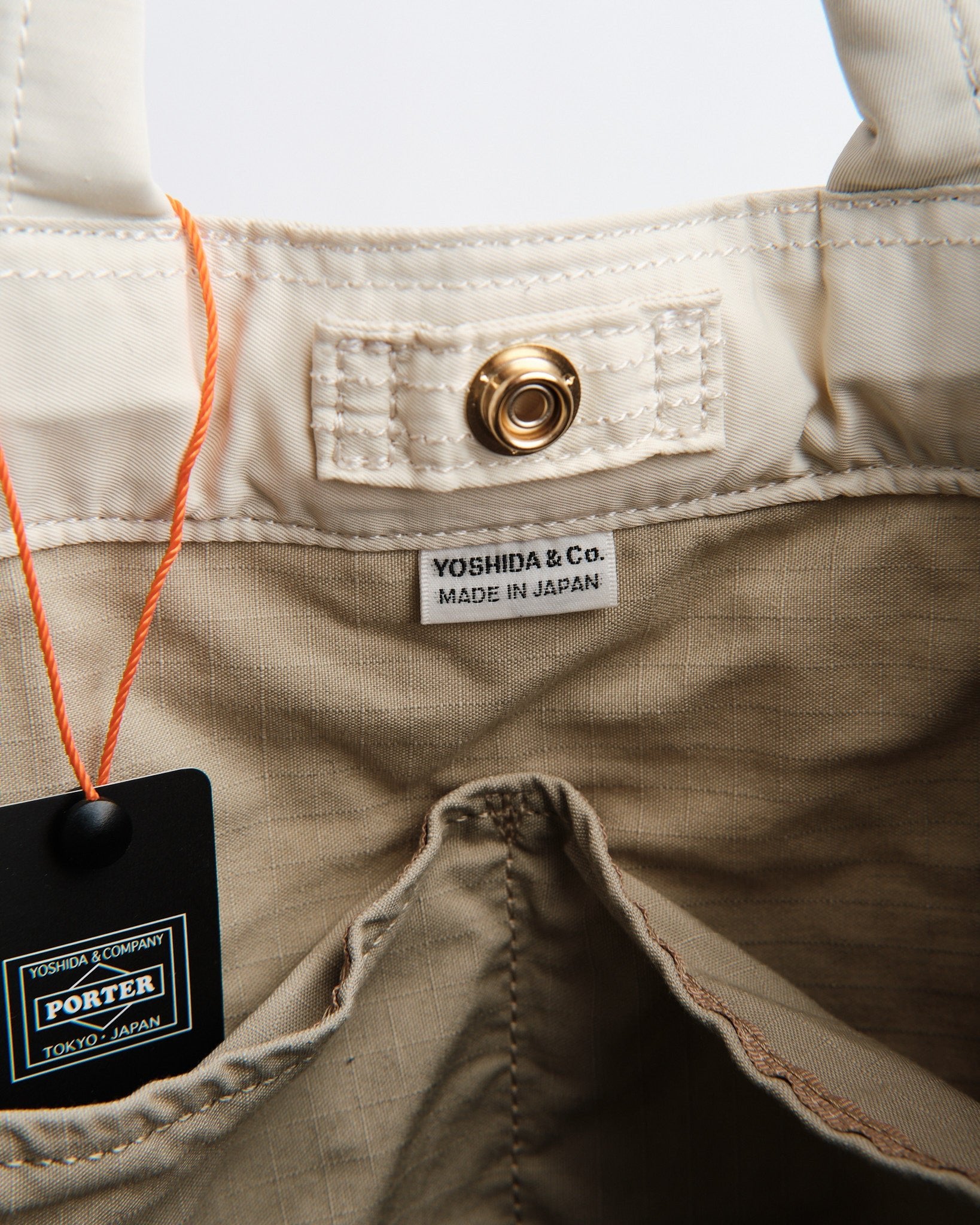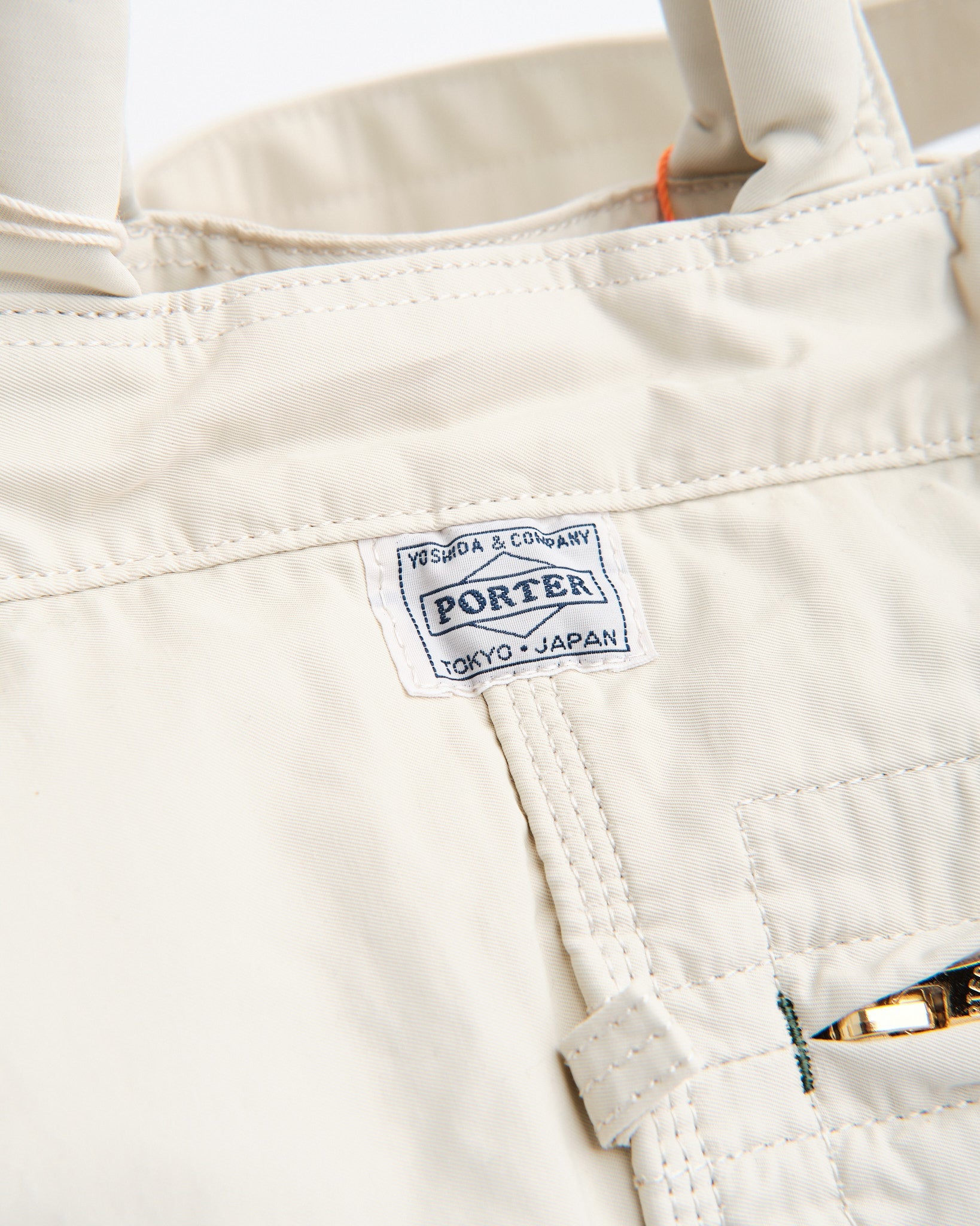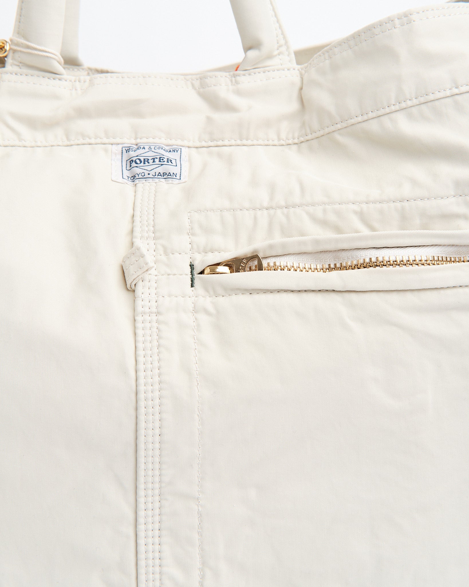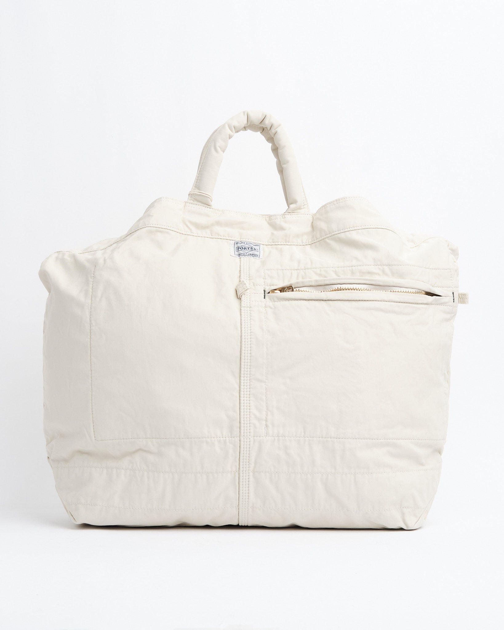 La PORTER by Yoshida MILE 2WAY TOTE BAG (L) in Bianco è una tote versatile ed elegante ispirata alle borse per attrezzi e ai grembiuli da lavoro americani di metà XX secolo. Realizzata in twill di nylon-cotone lucido, questa borsa offre sia durabilità che un'estetica sofisticata. Un particolare processo di lavaggio conferisce al materiale una sensazione morbida e leggera, mentre le finiture metalliche lucide aggiungono un tocco di eleganza distinto dalle tipiche borse da lavoro.