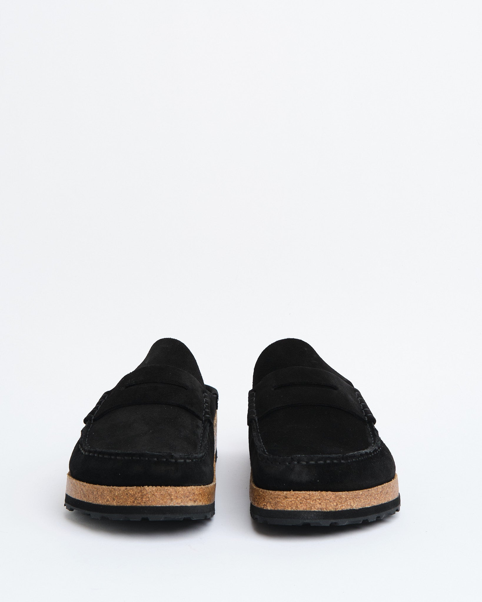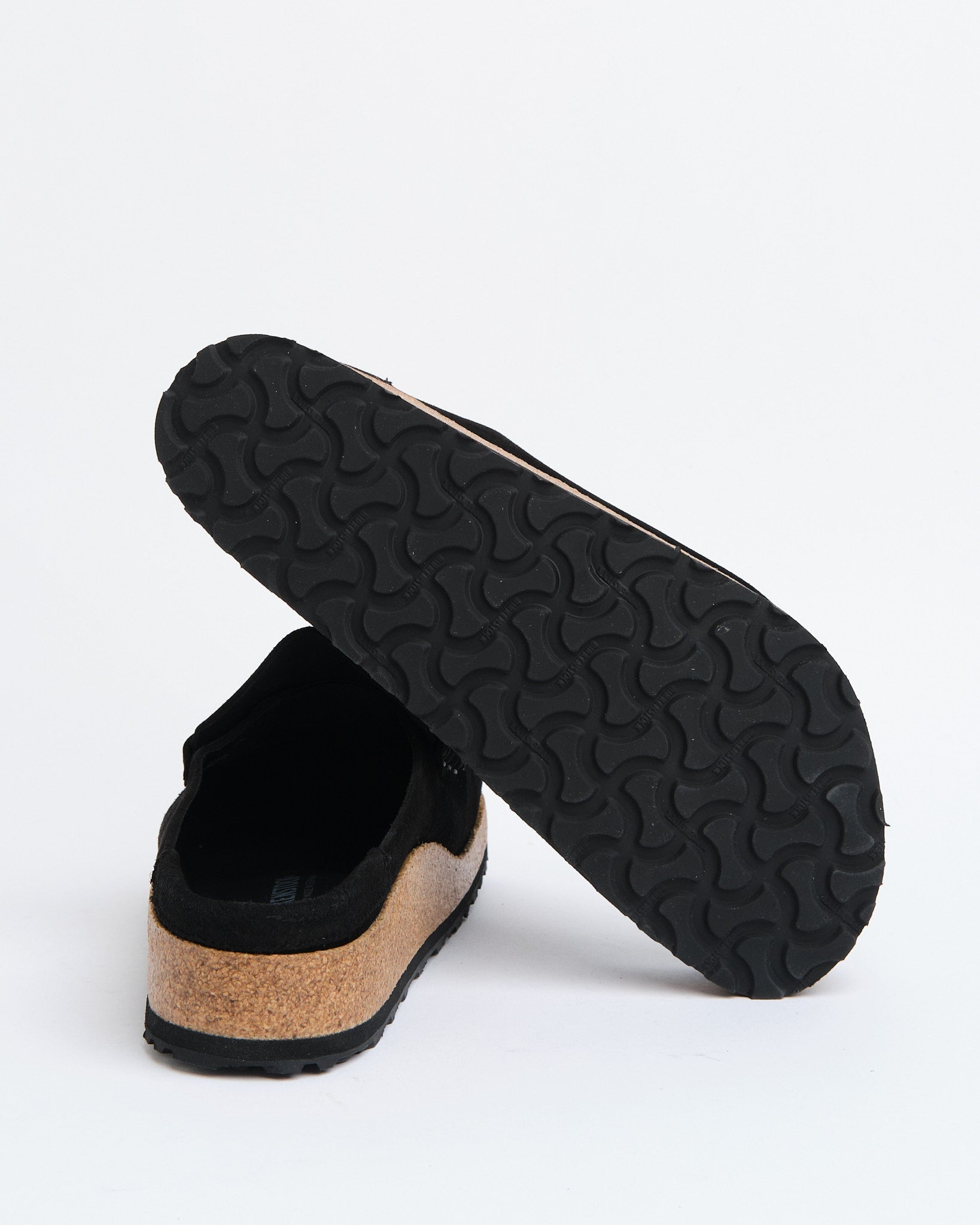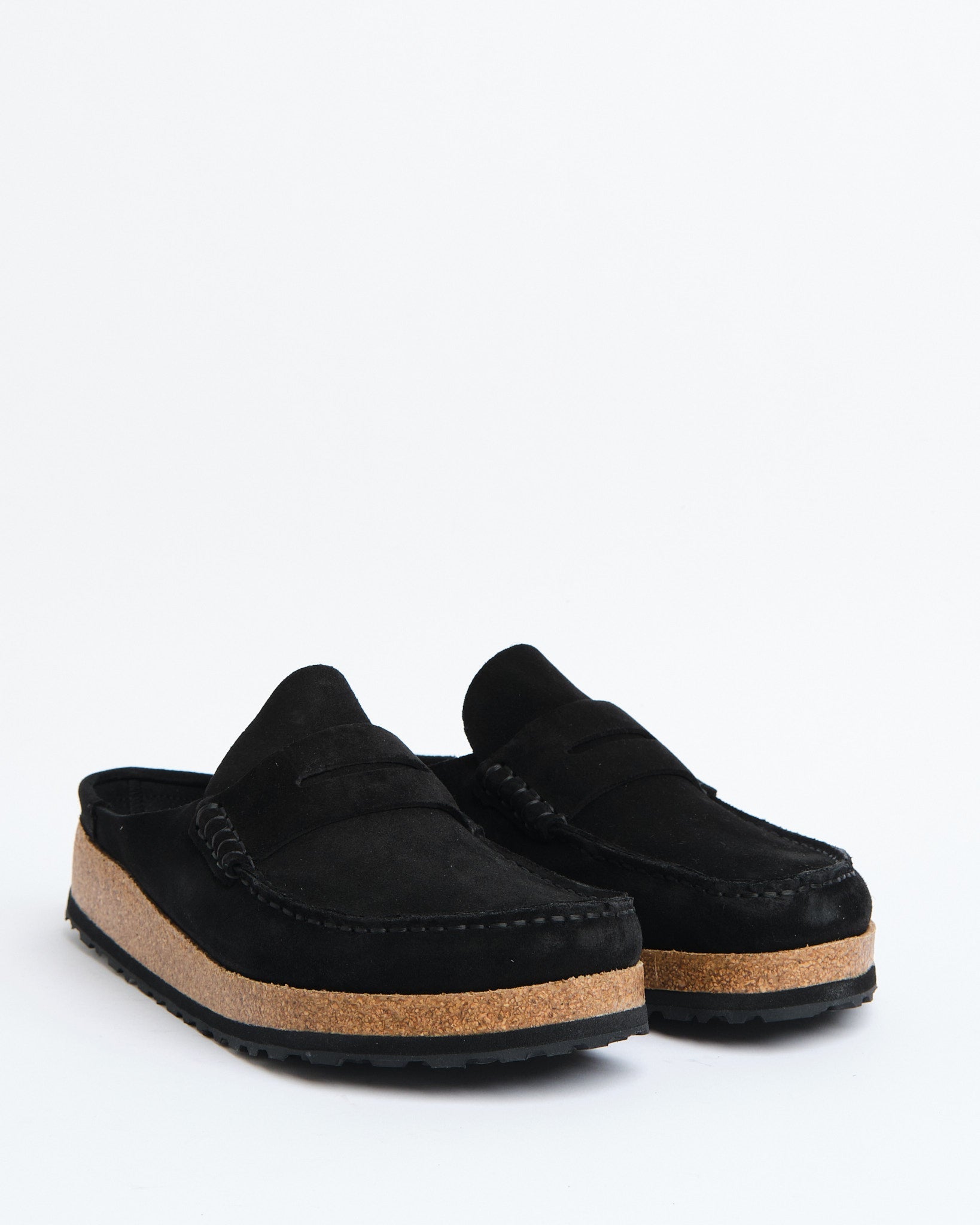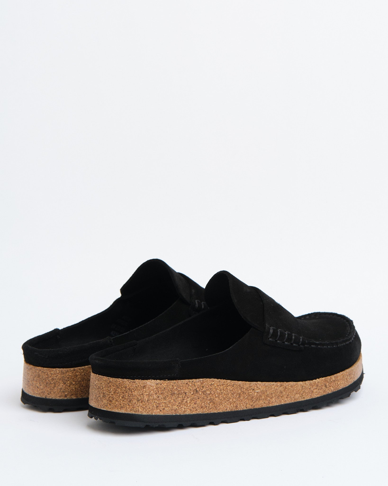 Presentazione del Birkenstock Naples VL Black BG, la versione maschile del zoccolo semi-aperto Buckley. Lo stile unico mocassino presenta cuciture evidenti, conferendo a questo sandalo un distinto vibe maschile. La sua tomaia è realizzata in morbida pelle scamosciata che sembra una seconda pelle, mentre un plantare anatomico in sughero-lattice aumenta la stabilità e il comfort. La suola bicomponente combina una intersuola ammortizzante in EVA con una suola esterna in gomma, offrendo durabilità e supporto anche nei giorni di pioggia.
