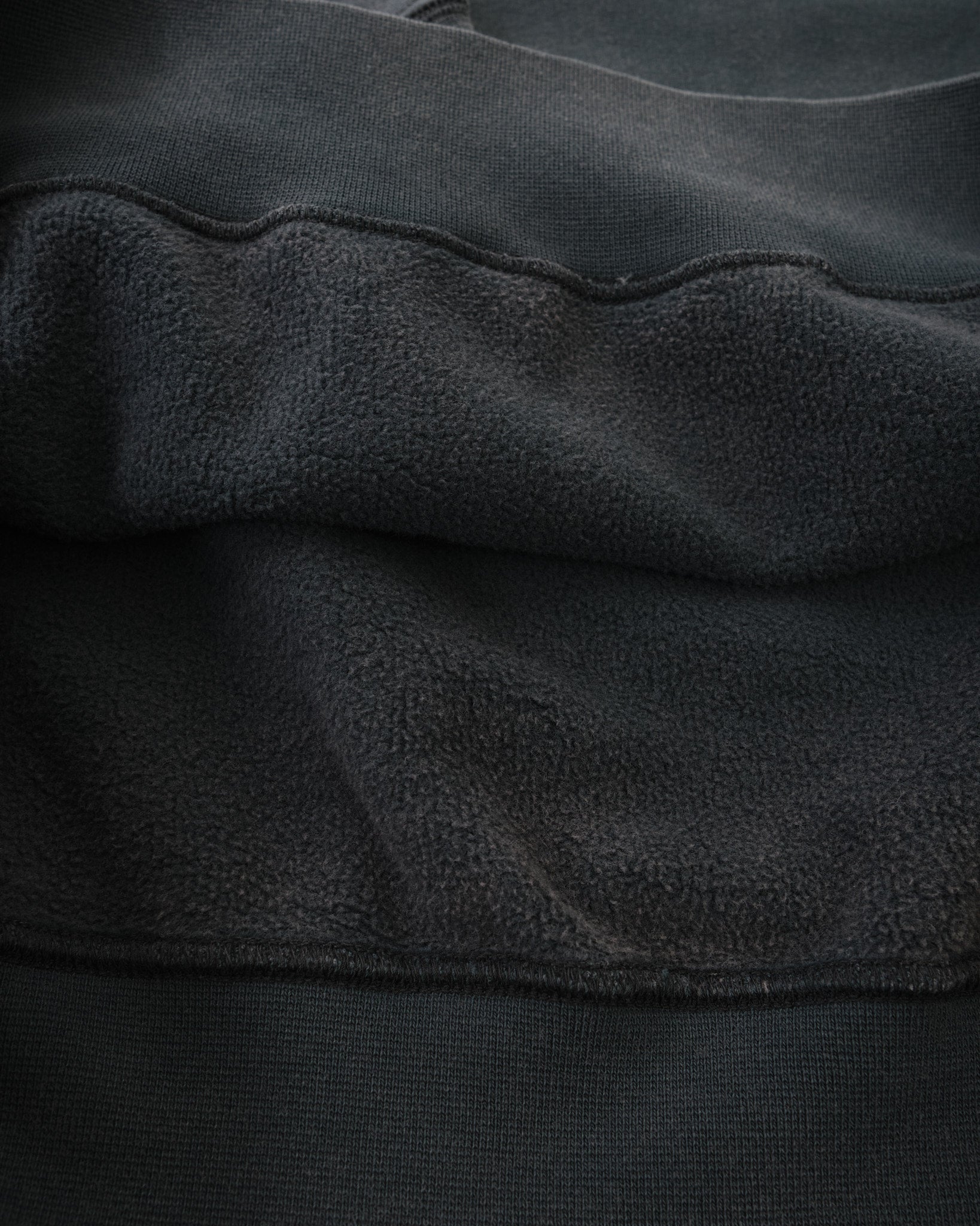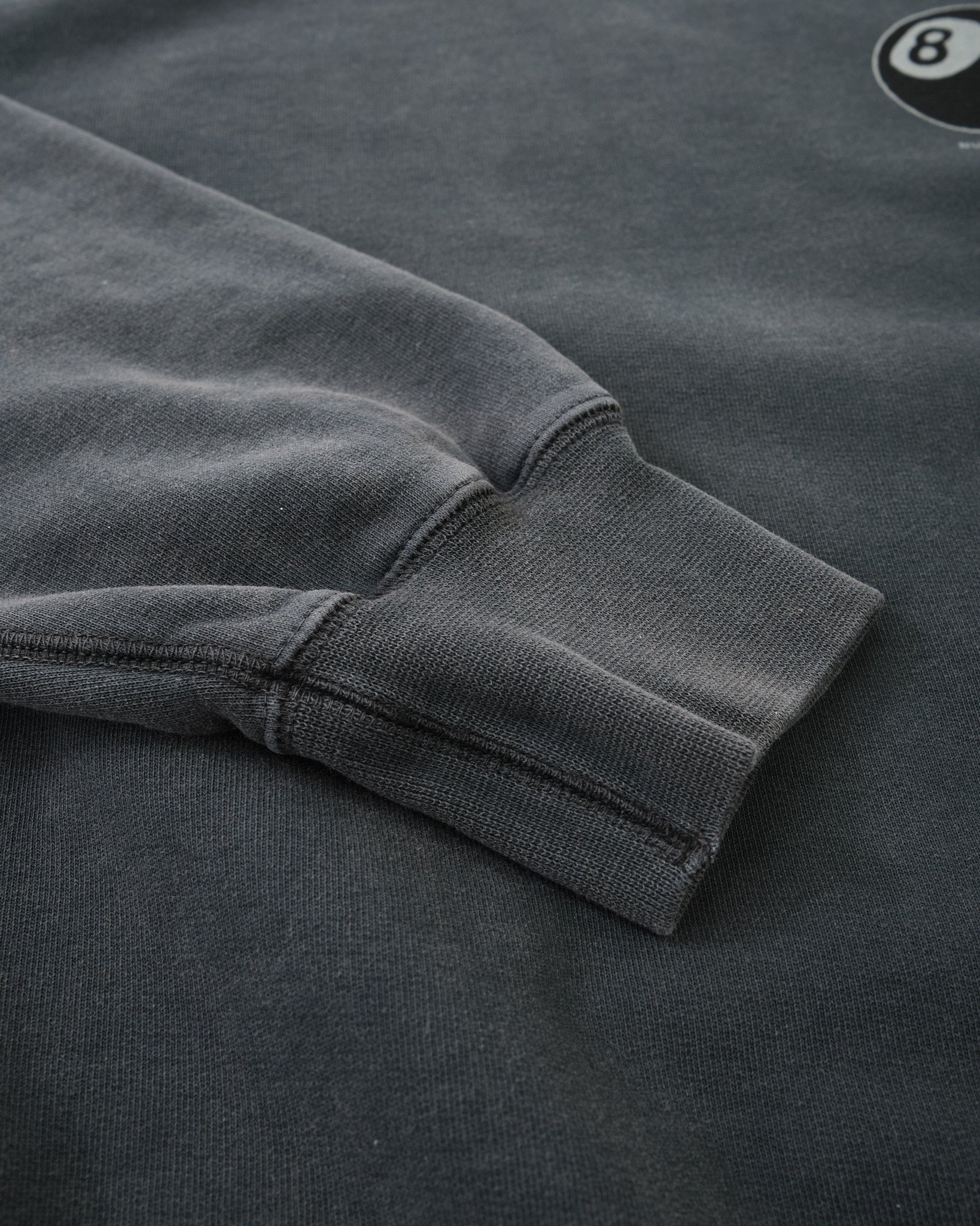 The sweatshirt is garment dyed and fade-out washed to achieve its faded antracite tone, giving it a gently worn-in appearance with subtle variations in colour. Designed with raglan sleeves, flatlock seams, and rib-knit cuffs, it offers a clean, relaxed silhouette with practical comfort.