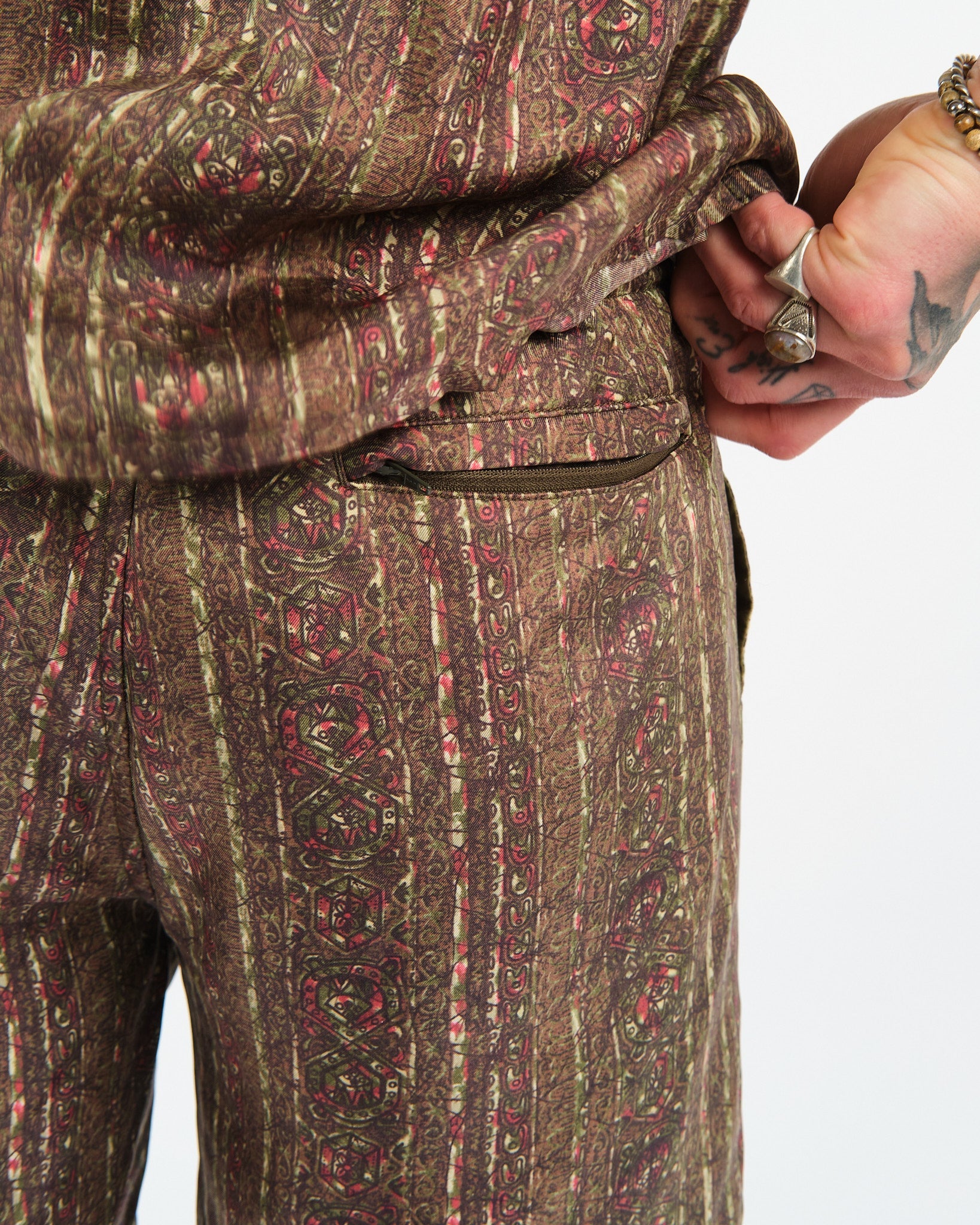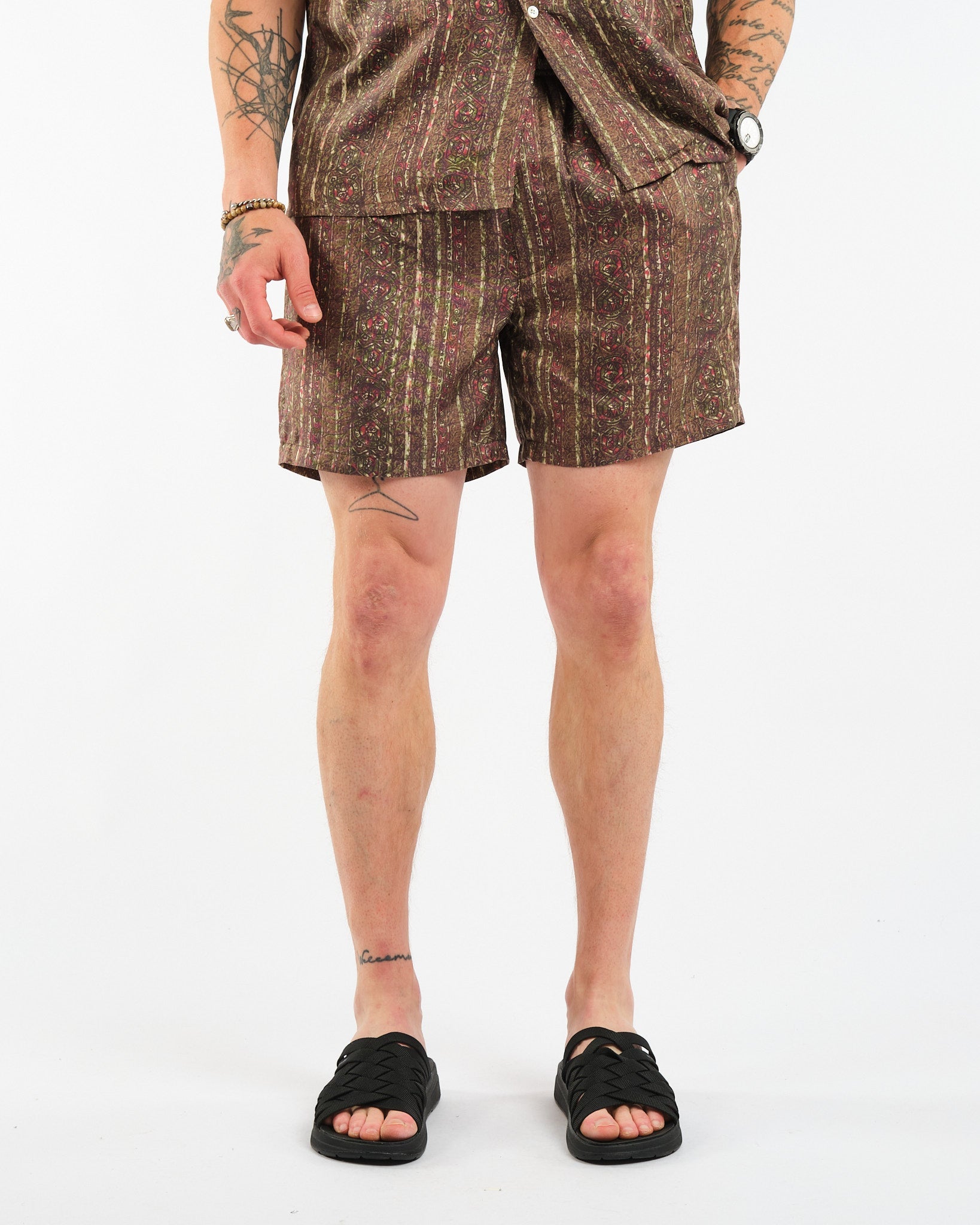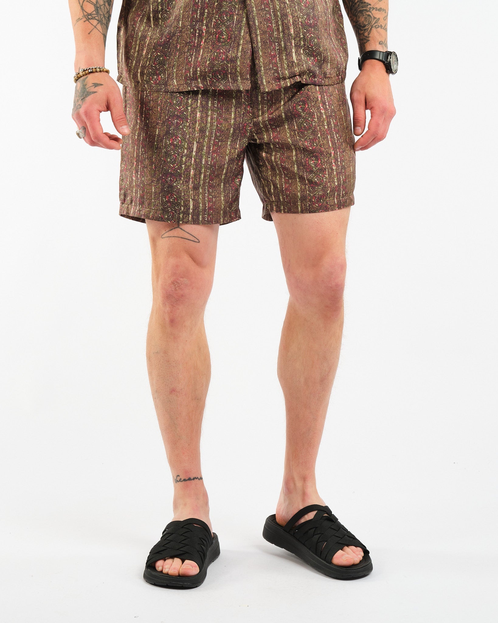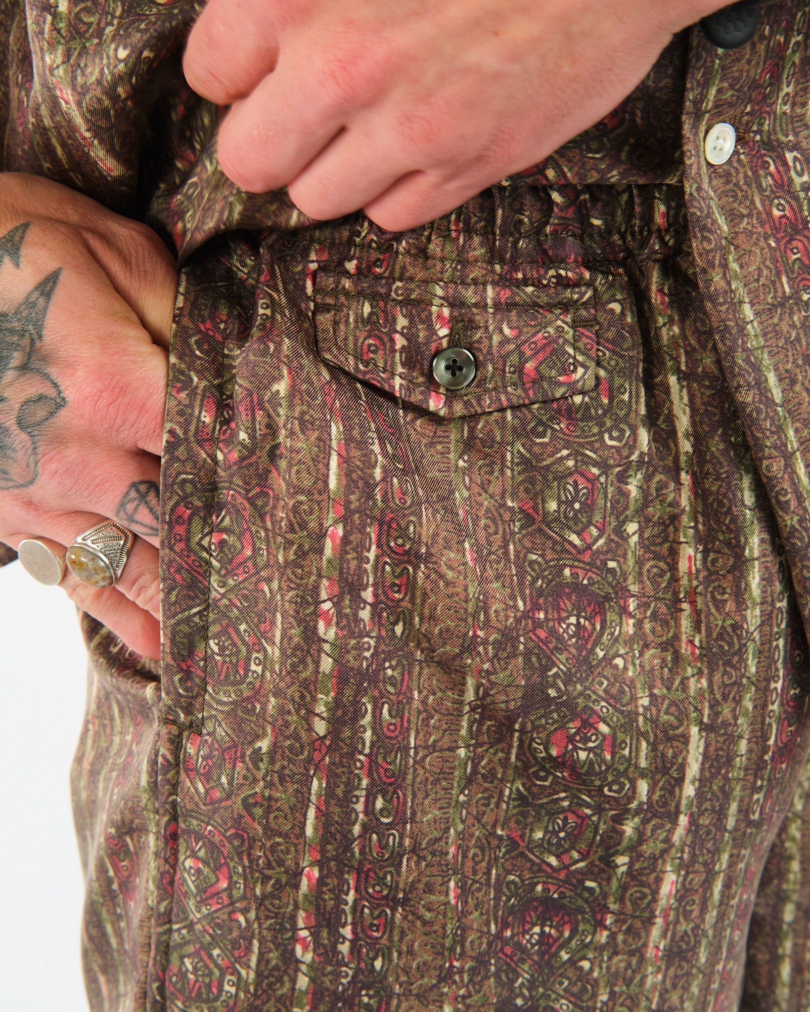 Entra nello stile senza sforzo con i Beach Shorts in Seta Batik Print Olive di Beams Plus. Ispirati agli articoli vintage, questi shorts sono una testimonianza dell'impegno del marchio con sede a Tokyo nel creare abbigliamento che mantiene il suo fascino casual e cool negli anni. Realizzati in Giappone, questi shorts in 100% seta offrono un comfort lussuoso e un'estetica unica. Presentano una vita elastica per una vestibilità comoda, una tasca con patta e bottone per monete, tasche oblique anteriori e tasche posteriori con bottone a filetto e a filetto per praticità.