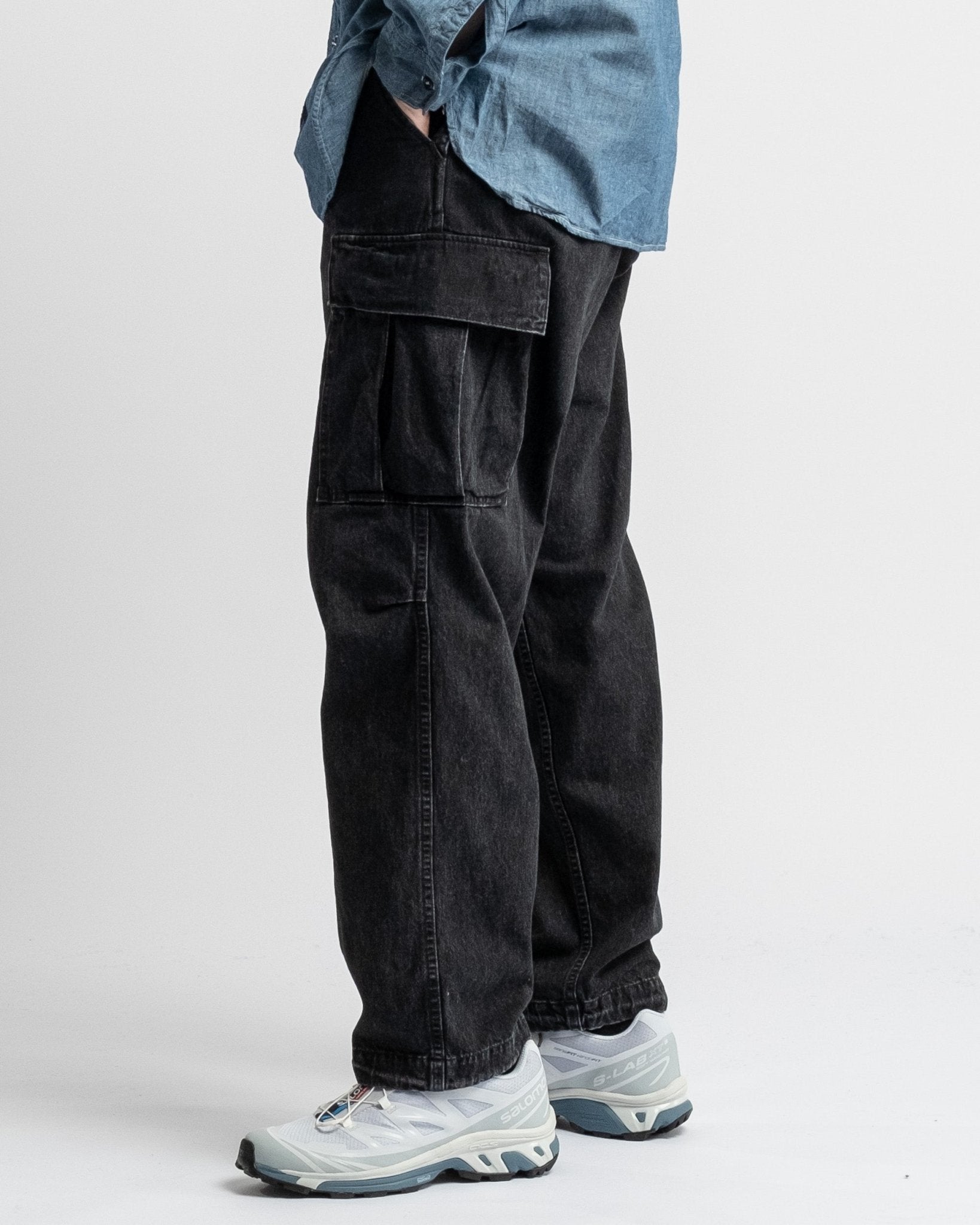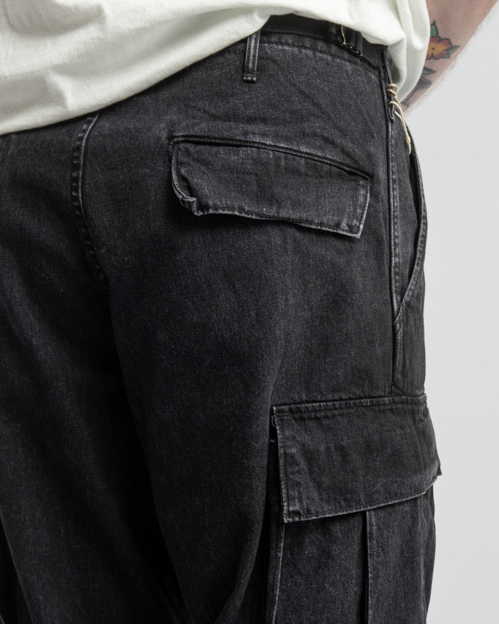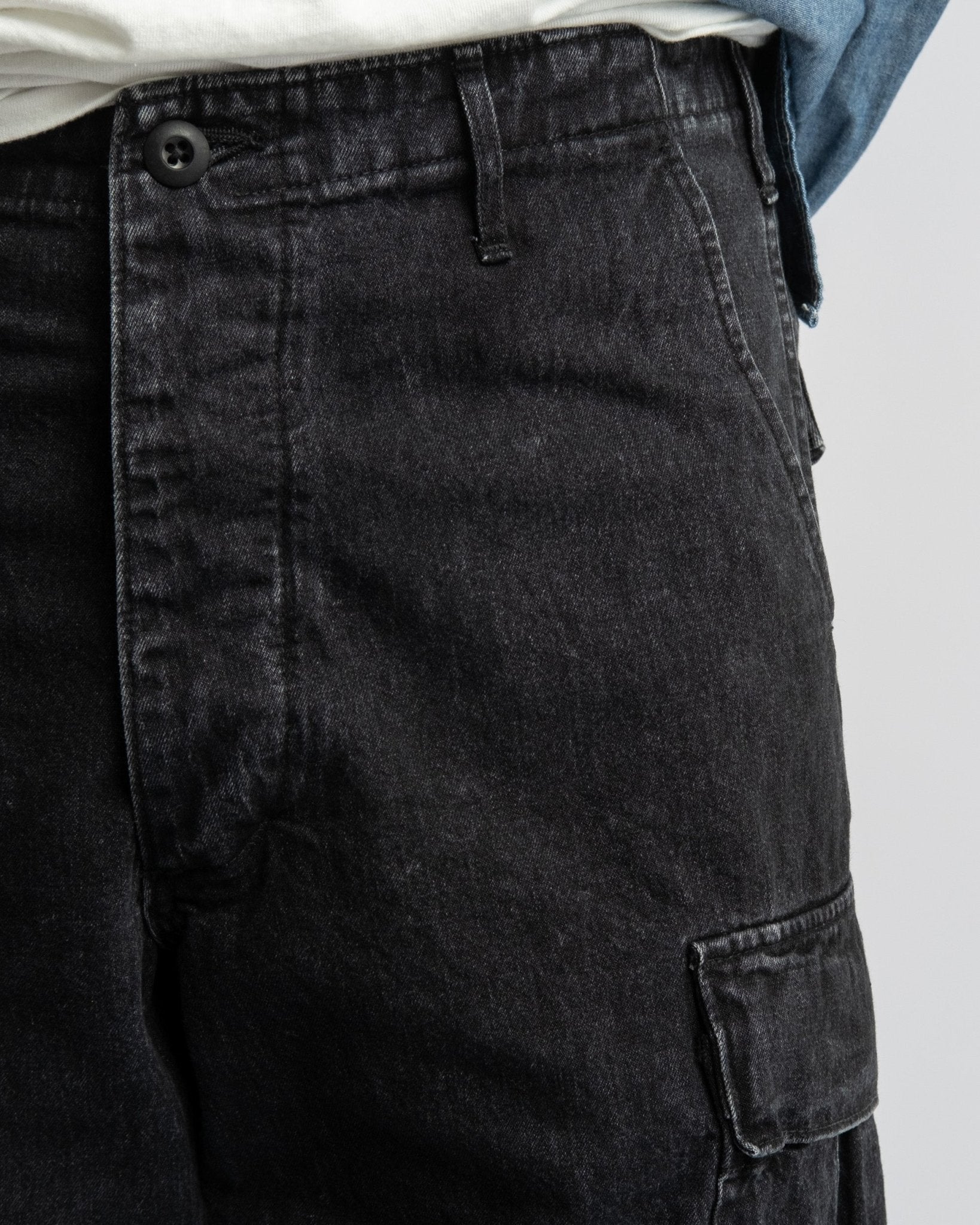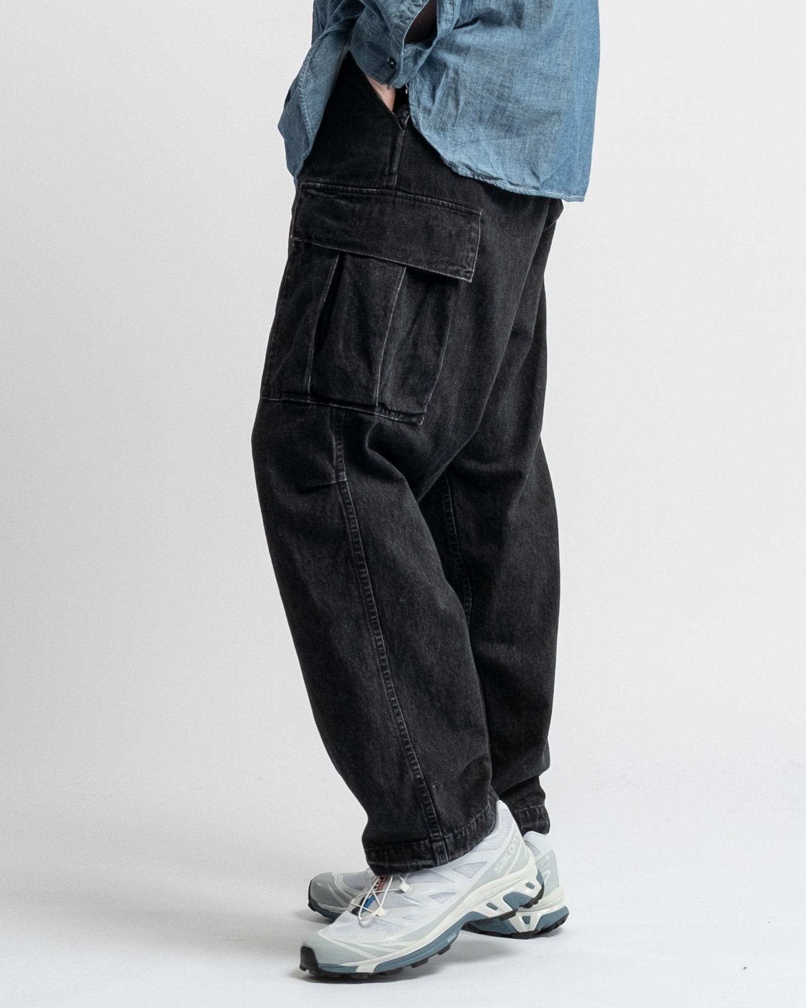 Pantaloni cargo in denim nero lavato a pietra con 6 tasche in stile vintage dell'esercito americano di orSlow. Realizzati in denim giapponese da 10 oz lavato a pietra. Vita medio alta e vestibilità rilassata vintage. Dotati di due grandi tasche laterali, due tasche laterali regolari, due tasche posteriori e cintura elastica con coulisse regolabile. Prodotto in Giappone.