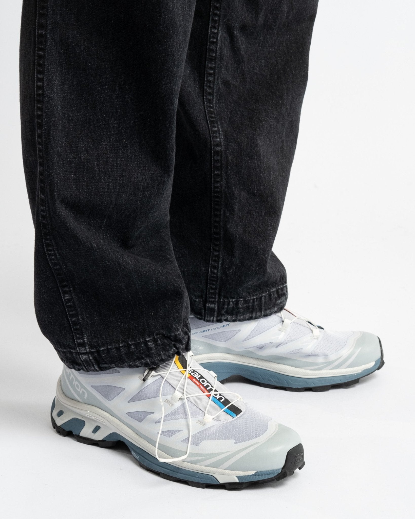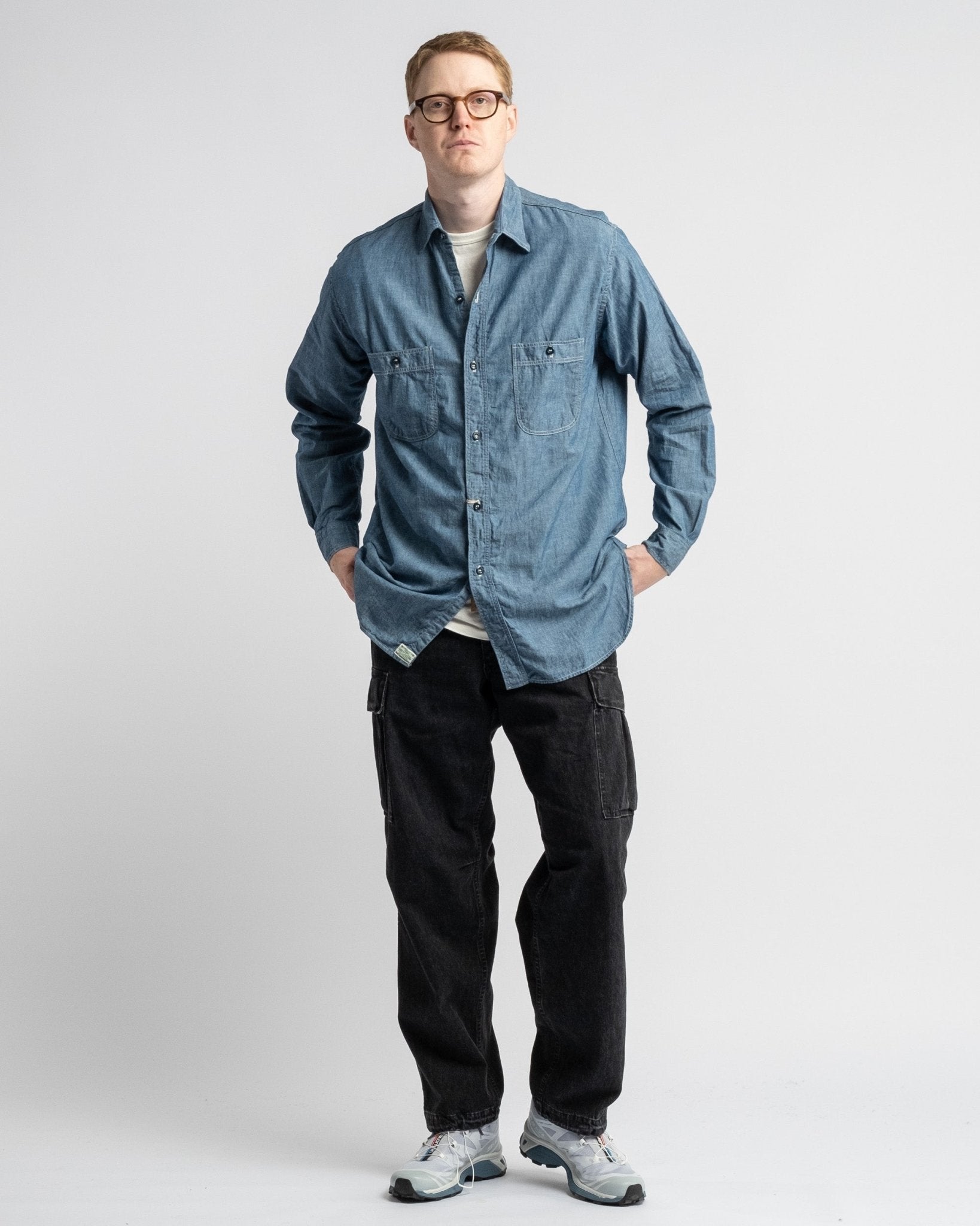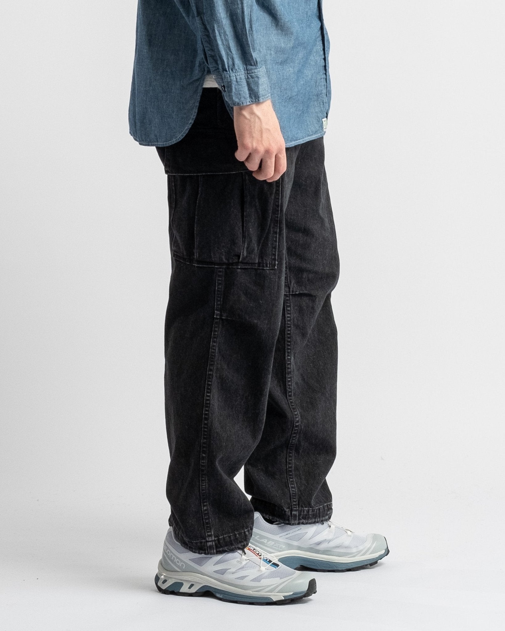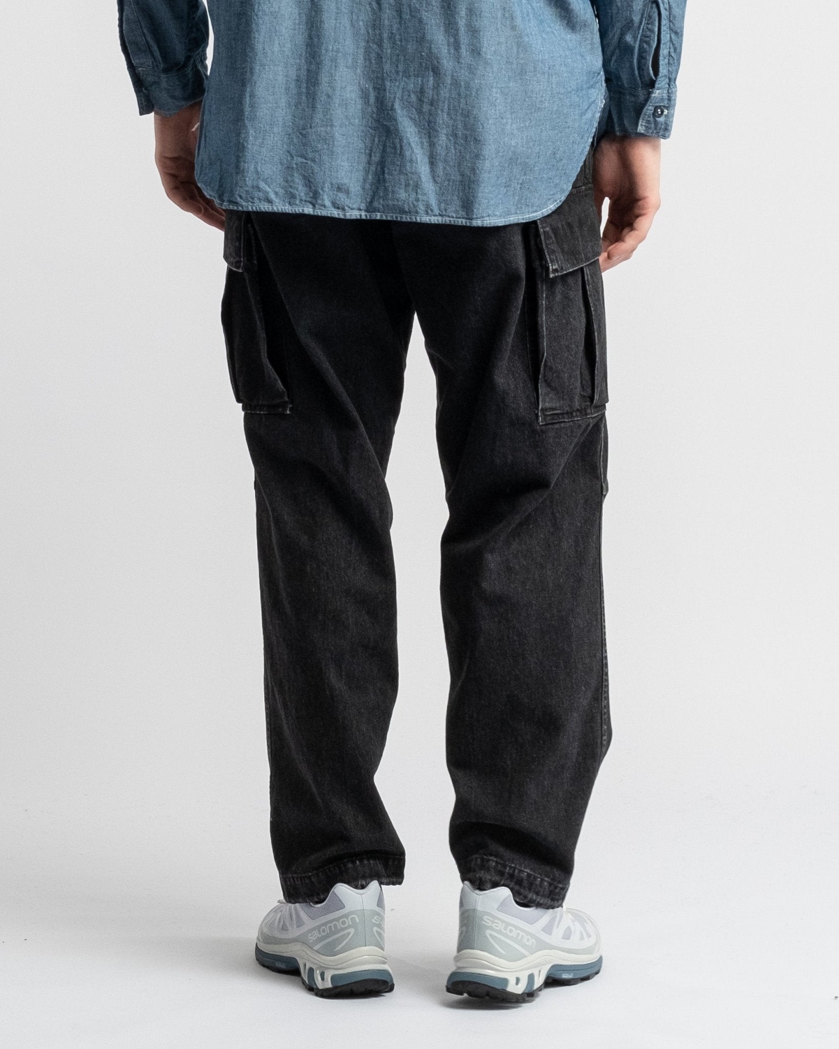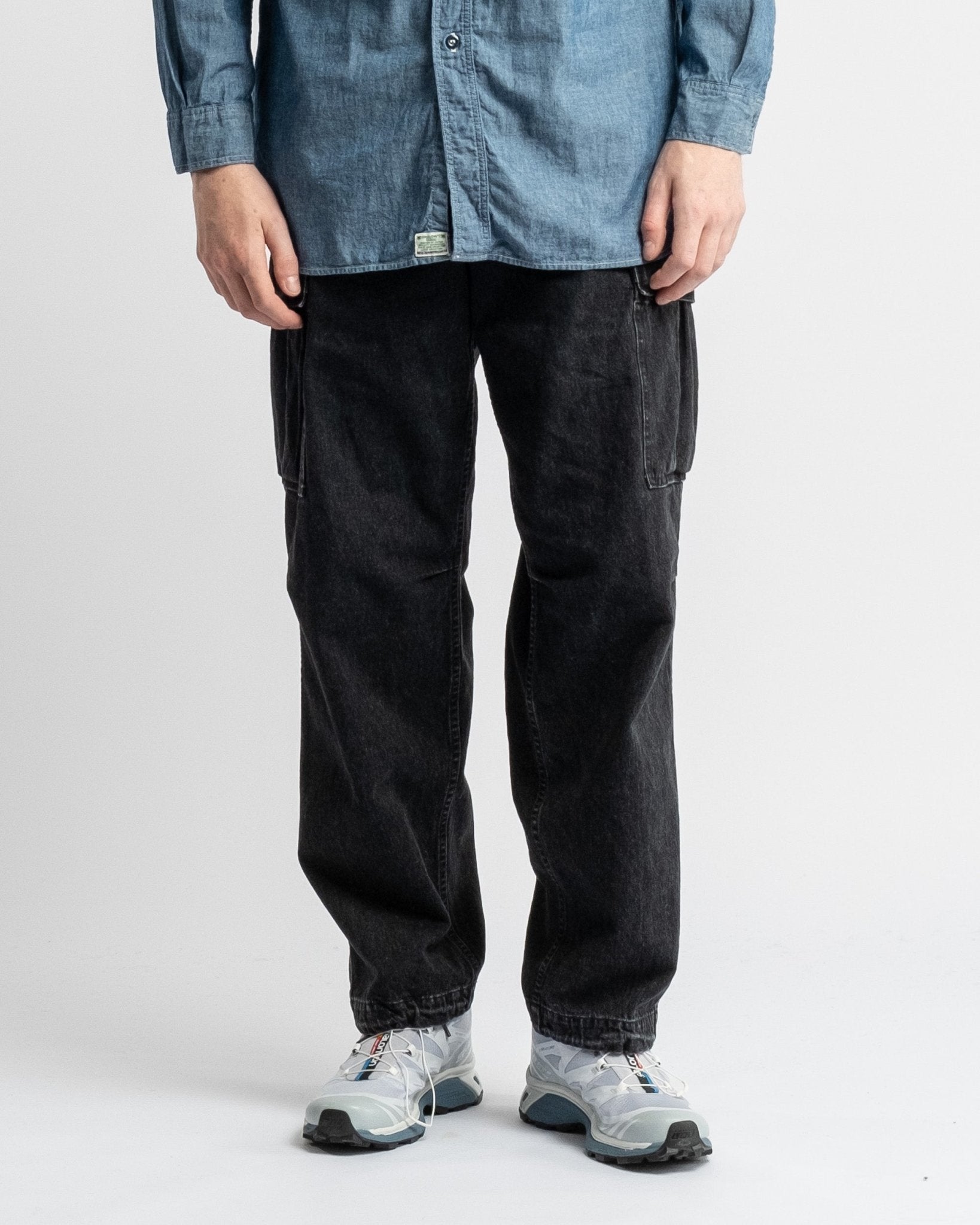 Pantaloni cargo in denim nero lavato a pietra con 6 tasche in stile vintage dell'esercito americano di orSlow. Realizzati in denim giapponese da 10 oz lavato a pietra. Vita medio alta e vestibilità rilassata vintage. Dotati di due grandi tasche laterali, due tasche laterali regolari, due tasche posteriori e cintura elastica con coulisse regolabile. Prodotto in Giappone.