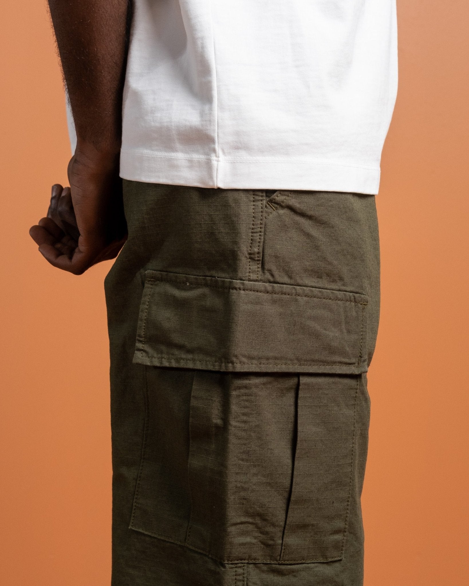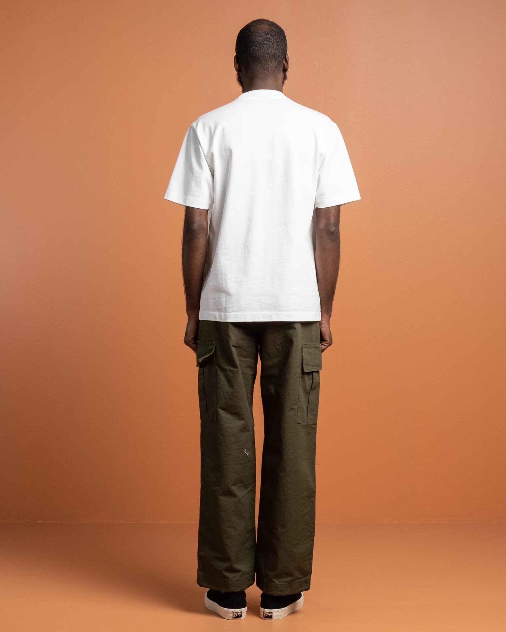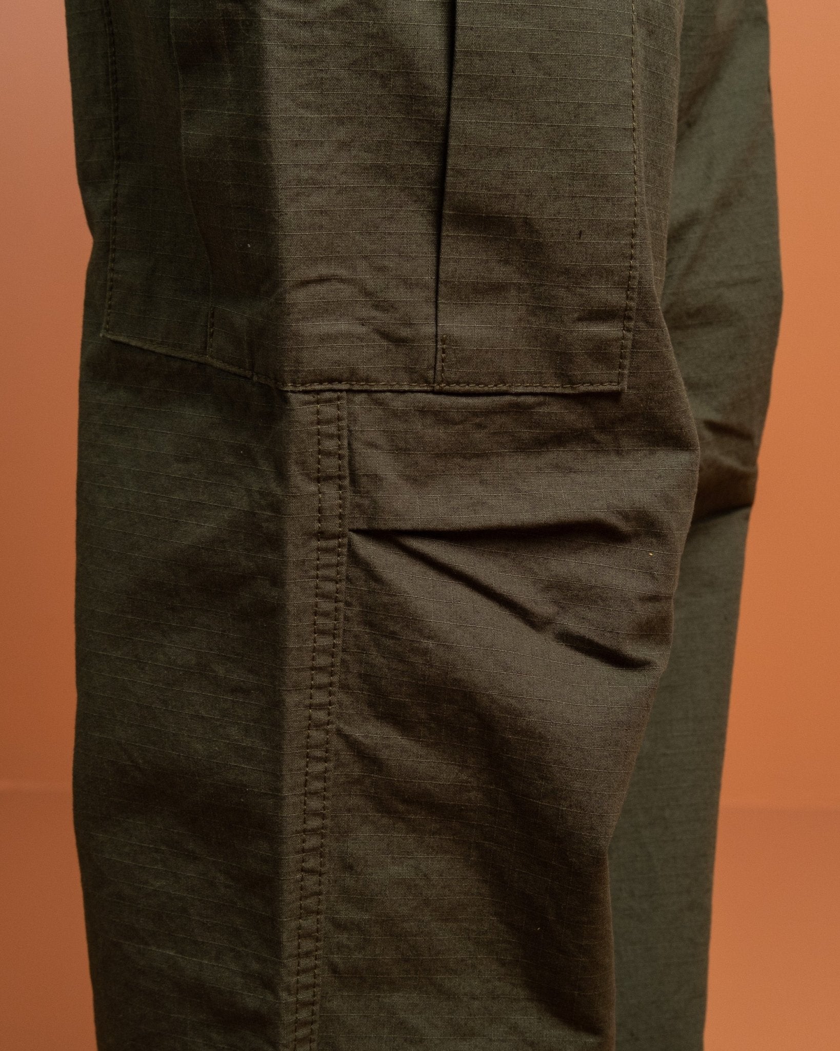 J28712J01 Pantaloni Cargo Militari Moderni di Japan Blue Jeans. Pantaloni dal taglio rilassato e ampio realizzati in tessuto di cotone ripstop. Due tasche anteriori, due tasche posteriori e due ampie tasche cargo. Chiusura con zip, passanti per cintura e orlo regolabile tramite coulisse. Tessuto molto resistente in un bel colore verde oliva. Prodotto in Giappone.