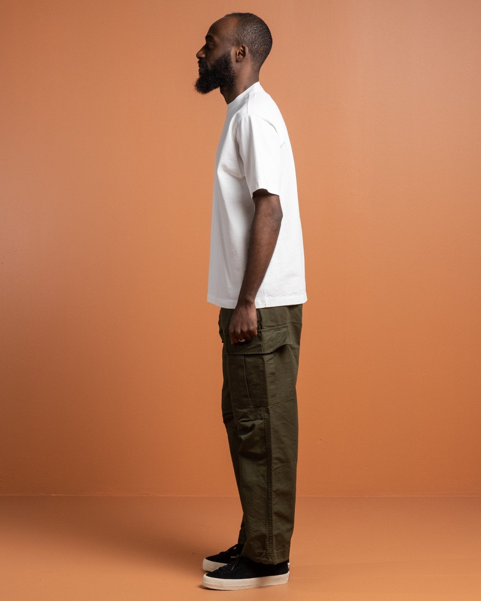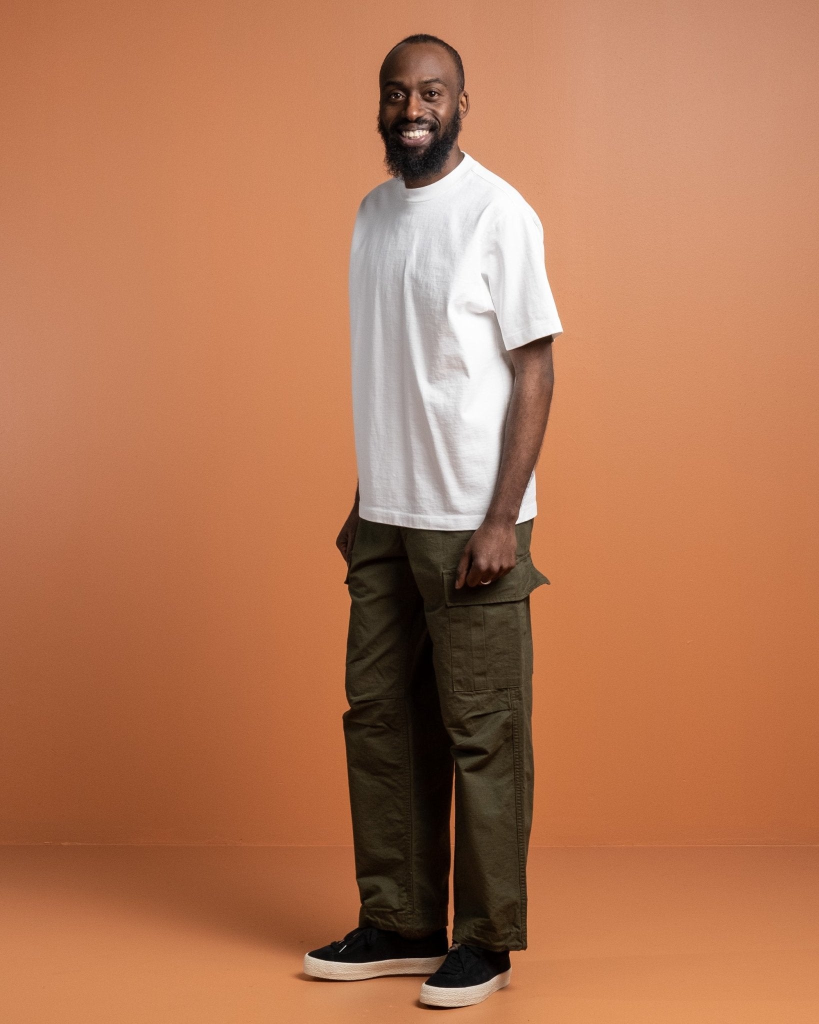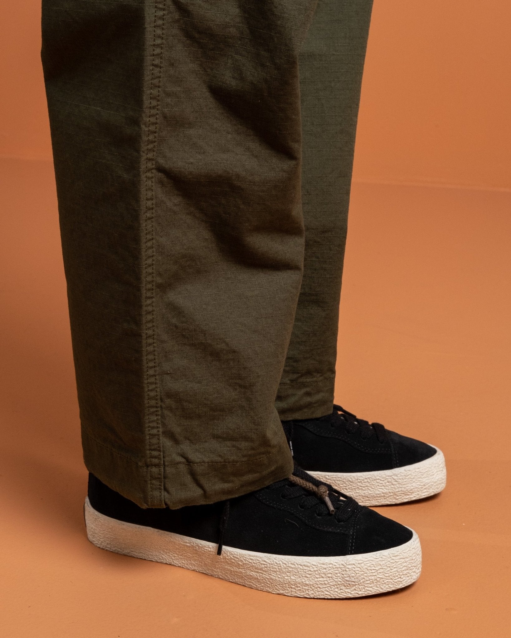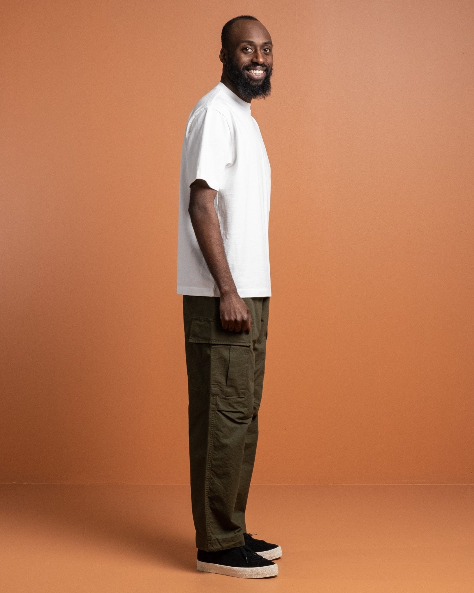 J28712J01 Pantaloni Cargo Militari Moderni di Japan Blue Jeans. Pantaloni dal taglio rilassato e ampio realizzati in tessuto di cotone ripstop. Due tasche anteriori, due tasche posteriori e due ampie tasche cargo. Chiusura con zip, passanti per cintura e orlo regolabile tramite coulisse. Tessuto molto resistente in un bel colore verde oliva. Prodotto in Giappone.