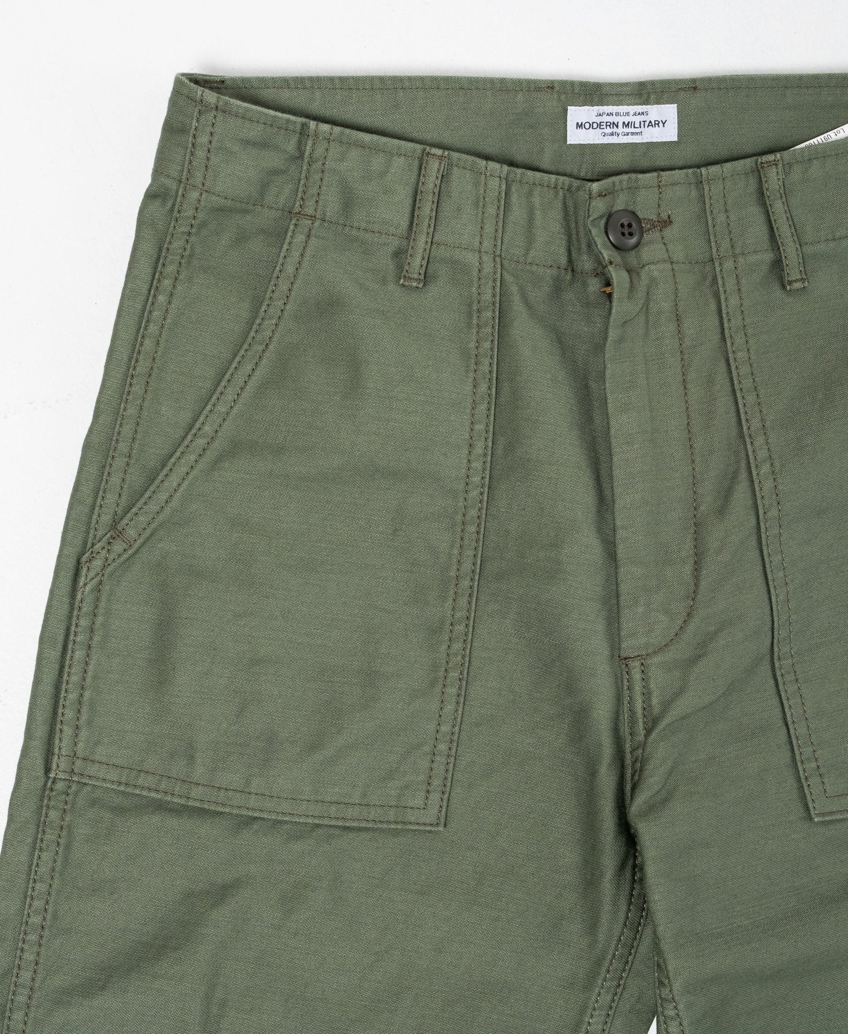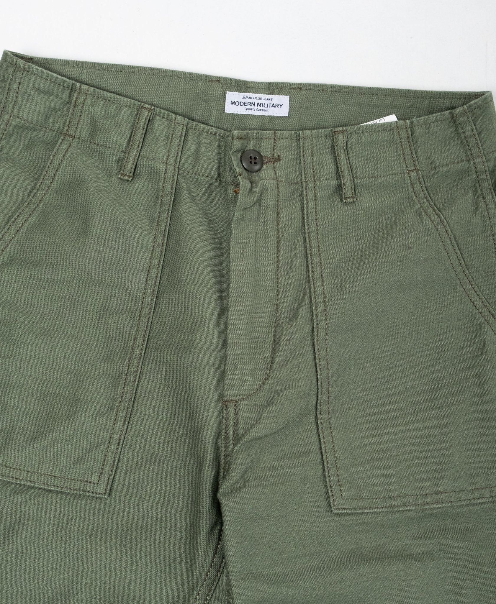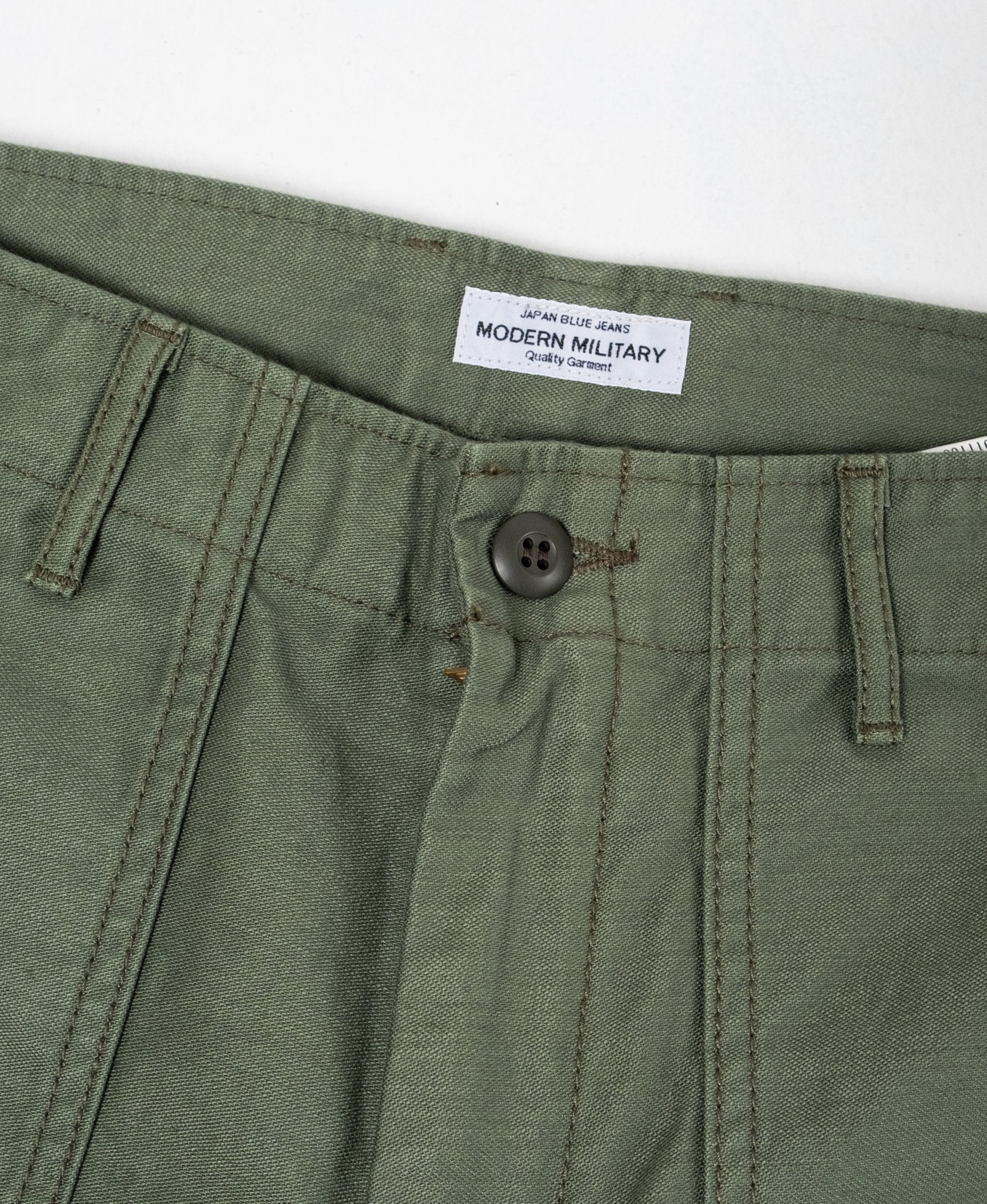 Pantaloni Baker Denim Militari Moderni di Japan Blue Jeans. Vestibilità rilassata, realizzati in satin di cotone. Due tasche anteriori e due tasche posteriori, più cuciture visibili. Made in Japan.