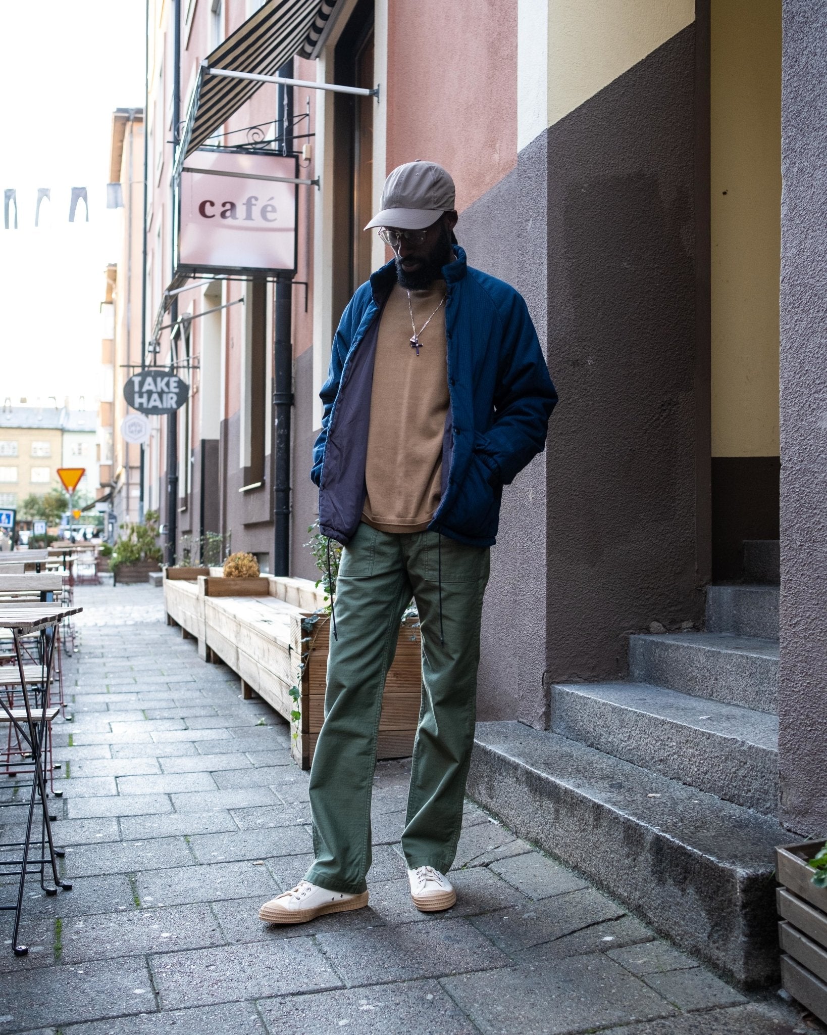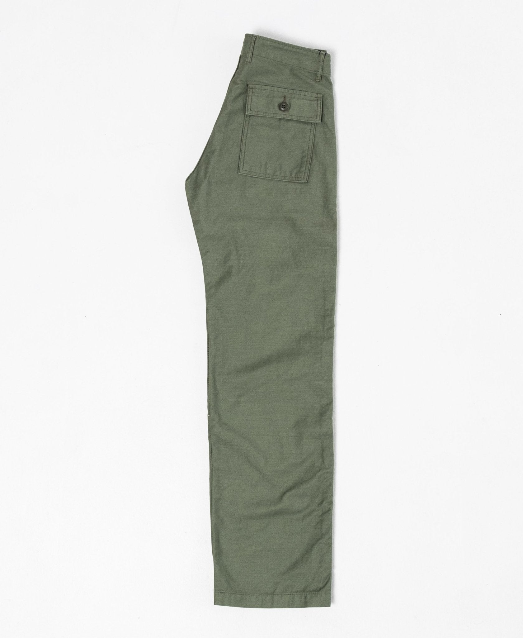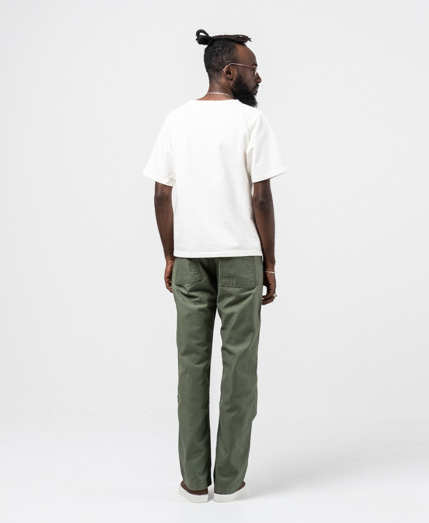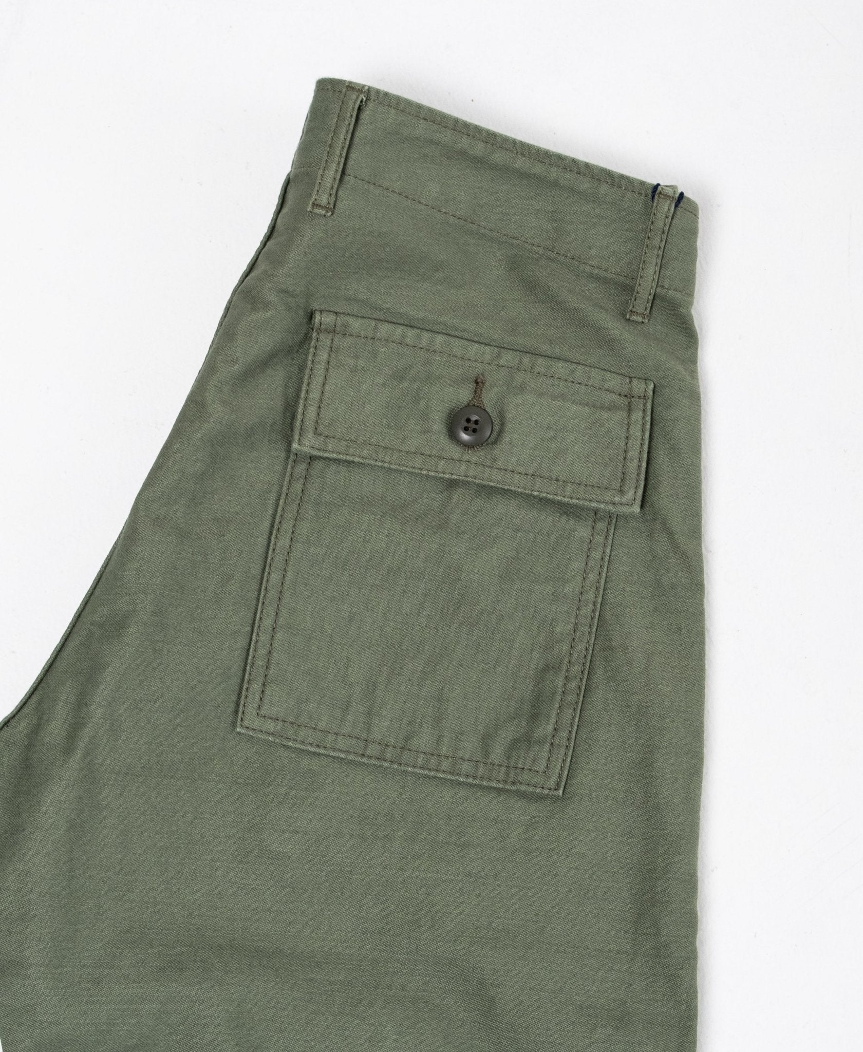 Pantaloni Baker Denim Militari Moderni di Japan Blue Jeans. Vestibilità rilassata, realizzati in satin di cotone. Due tasche anteriori e due tasche posteriori, più cuciture visibili. Made in Japan.