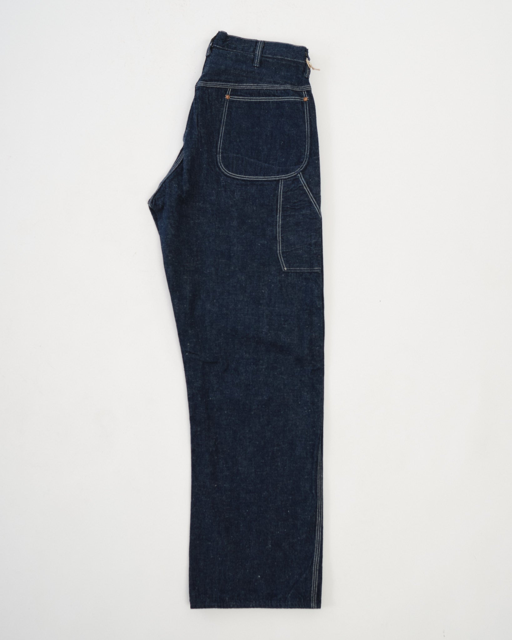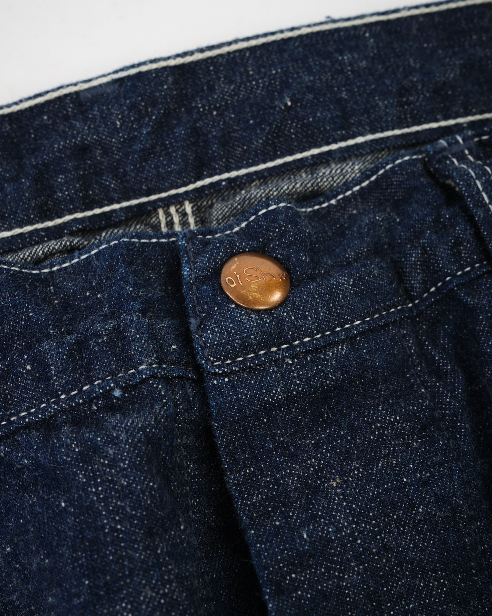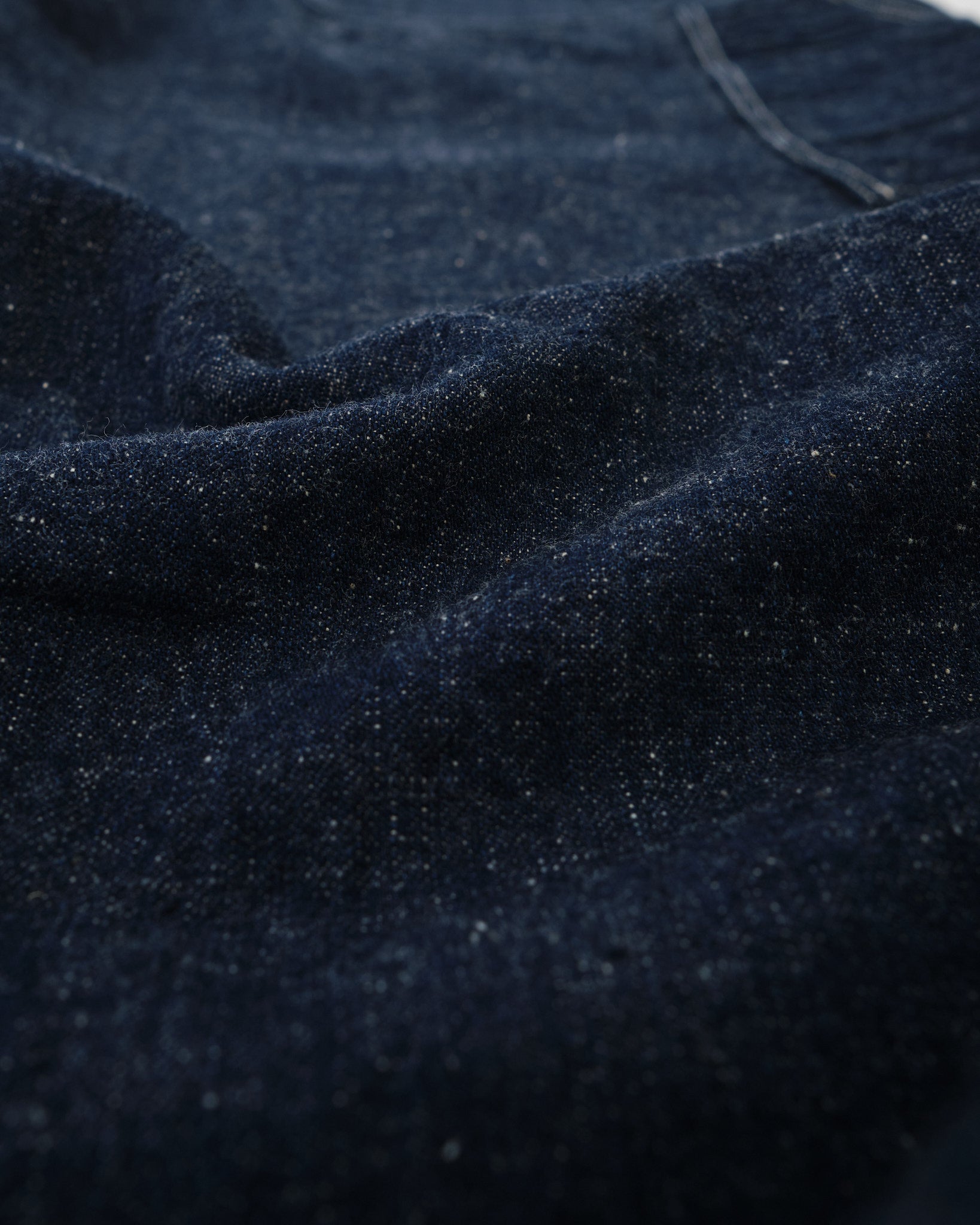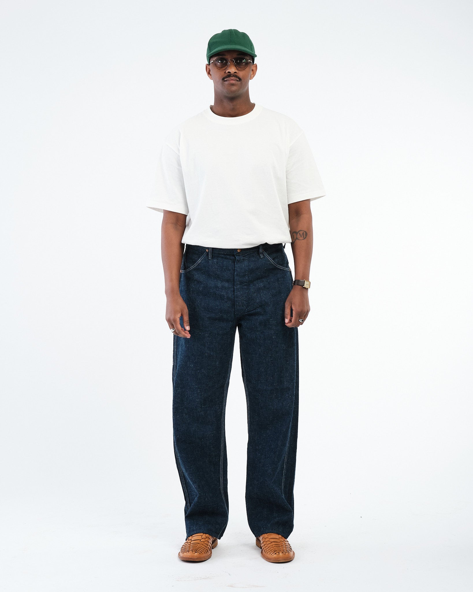 Il profondo colore indaco, ottenuto tramite il distintivo trattamento "one wash" di orSlow, fornisce un colore ricco che svilupperà una patina unica nel tempo, aggiungendo carattere al capo. Le cuciture bianche a contrasto su tutto il capo complementano la tonalità indaco, evidenziando i dettagli costruttivi dei pantaloni.