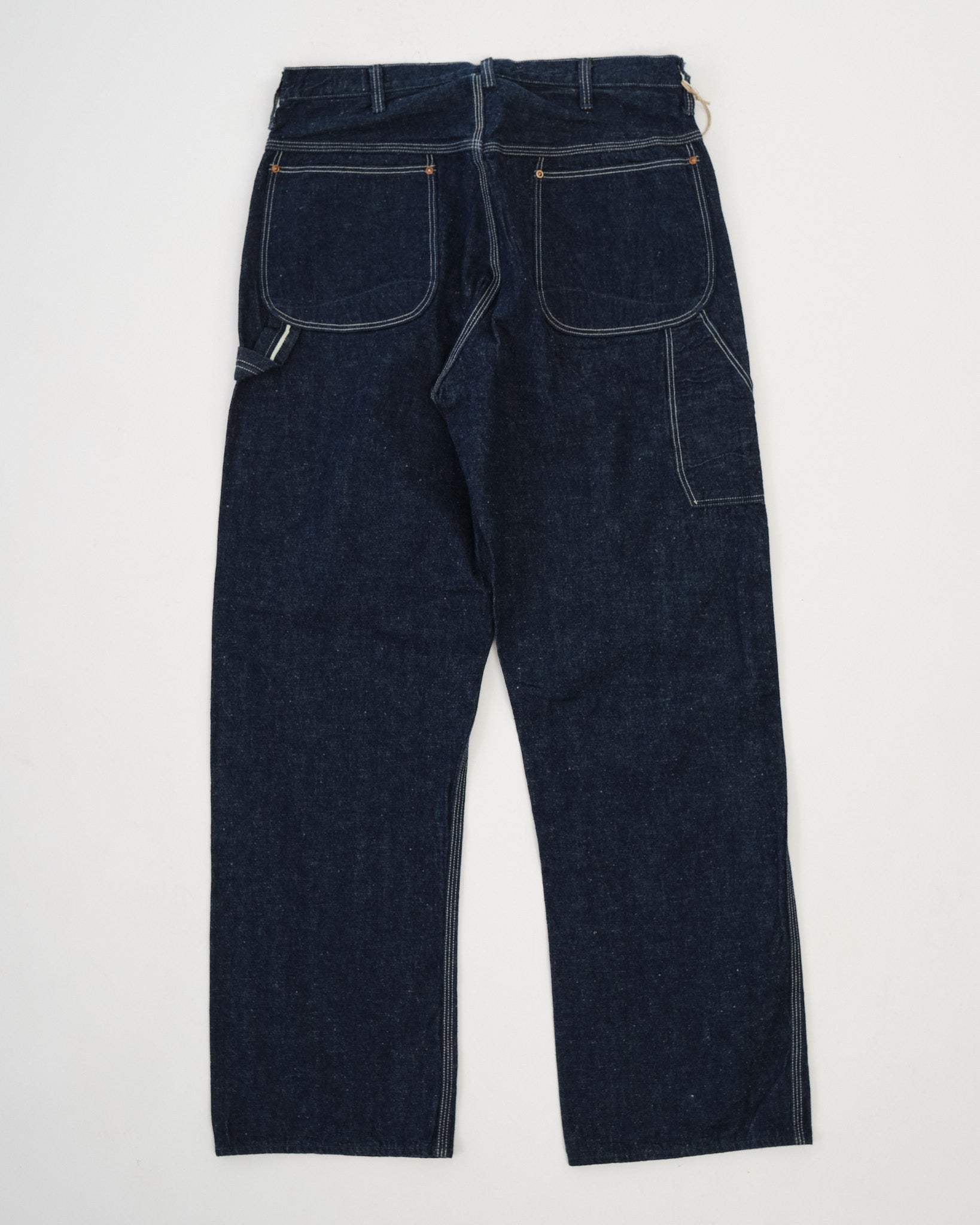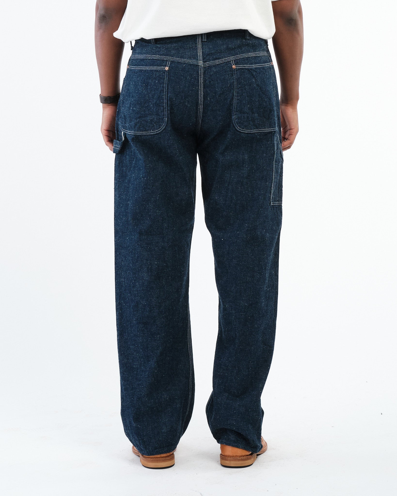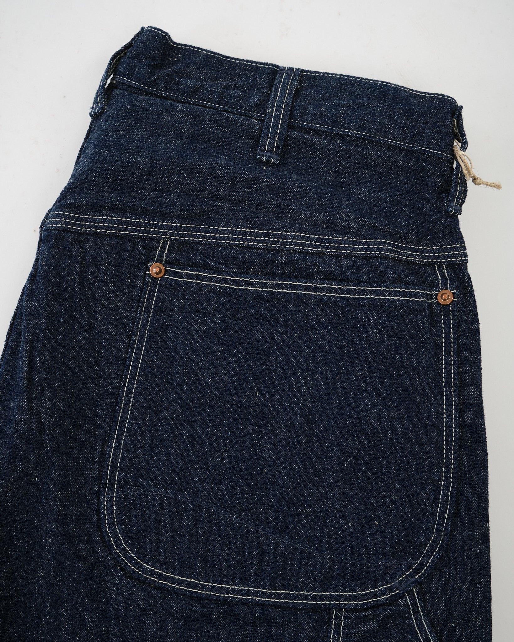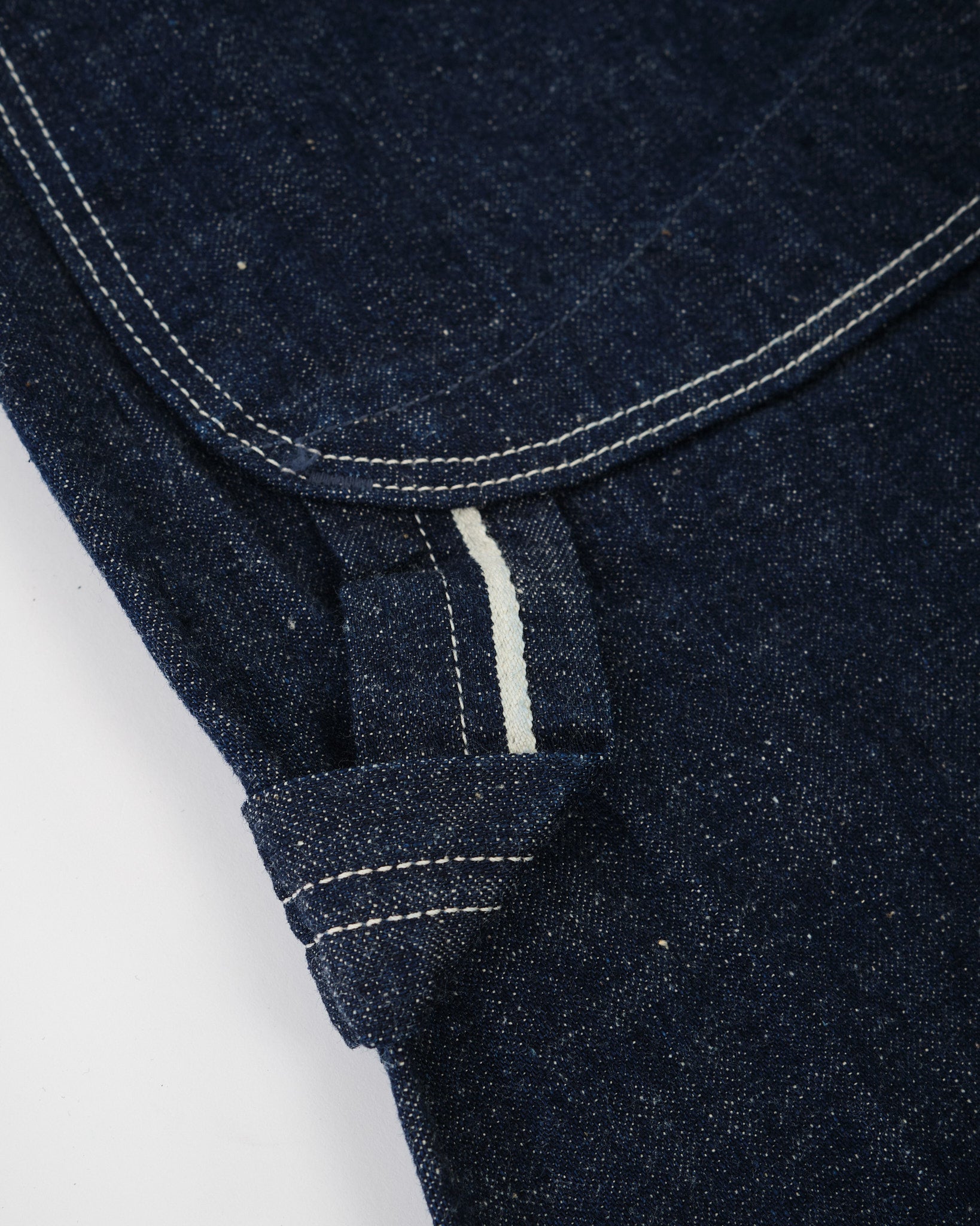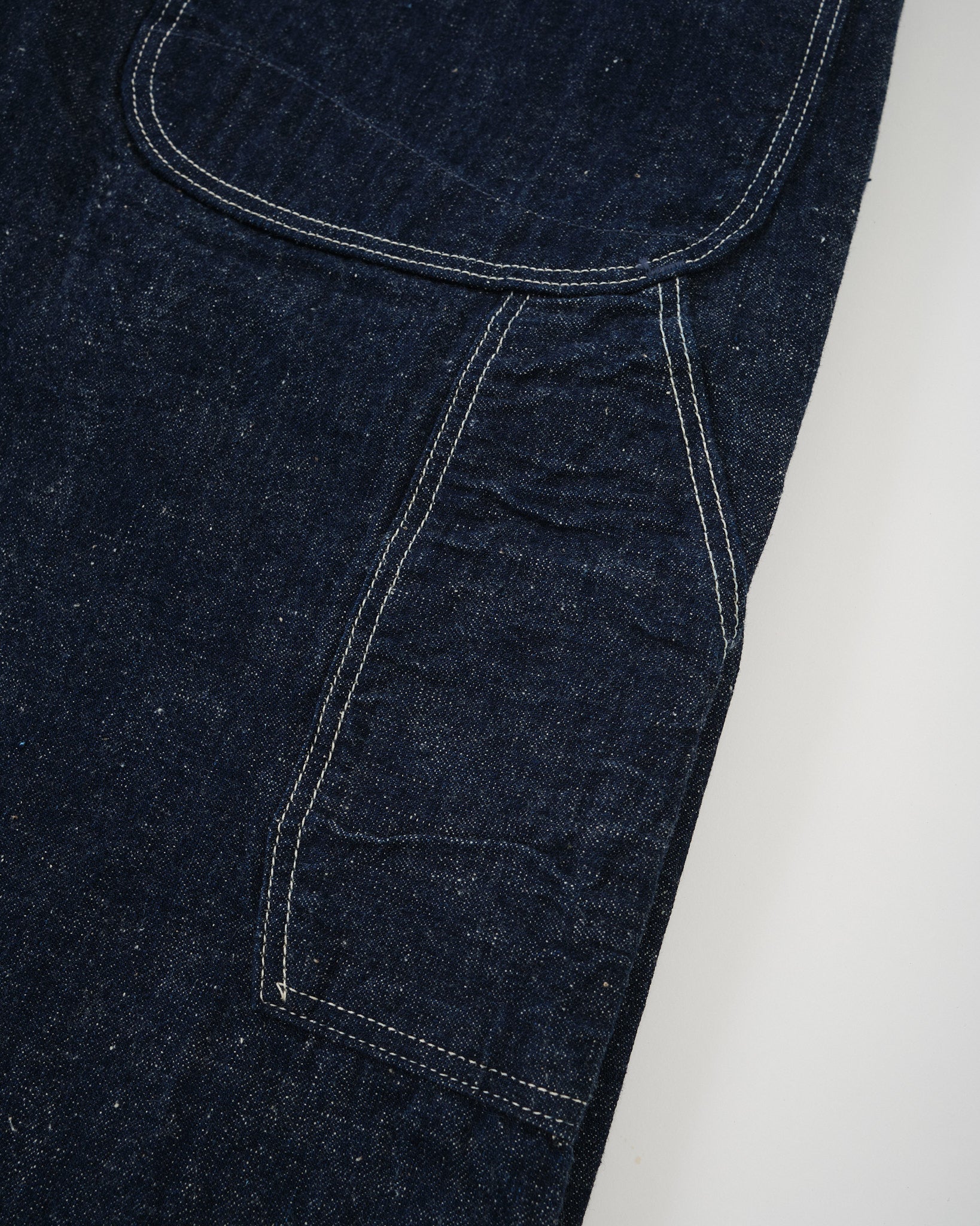 Il profondo colore indaco, ottenuto tramite il distintivo trattamento "one wash" di orSlow, fornisce un colore ricco che svilupperà una patina unica nel tempo, aggiungendo carattere al capo. Le cuciture bianche a contrasto su tutto il capo complementano la tonalità indaco, evidenziando i dettagli costruttivi dei pantaloni.