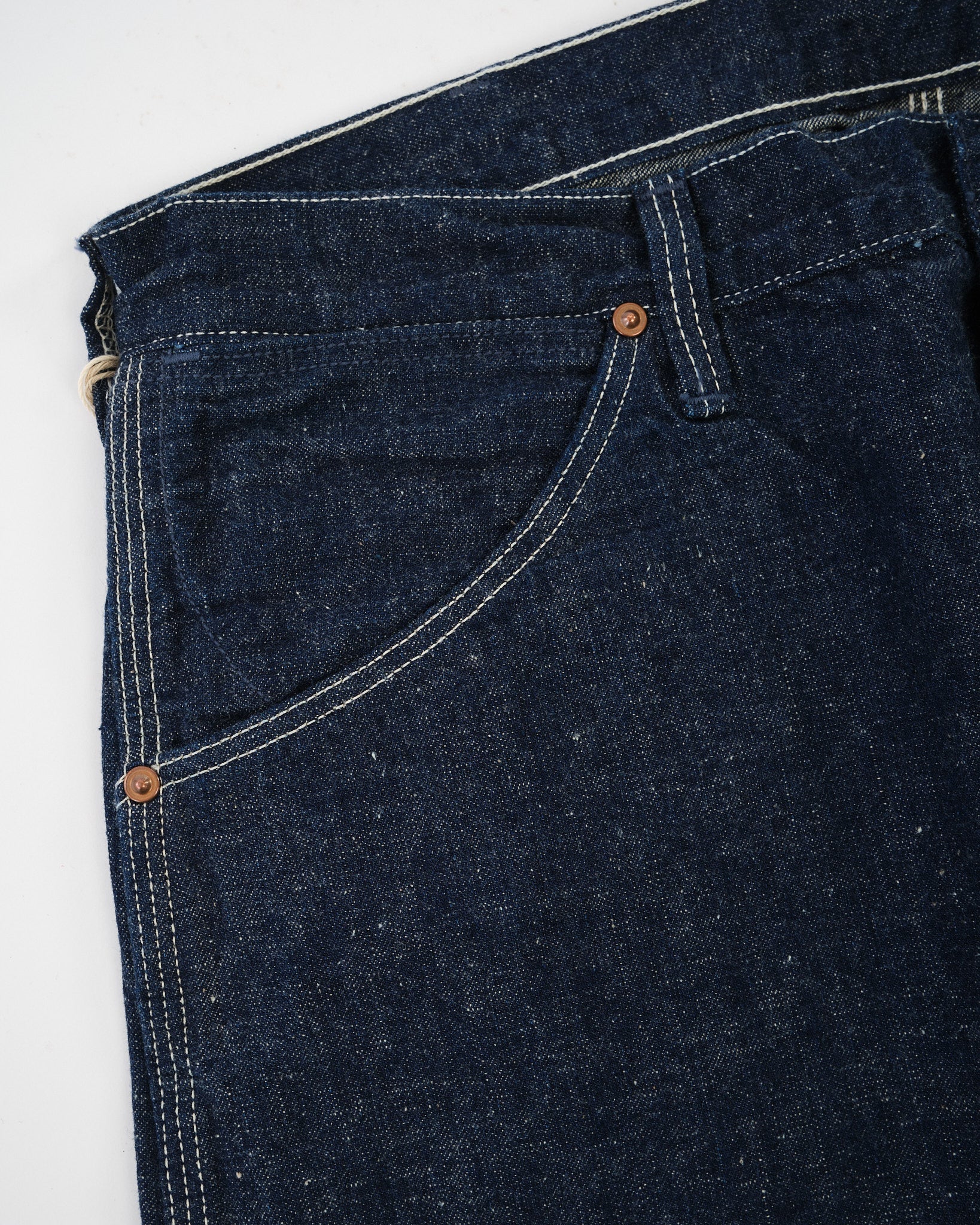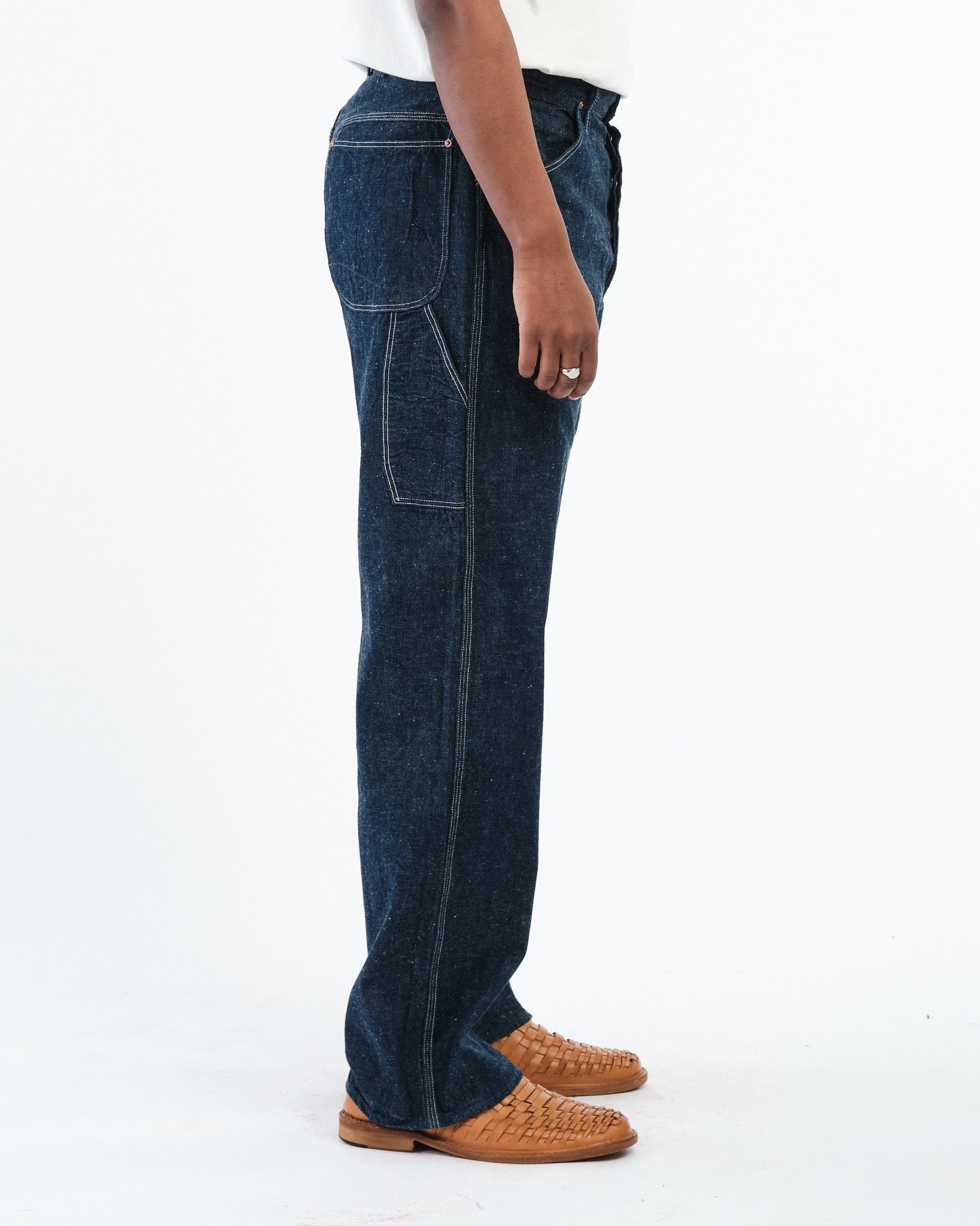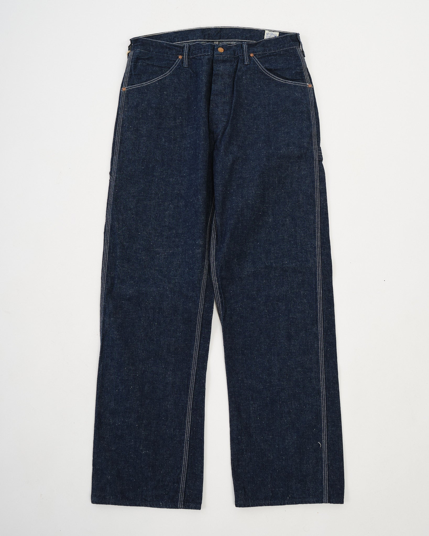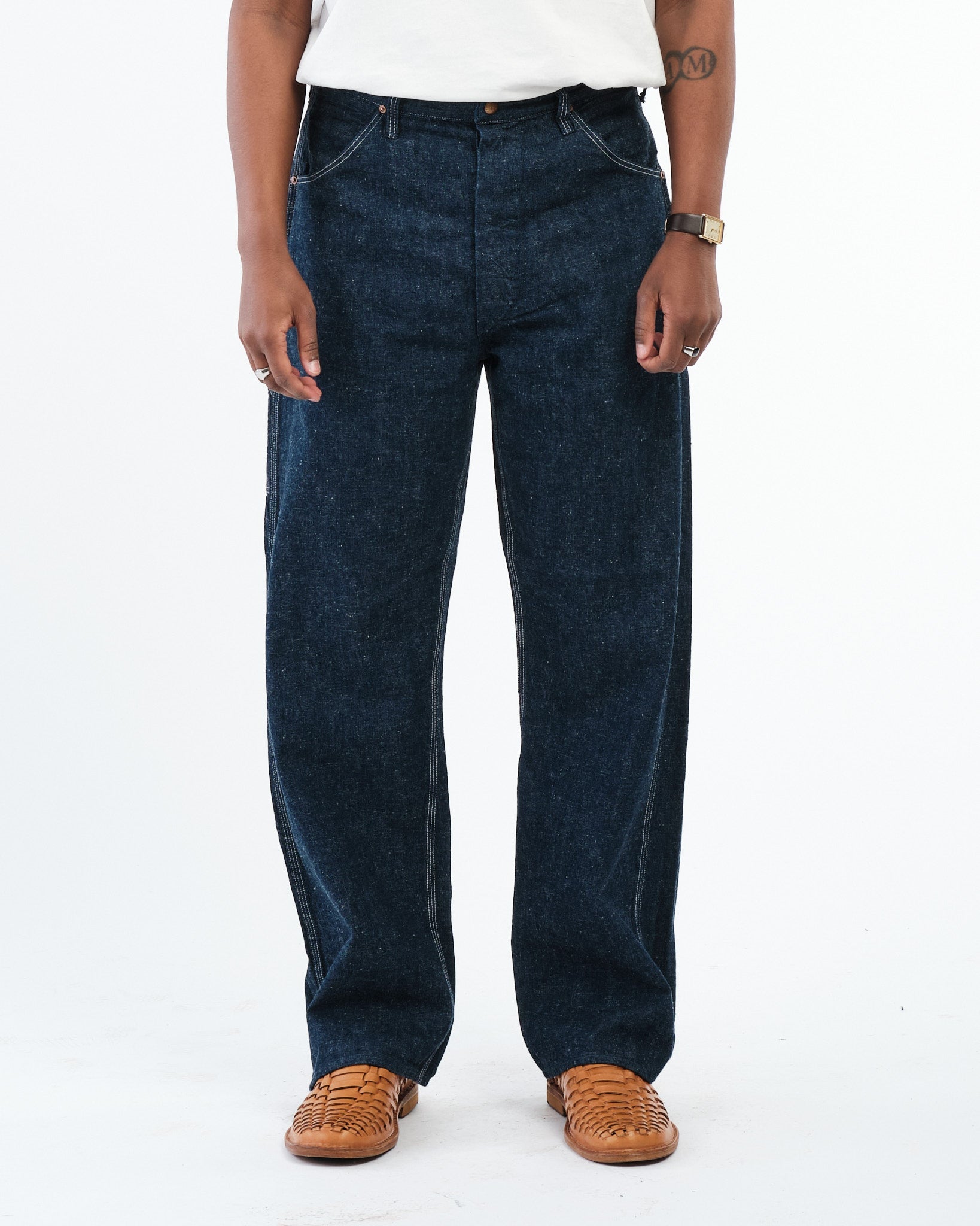 Il profondo colore indaco, ottenuto tramite il distintivo trattamento "one wash" di orSlow, fornisce un colore ricco che svilupperà una patina unica nel tempo, aggiungendo carattere al capo. Le cuciture bianche a contrasto su tutto il capo complementano la tonalità indaco, evidenziando i dettagli costruttivi dei pantaloni.