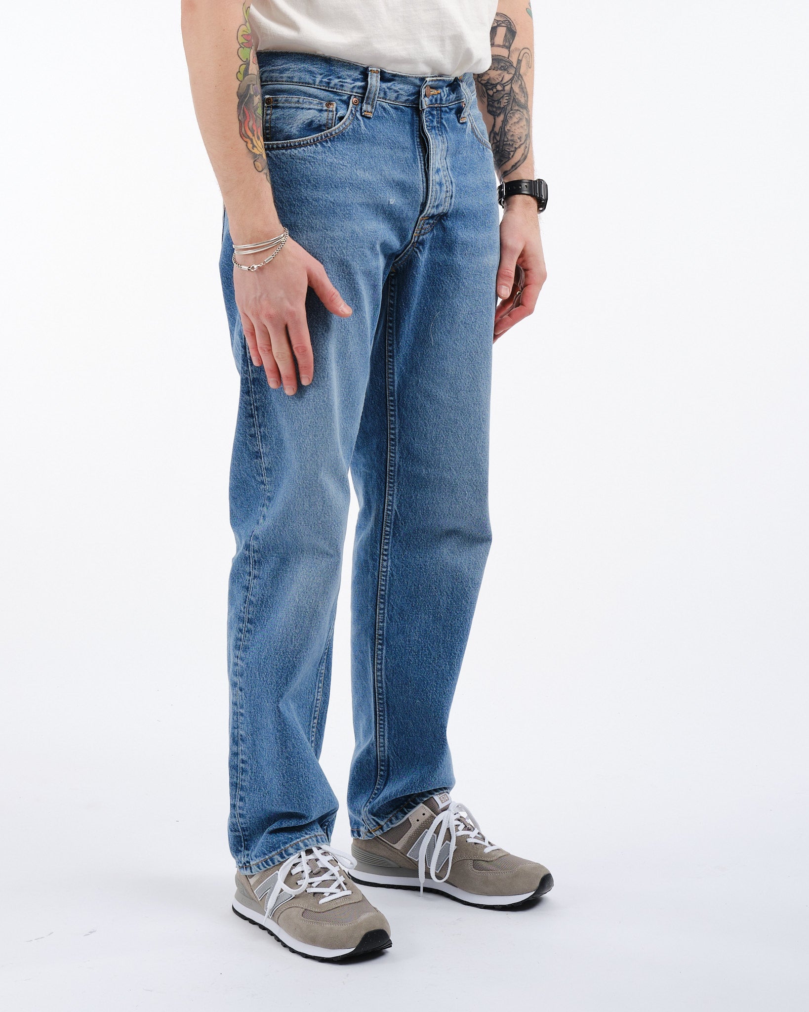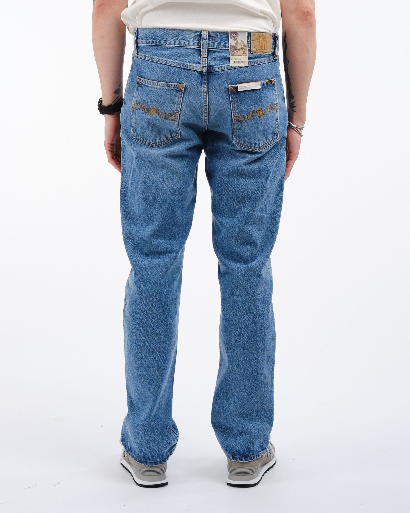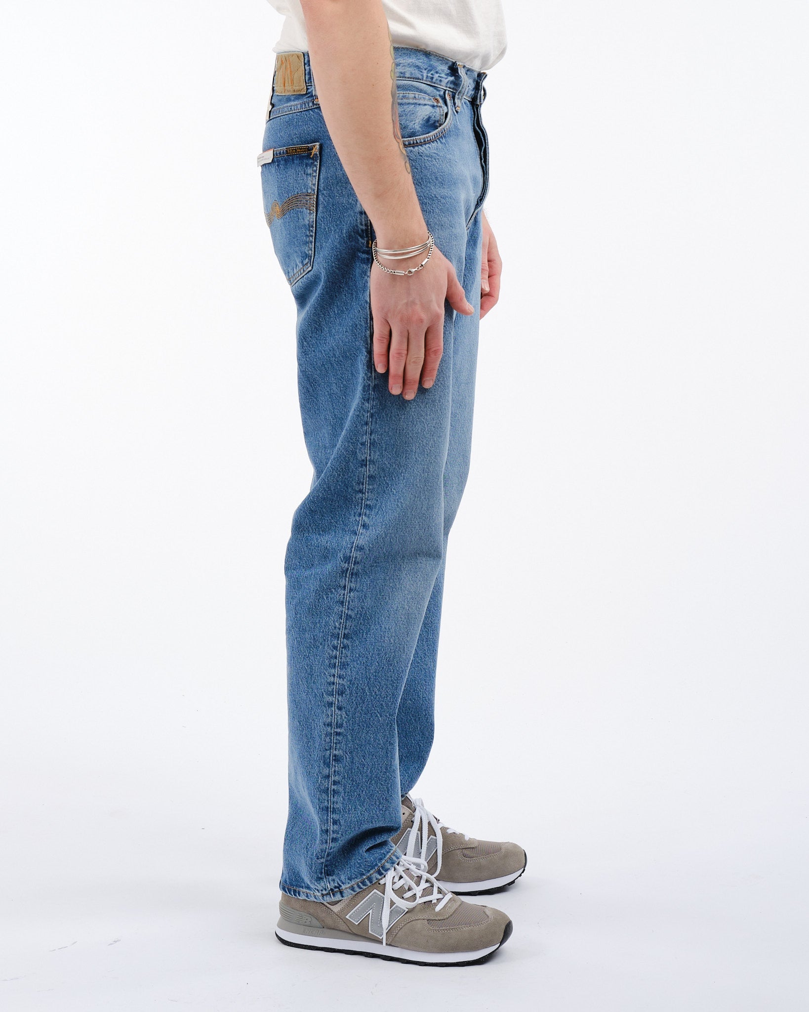Esplora il mondo blu di Rad Rufus Indigo Blues di Nudie Jeans Co. Questi jeans sono fatti in cotone e vantano un robusto denim rigido da 14.9 oz. che non solo garantisce longevità ma sviluppa anche un fascino unico con ogni utilizzo. Rimanendo fedeli allo stile denim senza tempo, presentano fili di colore tabacco, dettagli in rame e una chiusura con bottoni, il tutto legato insieme da una toppa in jacron che simboleggia l'artigianalità. La vita alta e il taglio dritto delle gambe offrono una forma elegante rendendo questi jeans un elemento essenziale versatile, per qualsiasi guardaroba.