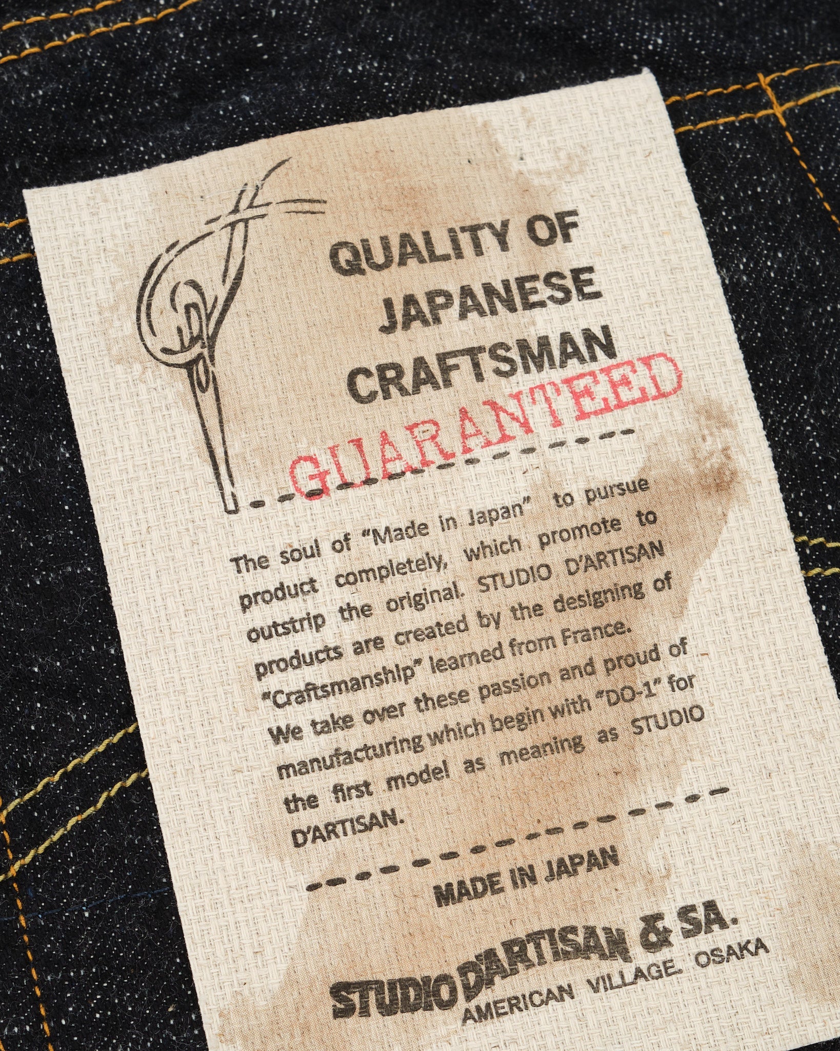 Ogni aspetto del denim—numero di filo, texture irregolare, profondità della tintura a corda e densità della tessitura—è stato meticolosamente rifinito utilizzando le tecniche proprietarie di D'Artisan. Questo processo garantisce un tessuto con carattere ricco, profondità e variazioni naturali, che ricorda l'abbigliamento da lavoro classico delle passate generazioni.