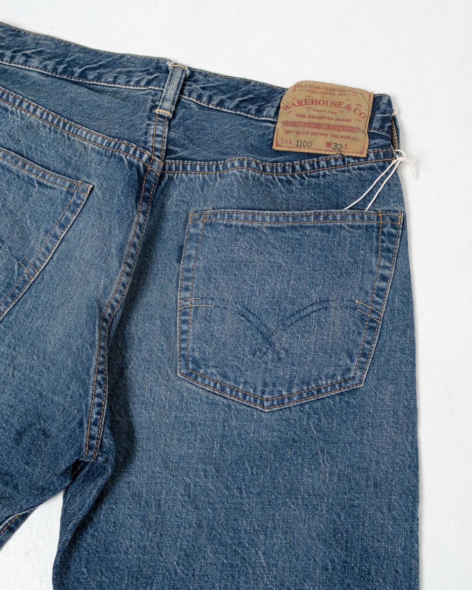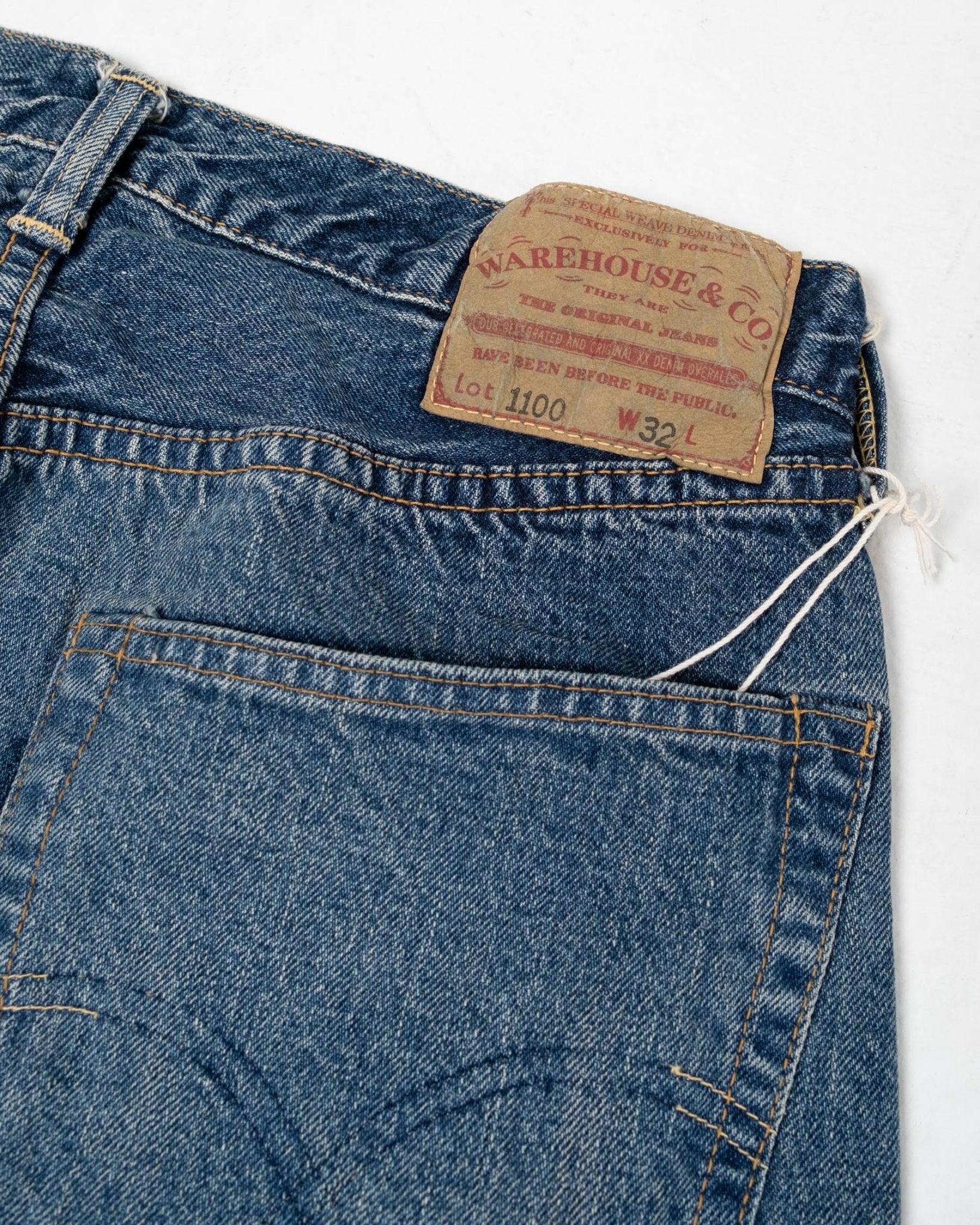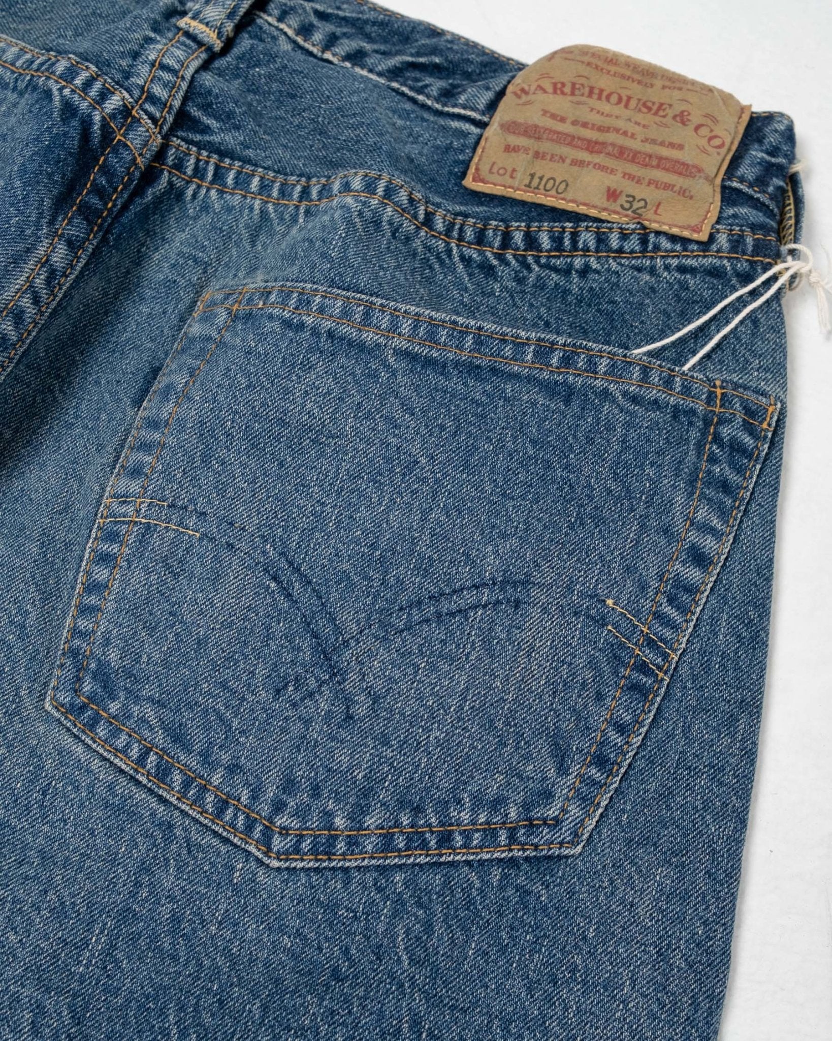 Second Hand 1100 Usato Lavato dal Magazzino & Co. Questo è uno dei fit distintivi di Warehouse. È un denim sanforizzato da 12 oz che è stato lavato per ottenere un bel look vintage usato, oltre al fatto che ti solleva da tutti i problemi di restringimento. Questo paio si basa su un modello degli anni '70 con il marchio di fabbrica Warehouse arancione selvaggio qui in una silhouette moderna e bella. Prodotto in Giappone.