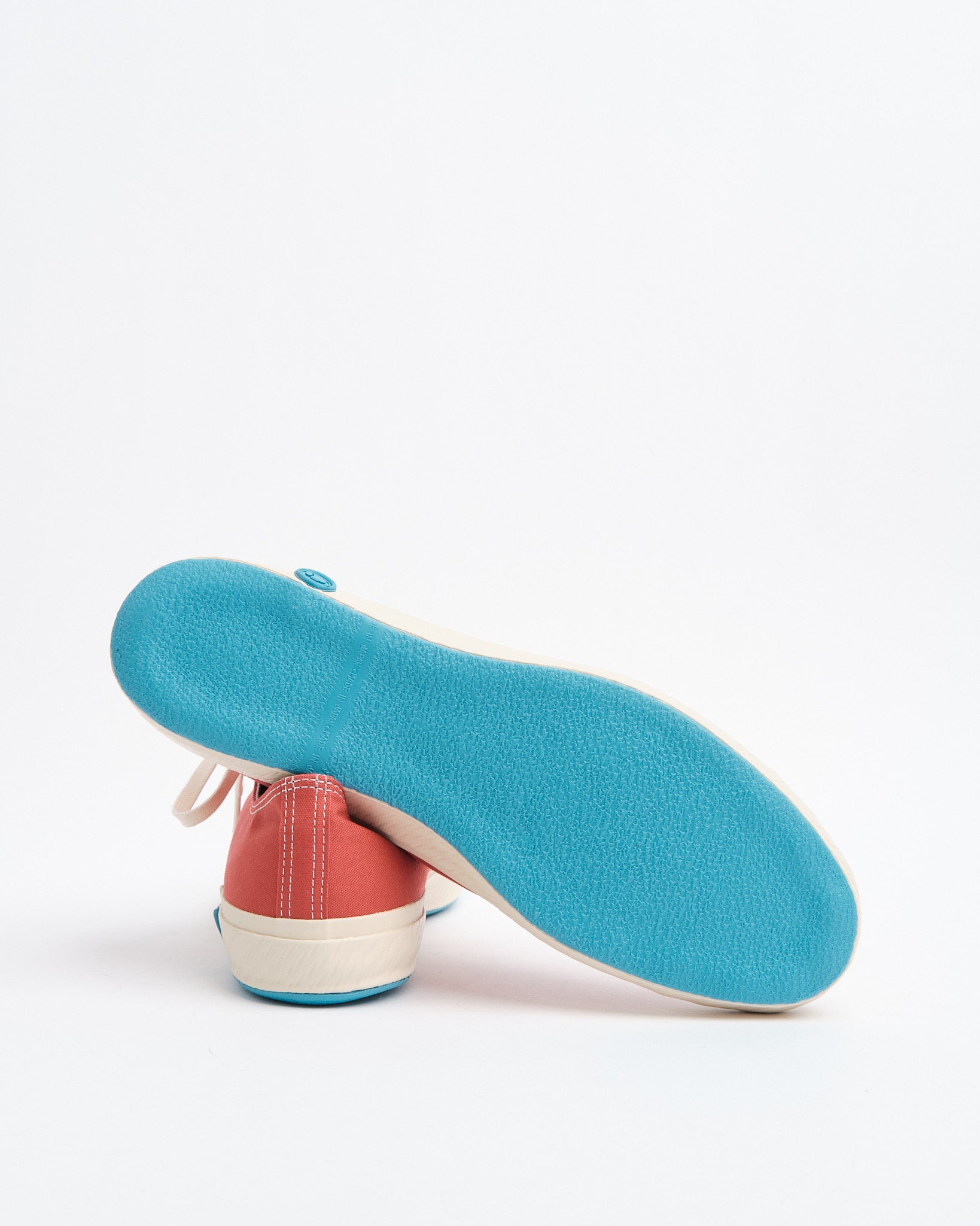 The deep JP Red canvas upper is woven in Japan and paired with a clean white rubber sole for a sharp, heritage-inspired contrast. The result is a timeless low-top silhouette that feels authentic rather than nostalgic. Subtle details like the hand-stamped blue heel logo and reinforced toe cap reflect the brand’s dedication to traditional production methods.