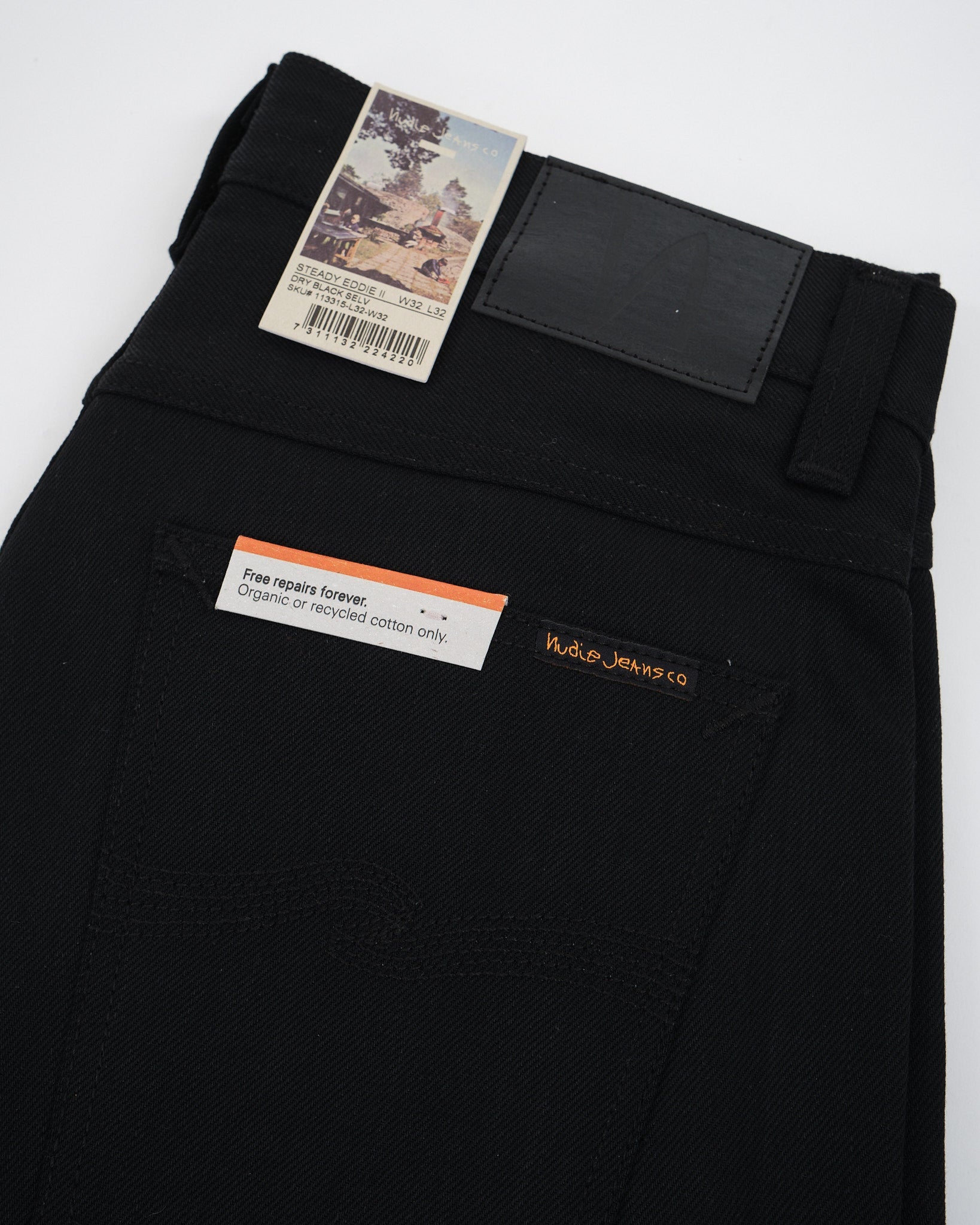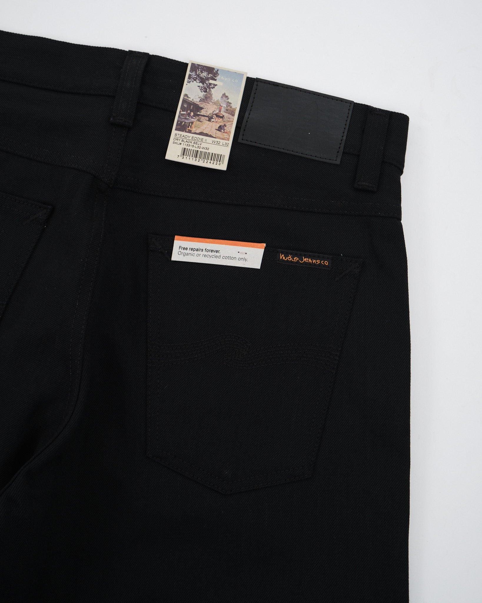 Scopri le sfumature dell'artigianato esperto con i Nudie Jeans Steady Eddie II Dry Black Selvage. Realizzati in denim selvaggio rigido giapponese da 14,5 oz dei prestigiosi Kurabo Mills, questi jeans portano qualcosa di straordinario nel tuo guardaroba. L'ordito nero tinto in filo è progettato per sbiadire naturalmente nel tempo, mentre la trama 'rimani nero' mantiene il suo colore profondo, promettendo sbiaditure ad alto contrasto uniche per questo tessuto. Questo paio è perfetto per chi cerca comfort e un pezzo che invecchia con grazia, grazie alla sua vestibilità regolare, vita media e apertura della gamba slim.