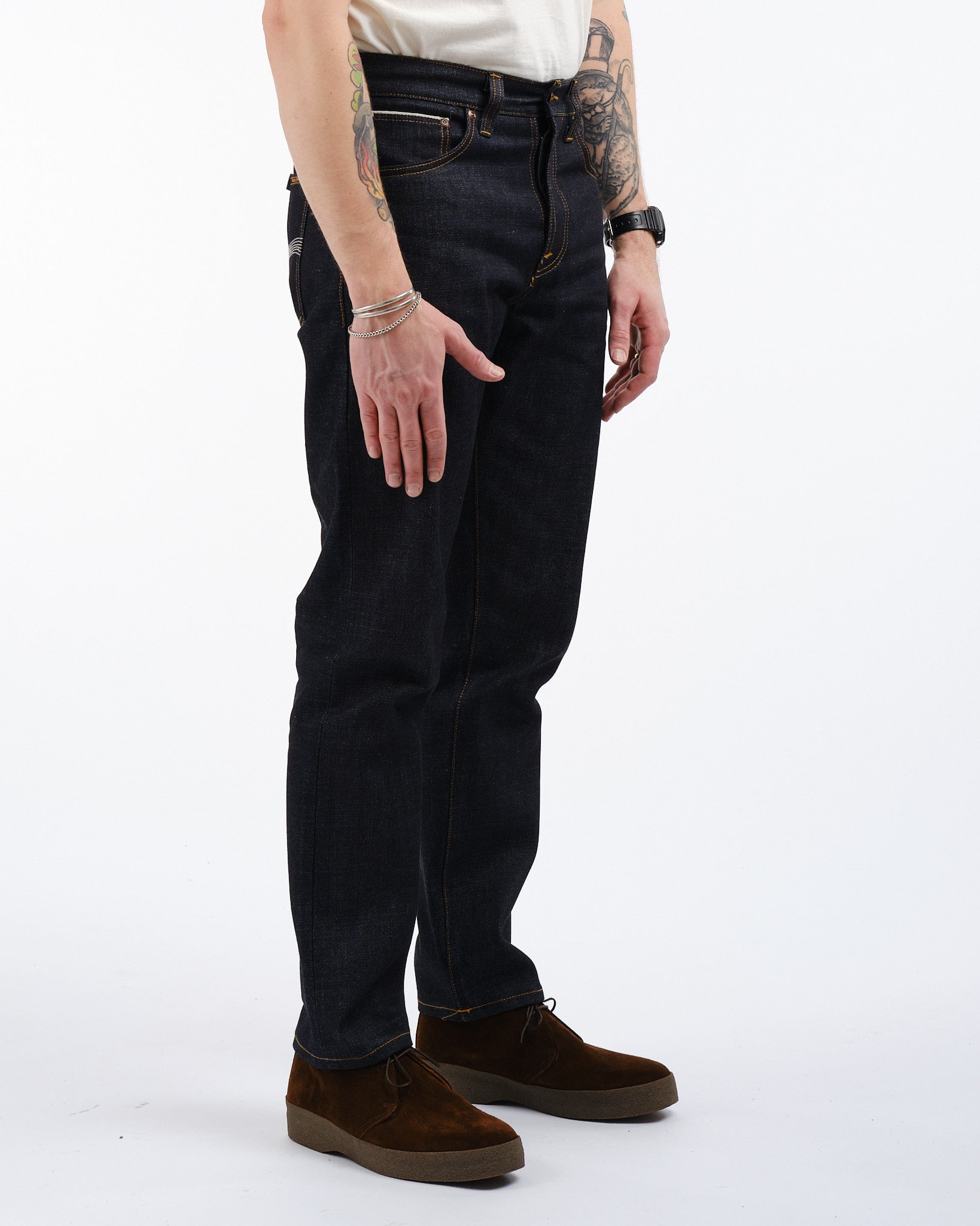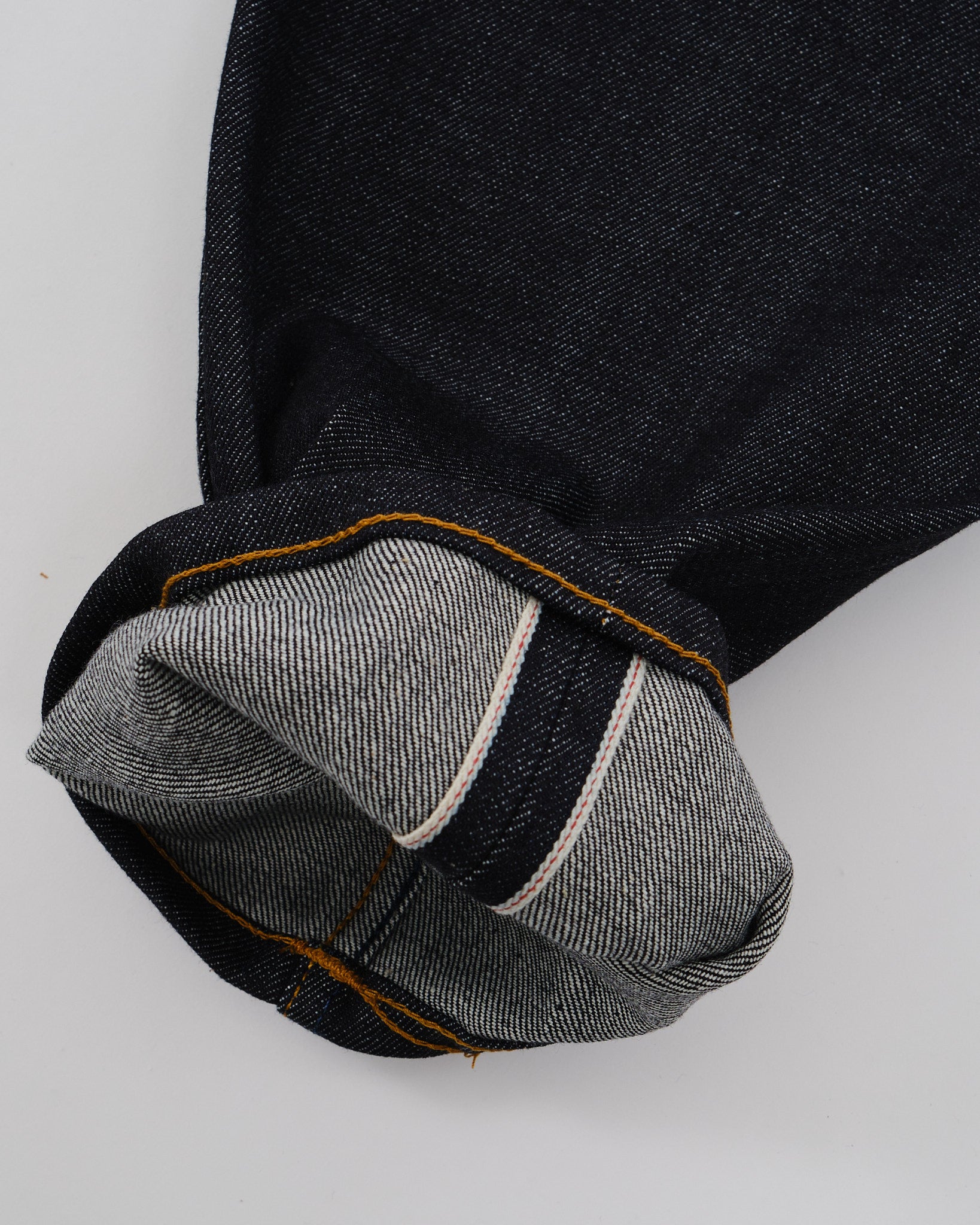 Denim Selvage Giapponese di Alta Qualità: Realizzato in denim selvage rigido da 13 oz., proveniente da Shinya, Giappone, noto per le sue eccezionali qualità di invecchiamento.