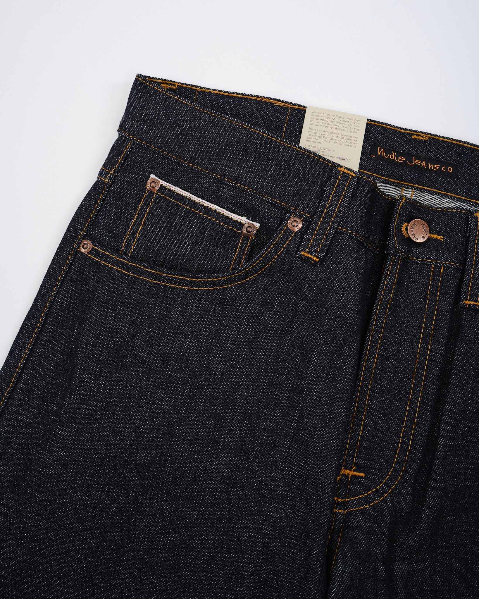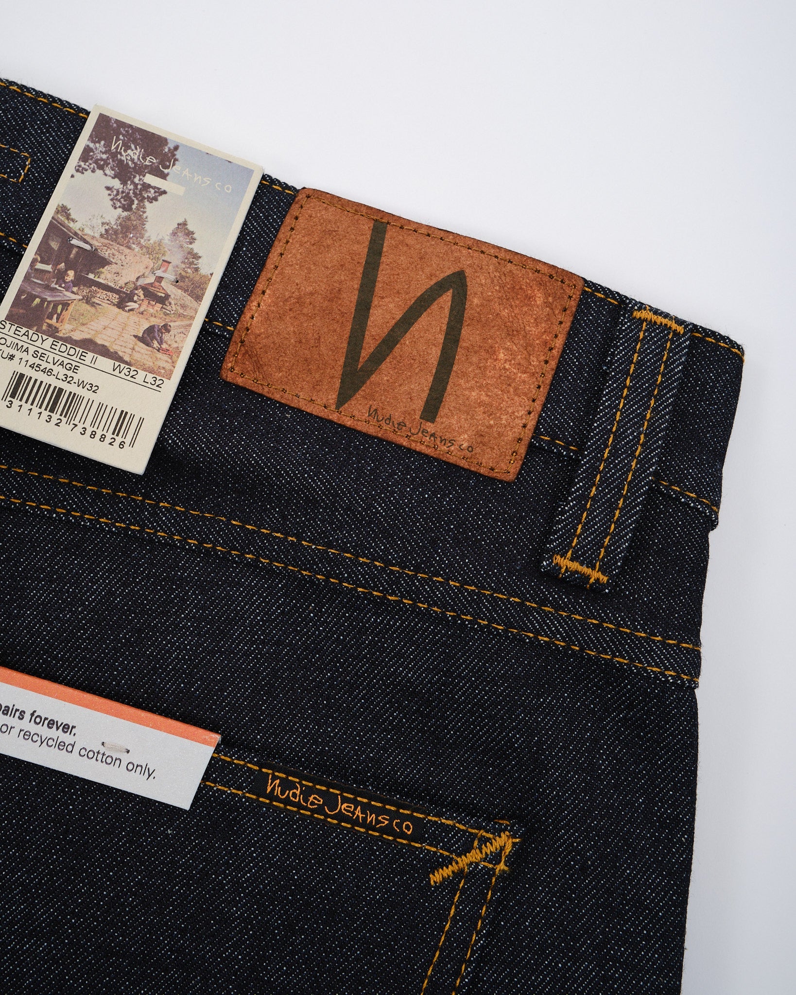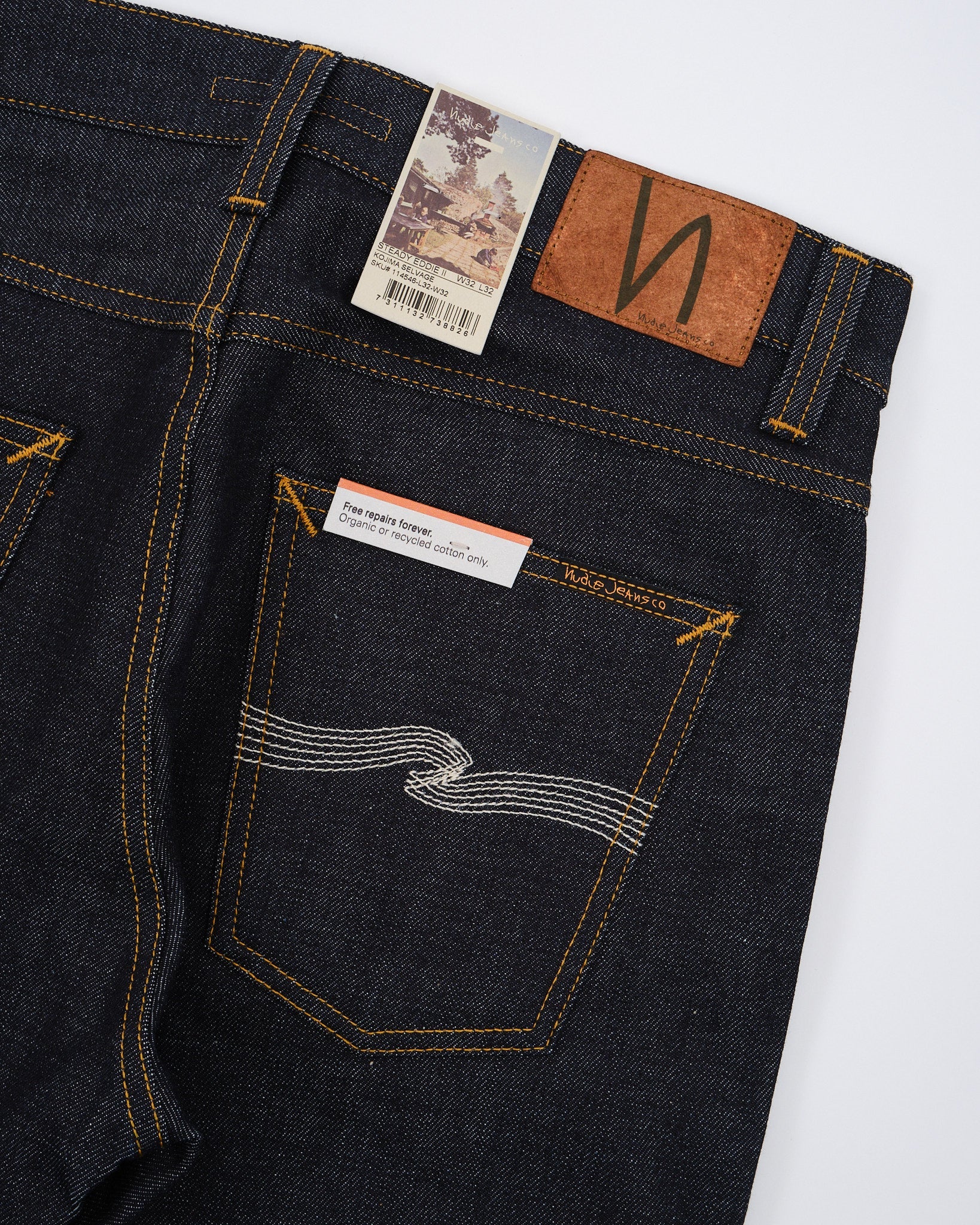 Scopri l'arte esposta nei jeans Steady Eddie II Kojima Selvage di Nudie Jeans Co. Questi jeans sono meticolosamente realizzati in cotone. Caratterizzati da 13 oz. di denim selvaggio rigido proveniente da Shinya, Giappone. Incarnano qualità e stile. Il denim giapponese di alta qualità è adornato con cuciture tabacco e, ricamo bianco sporco sulla tasca posteriore che evidenzia la sua capacità di invecchiare magnificamente nel tempo. La tonalità indaco scuro, con un sottotono rossastro, tessuta su telai shuttle vintage, mostra l'intricata maestria dietro questi jeans. Con un design che vanta una vita media e una gamba affusolata, offrono sia comfort che una silhouette snella con la loro apertura di gamba stretta. Ogni paio è completo di rifiniture in rame, una mosca con bottone e una patch autentica in Jacron che simboleggia durabilità e autenticità.