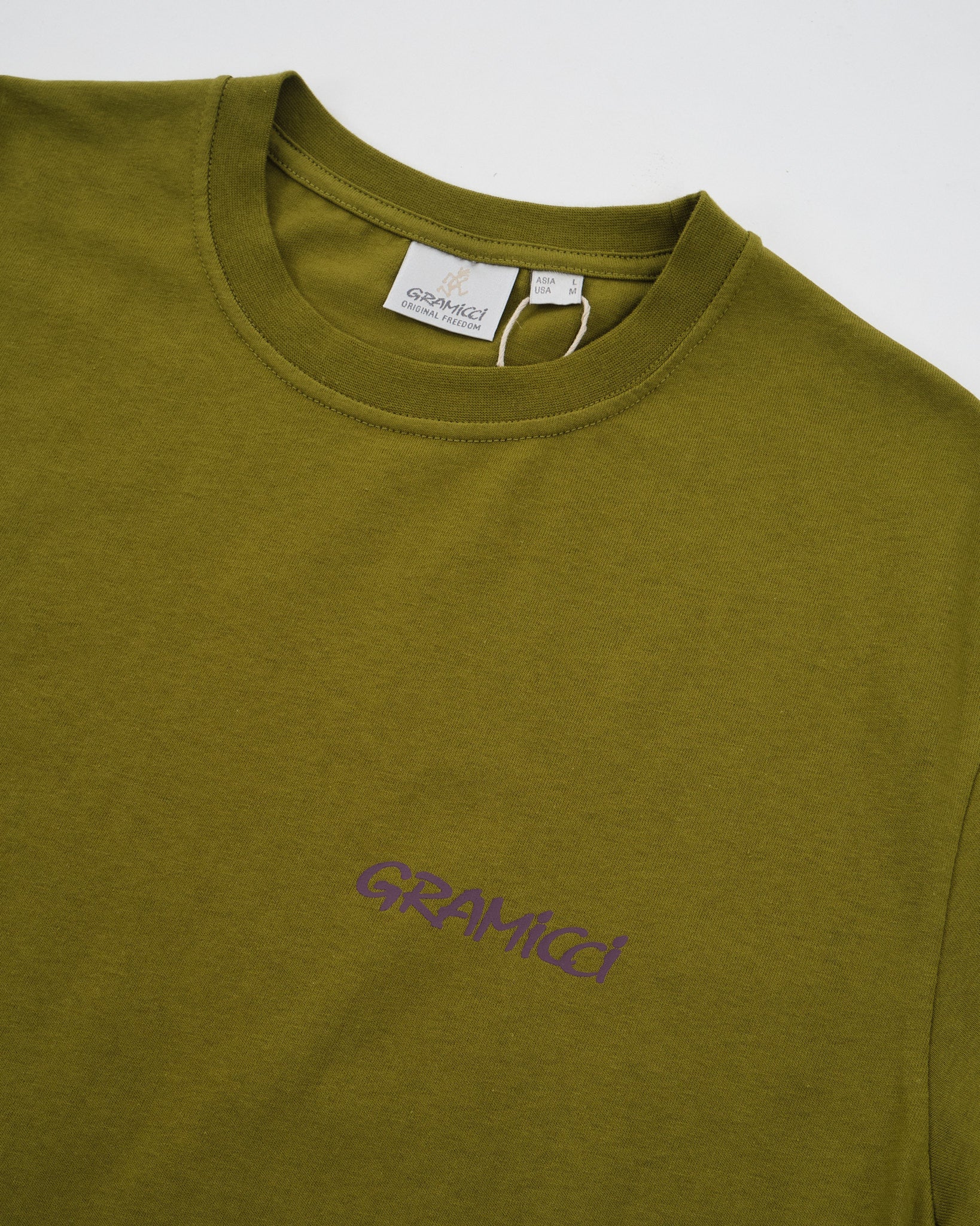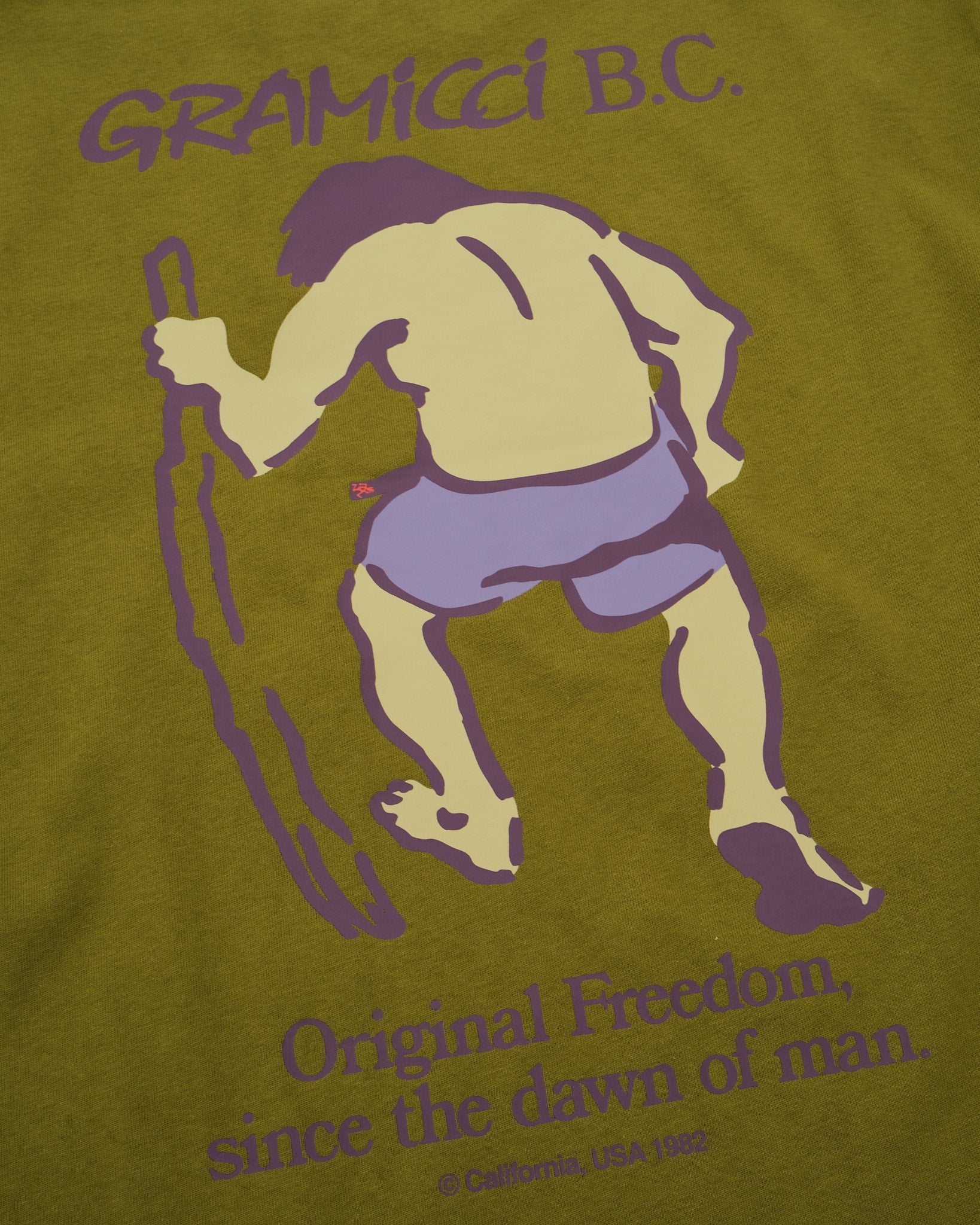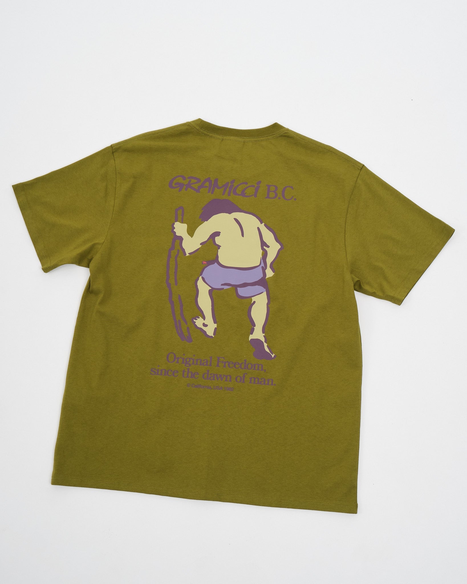 Presentiamo la maglietta G3FU-T070 B.C. di Gramicci - una maglietta casual e comoda progettata per offrire comfort pur facendo una dichiarazione. Realizzata in 100% Cotone Jersey Biologico, questa maglietta vanta un tessuto a tocco secco che ti mantiene comodo tutto il giorno. Presenta il logo Gramicci sul petto sinistro e una grafica divertente sul retro che rende omaggio all'etos del marchio di "Libertà Originale dall'alba dell'uomo."