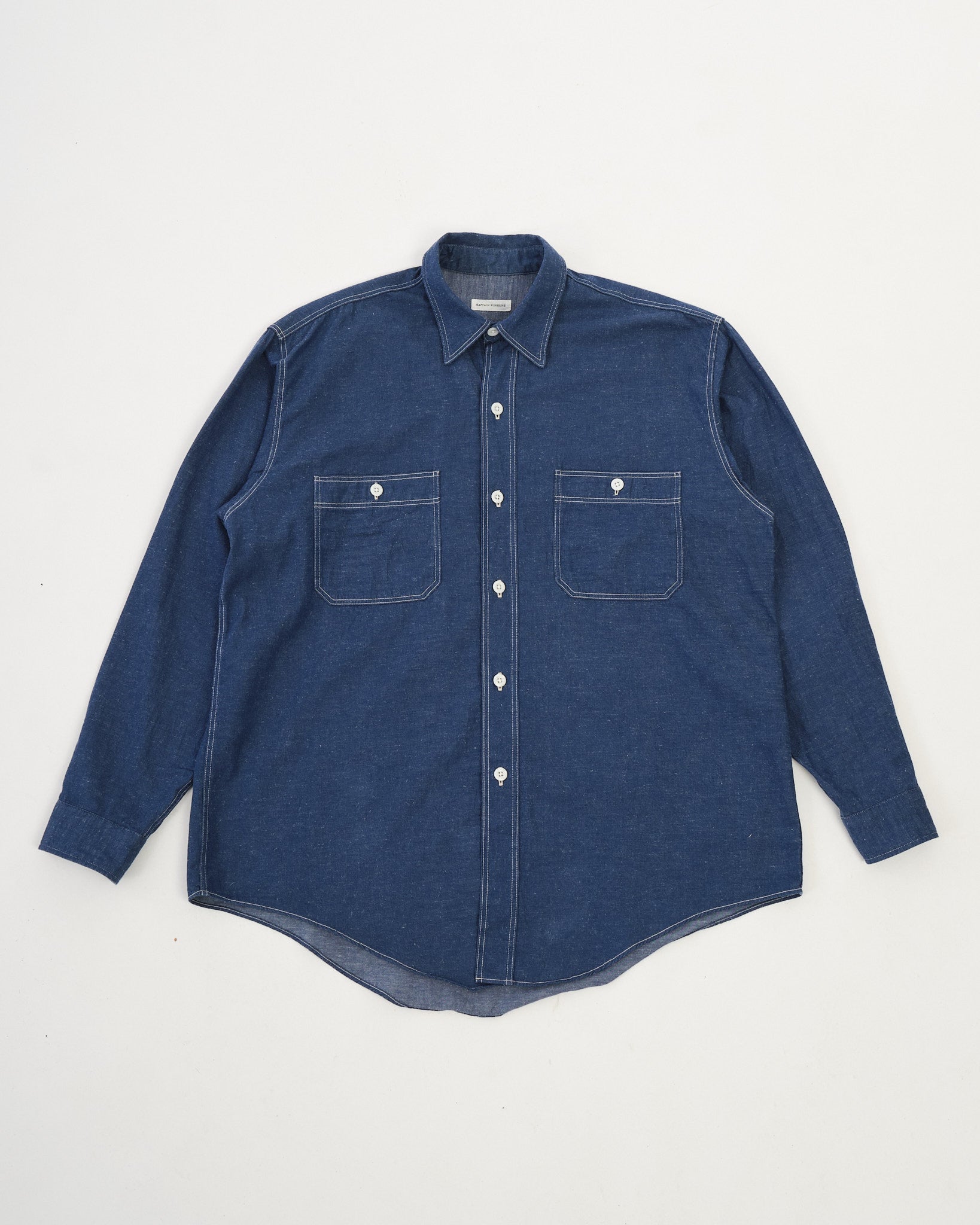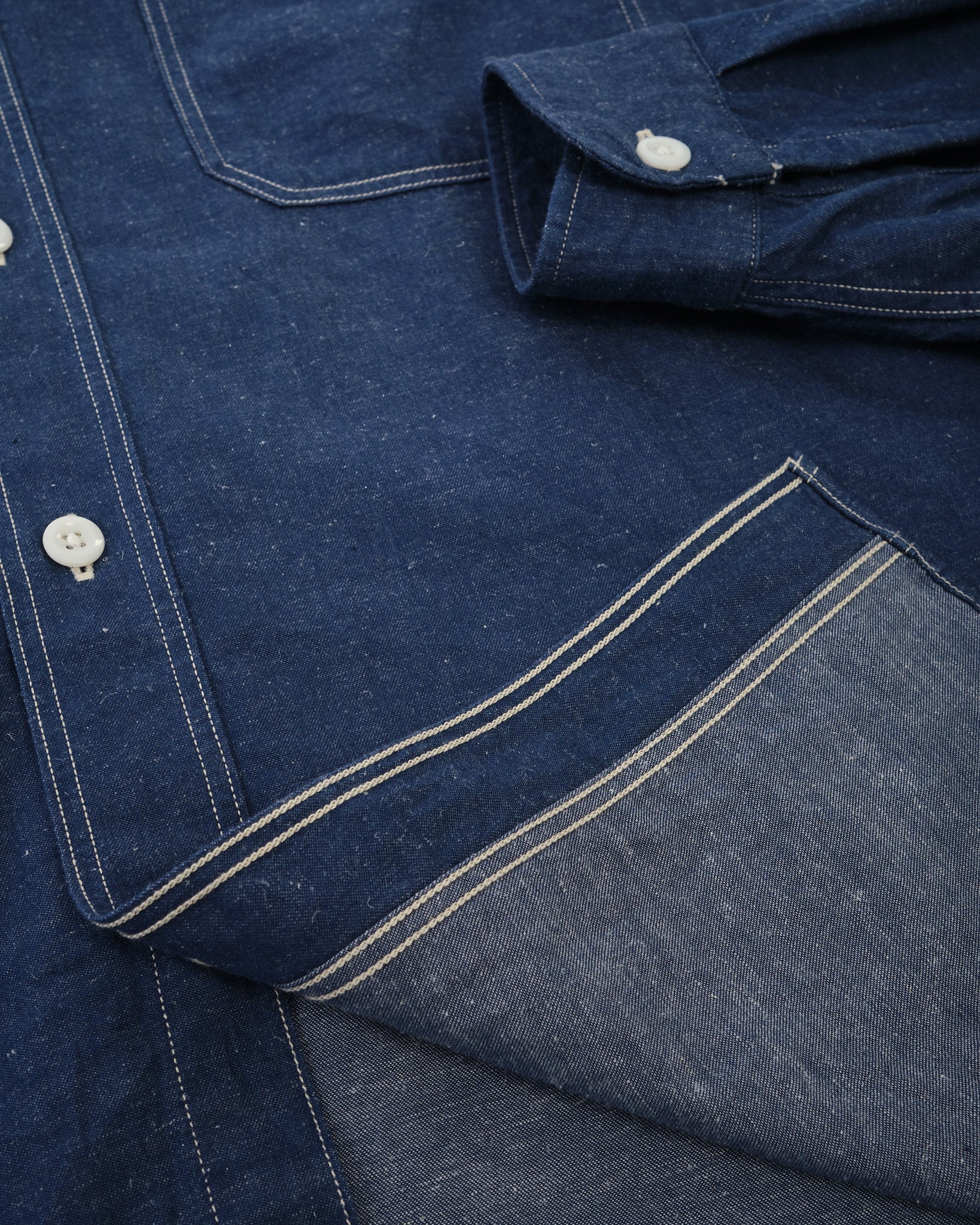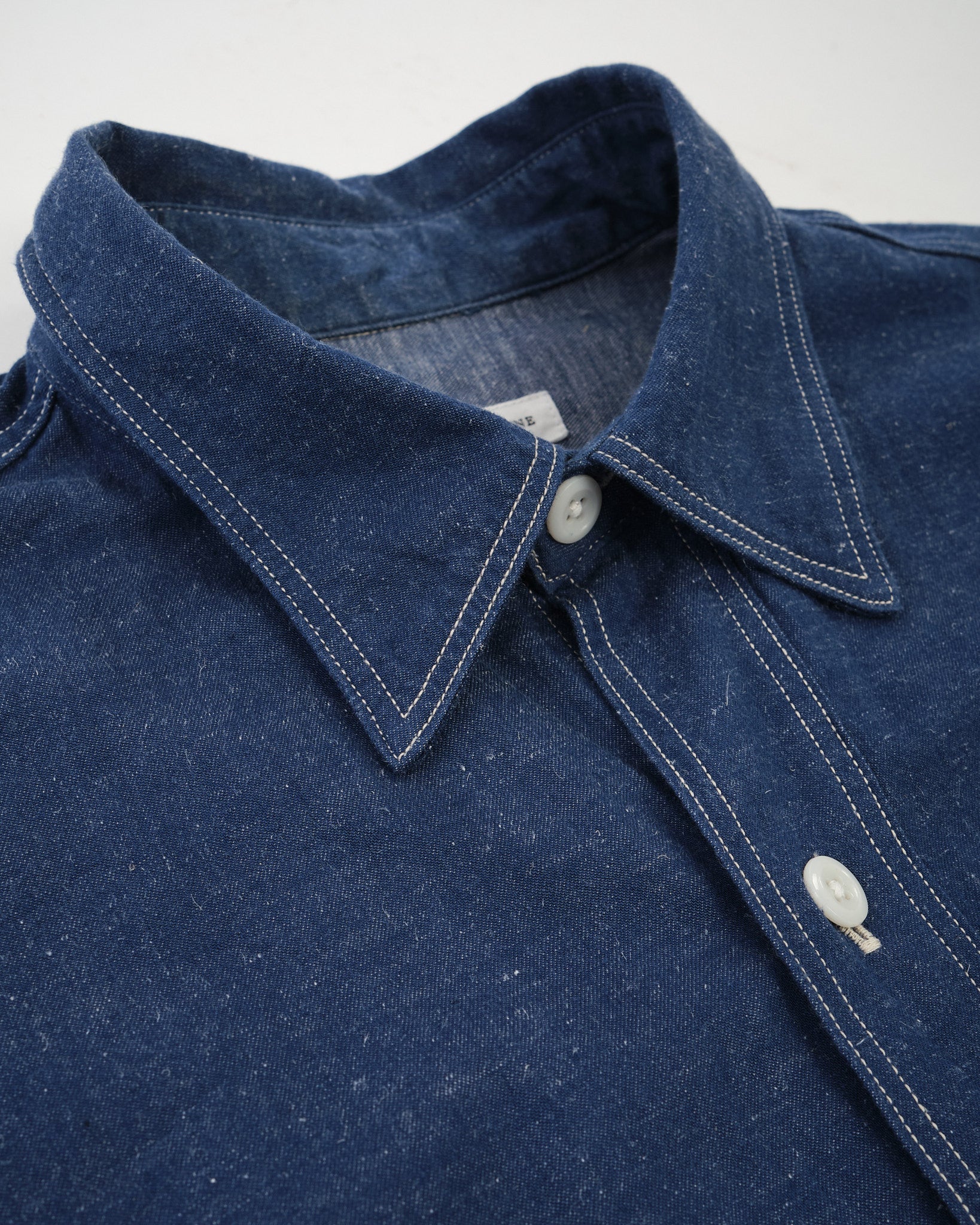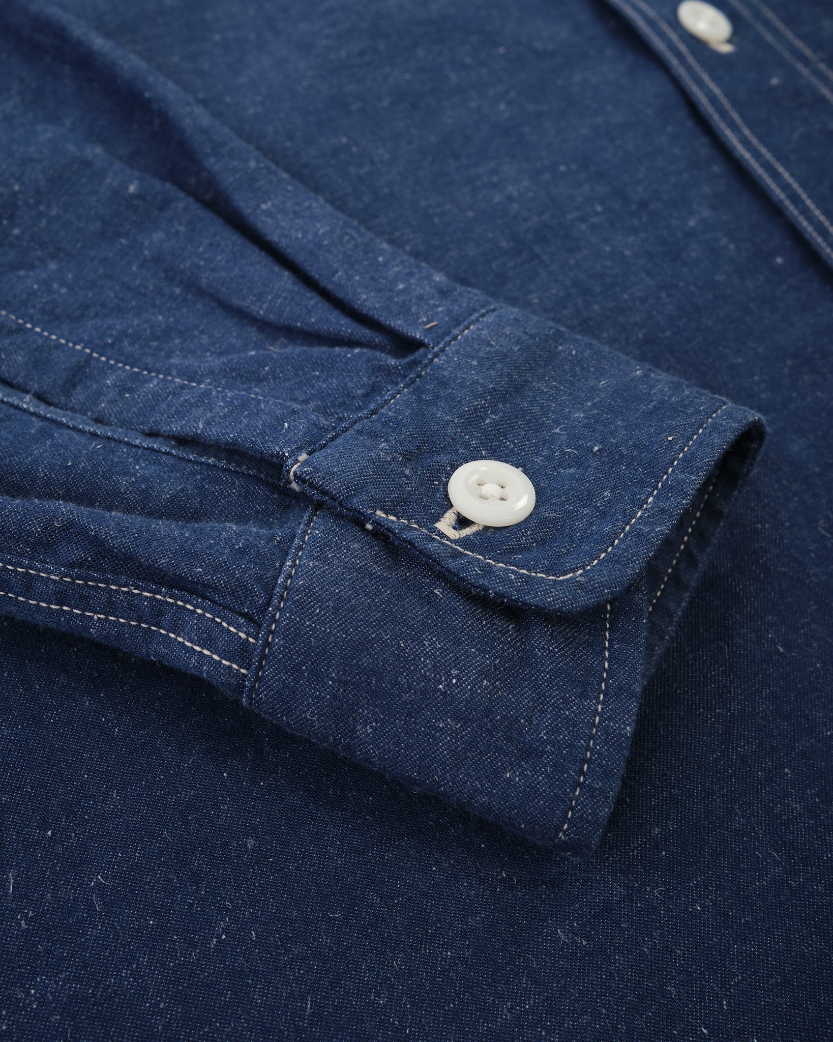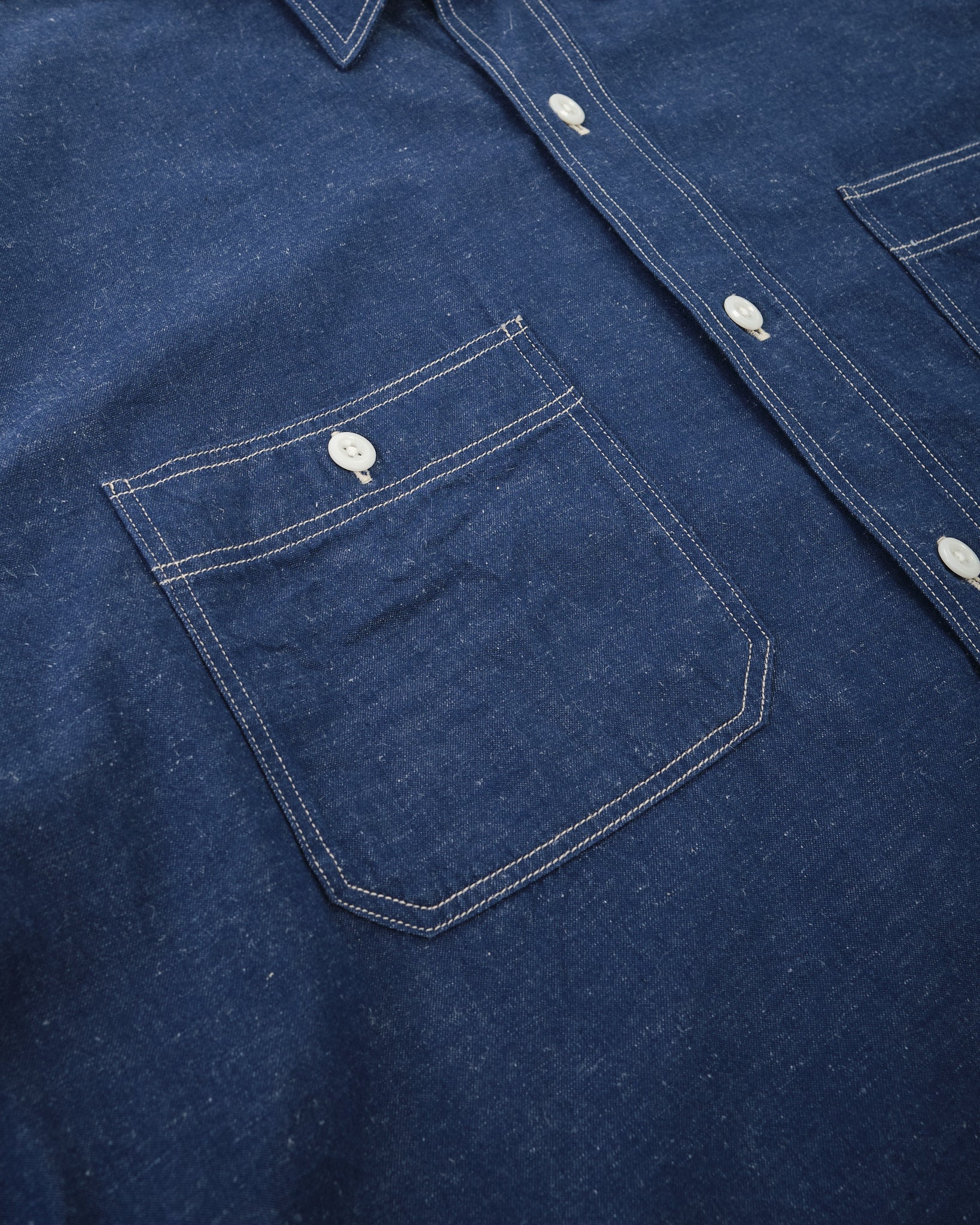 La Camicia da Lavoro KAPTAIN SUNSHINE (KSBSSH03) in Blu Indaco è un esempio sorprendente di abbigliamento da lavoro di alta qualità. Realizzata con una miscela di cotone a fibra lunga extra Suvin e canapa, il filo originale è tinto con indaco, offrendo un colore ricco e profondo che invecchia magnificamente nel tempo. Questo tessuto è tessuto con alta densità su un vecchio telaio a navetta, incorporando lentamente aria nella trama per aggiungere texture e durabilità. Il risultato è un materiale che non solo ha un bell'aspetto ma evolve con l'uso, diventando ancora più unico col passare del tempo.