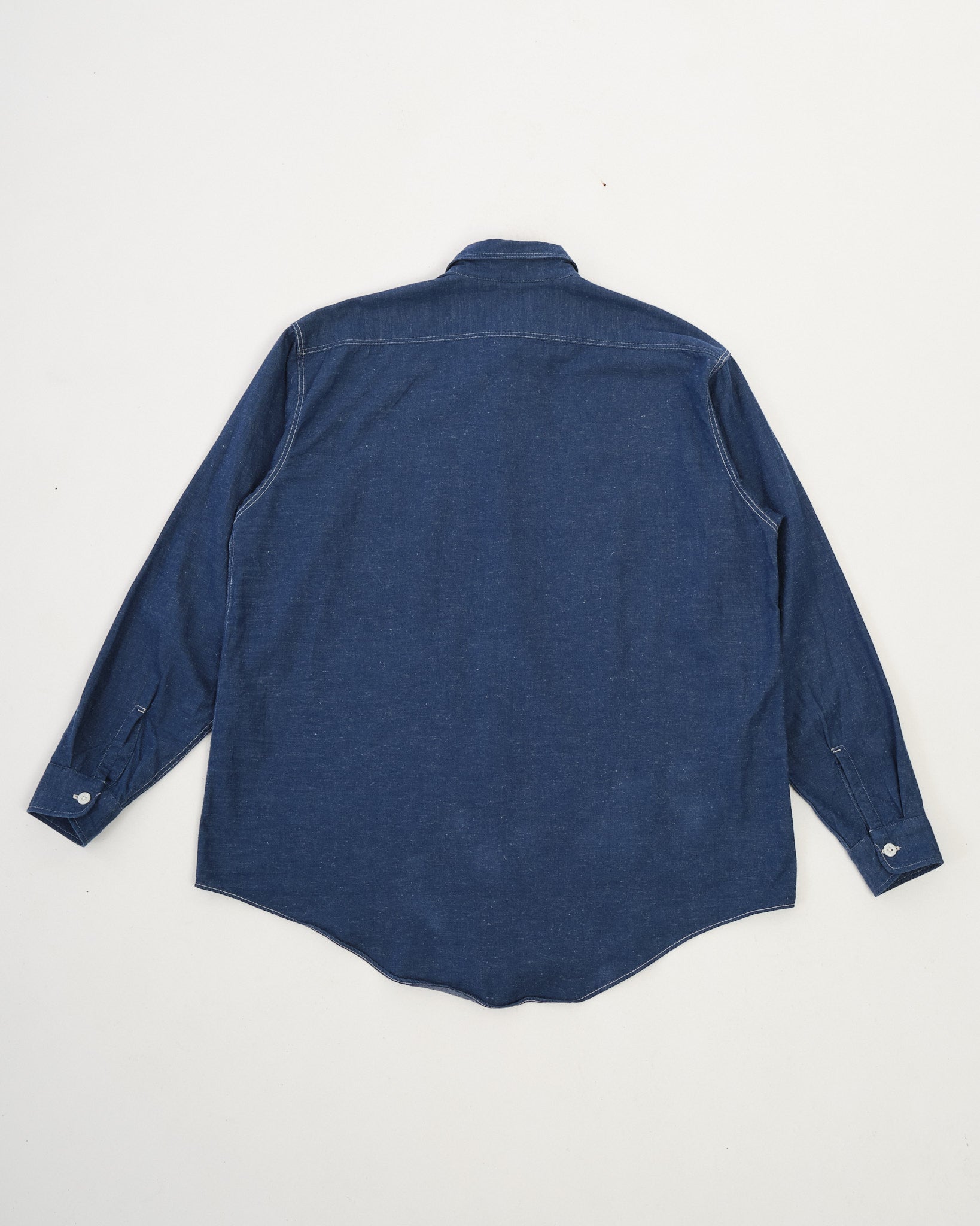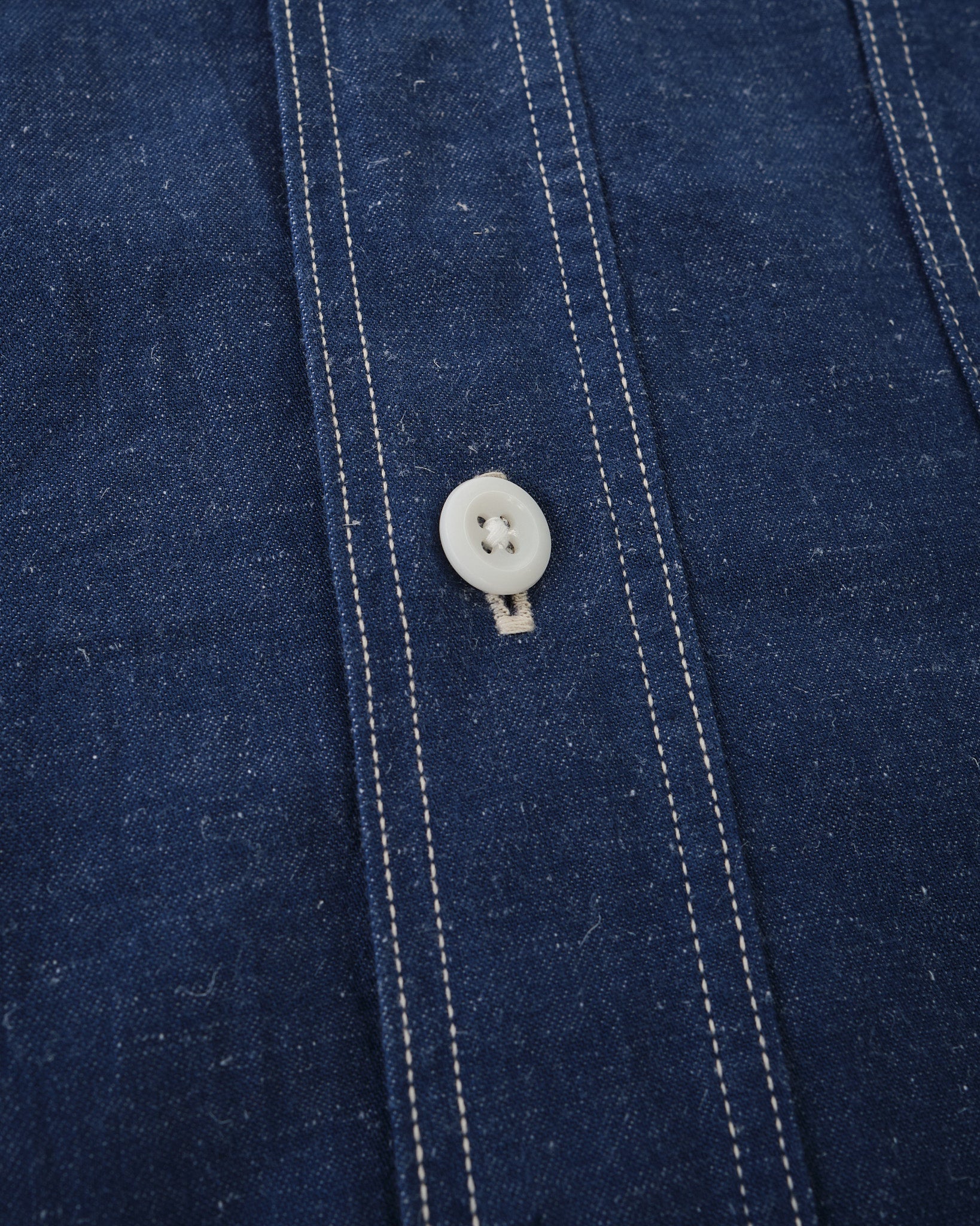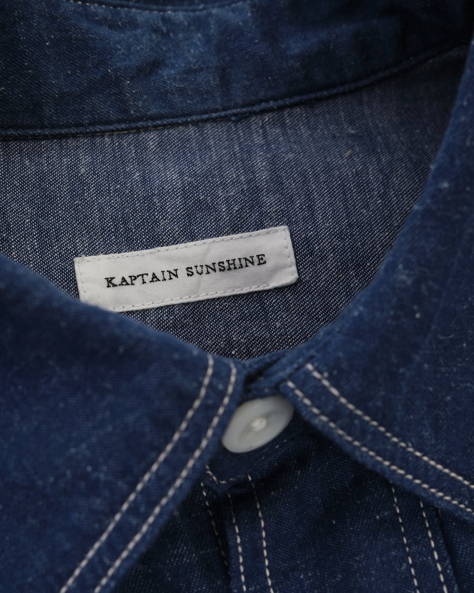 La Camicia da Lavoro KAPTAIN SUNSHINE (KSBSSH03) in Blu Indaco è un esempio sorprendente di abbigliamento da lavoro di alta qualità. Realizzata con una miscela di cotone a fibra lunga extra Suvin e canapa, il filo originale è tinto con indaco, offrendo un colore ricco e profondo che invecchia magnificamente nel tempo. Questo tessuto è tessuto con alta densità su un vecchio telaio a navetta, incorporando lentamente aria nella trama per aggiungere texture e durabilità. Il risultato è un materiale che non solo ha un bell'aspetto ma evolve con l'uso, diventando ancora più unico col passare del tempo.